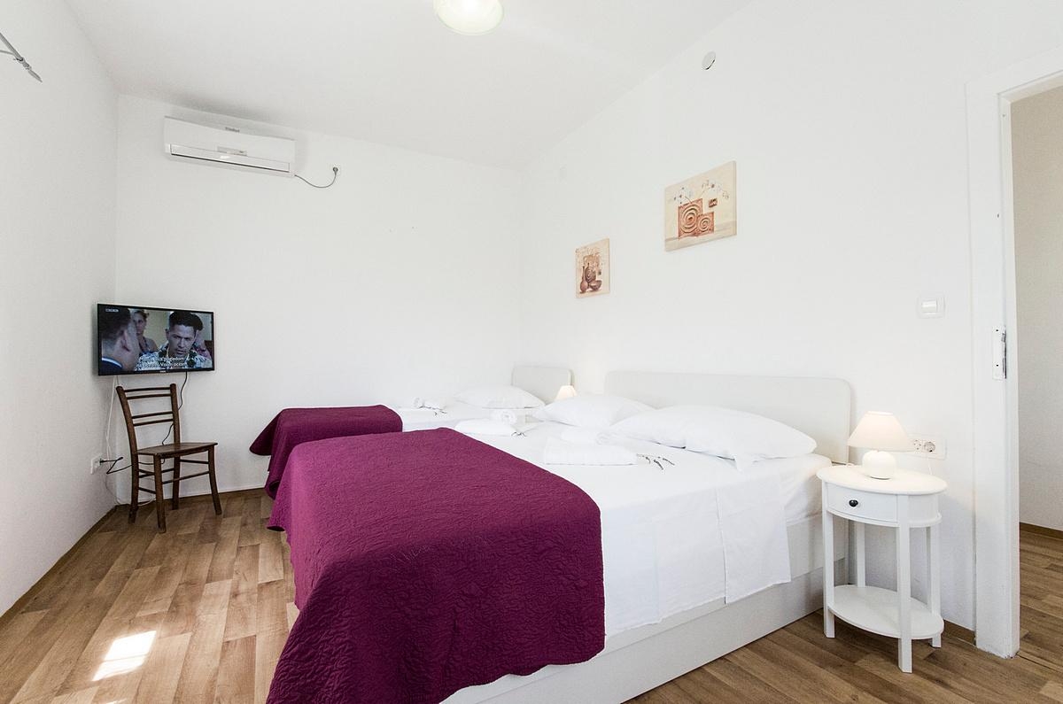 Dom może przyjąć 8 gości. Łóżka znajdują się w sypialniach, których jest 2, oraz w pokoju dziennym, na powierzchni 87m2. Goście mają dostęp do tarasu, by korzystać z ciepłych, letnich wieczorów. Z domu wakacyjnego roztacza się widok na morze. Możliwość przygotowywania posiłków poprzez korzystanie ze wspólnego grilla. W trakcie swojego pobytu goście mogą zrelakswować się w prywatnym basenie. Do kwatery można przyjechać ze zwierzęciem domowym, a usługa jest wliczona w cenę wynajęcia kwatery. Pomieszczenia rezerwowanej kwatery nie są połączone w jedną całość. WLICZONE W CENĘ: taksa pobytowa, sprzątanie końcowe, klimatyzacja, basen, parking, internet, zwierzęta domowe, łóżeczko dziecięce, dostawka, żelazko, deska do prasowania, suszarka do włosów, przenośny grill. Dostępność dodatkowych usług w rezerwowanym terminie oraz ich cenę (jeśli nie jest podana) należy sprawdzić wcześniej. Za dodatowe usługi, które nie zostały uwzględnione w kalkulacji ceny, płaci się bezpośrednio właścicielowi obiektu, pod warunkiem śe gość korzysta z tych usług.