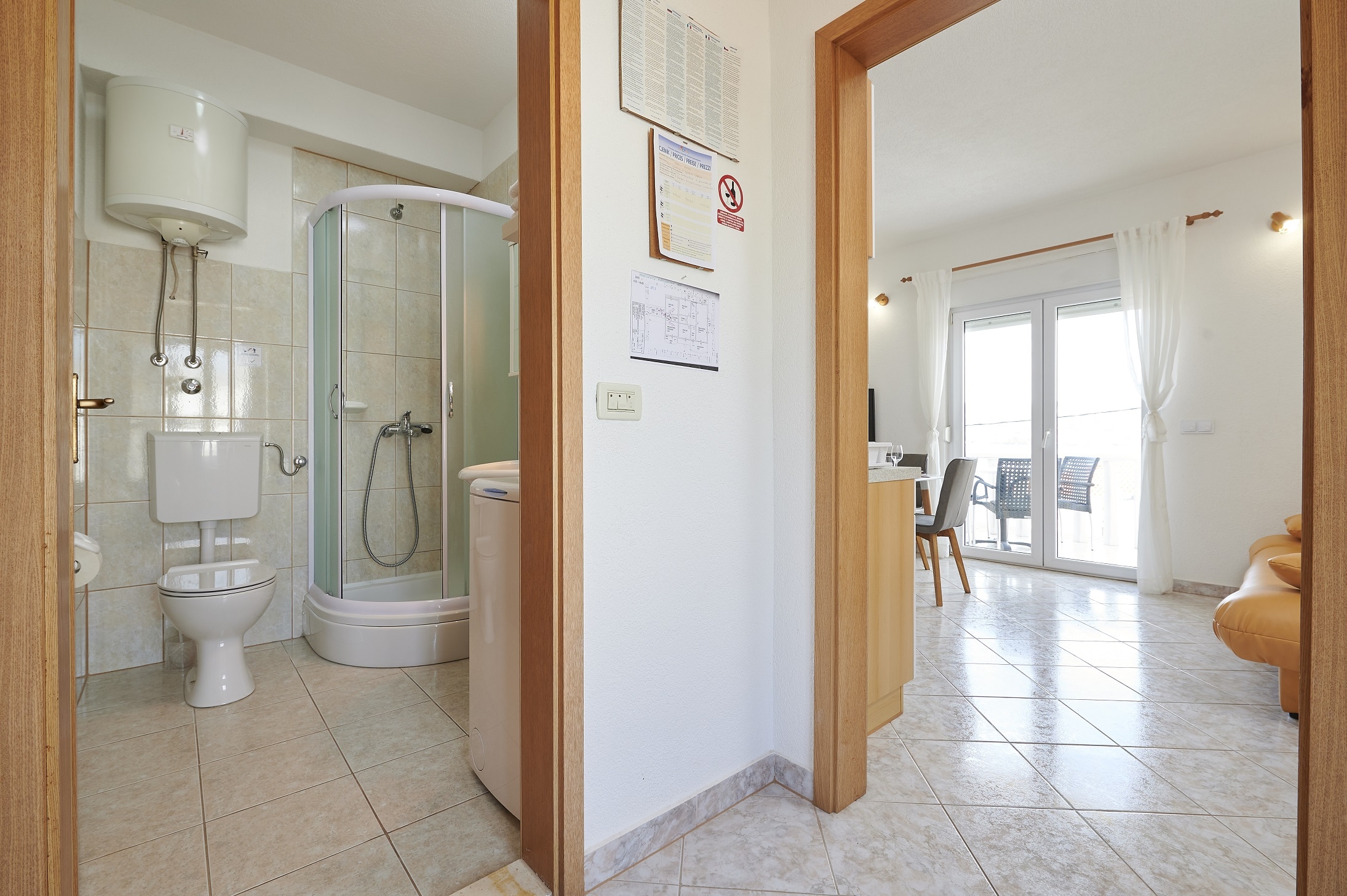 Apartament może przyjąć 3 gości. Łóżka znajdują się w sypialniach, których jest 1, oraz w pokoju dziennym, na powierzchni 31m2. Goście mają dostęp do tarasu, by korzystać z ciepłych, letnich wieczorów. Z apartamentu roztacza się widok na morze. Możliwość przygotowywania posiłków poprzez korzystanie ze wspólnego grilla. WLICZONE W CENĘ: taksa pobytowa, sprzątanie końcowe, klimatyzacja, parking, internet, łóżeczko dziecięce, żelazko, deska do prasowania, suszarka do włosów. OBOWIĄZKOWE KOSZTY DODATKOWE: dopłata za krótki termin (procent dopłaty w zalezności od liczby noclegów: 30% - 1, 20% - 2, 10% - 3). Dostępność dodatkowych usług w rezerwowanym terminie oraz ich cenę (jeśli nie jest podana) należy sprawdzić wcześniej. Za dodatowe usługi, które nie zostały uwzględnione w kalkulacji ceny, płaci się bezpośrednio właścicielowi obiektu, pod warunkiem śe gość korzysta z tych usług.
