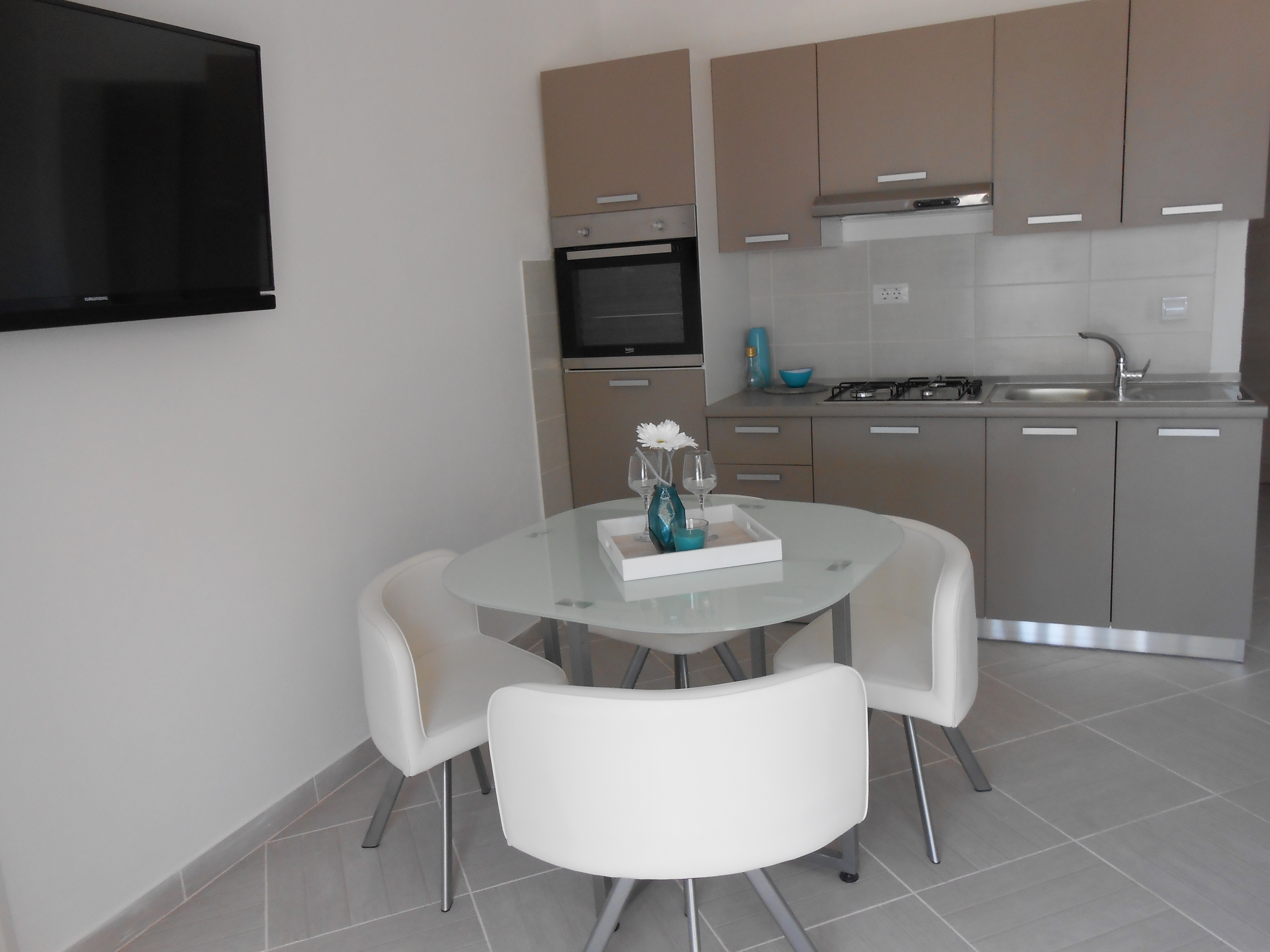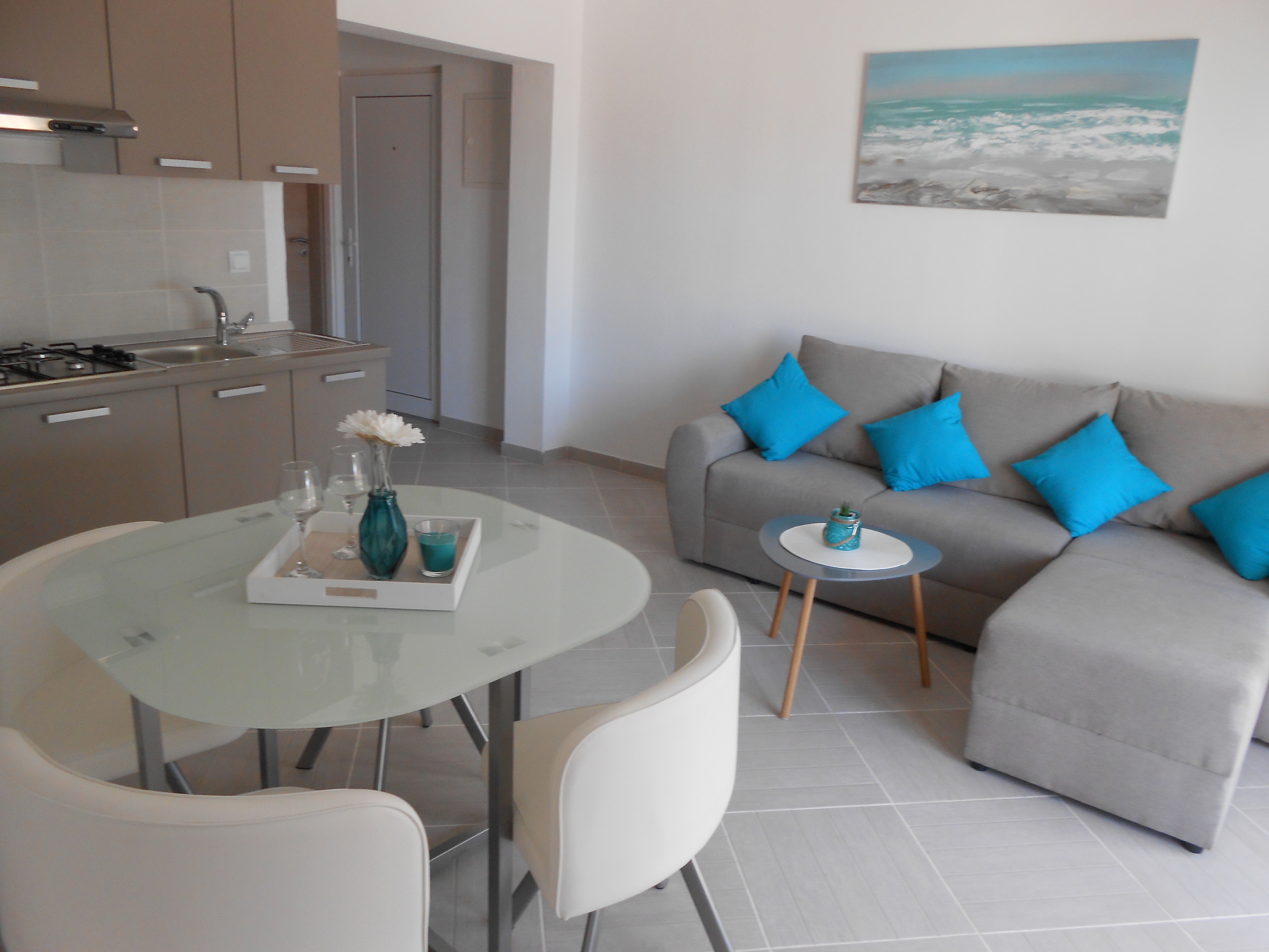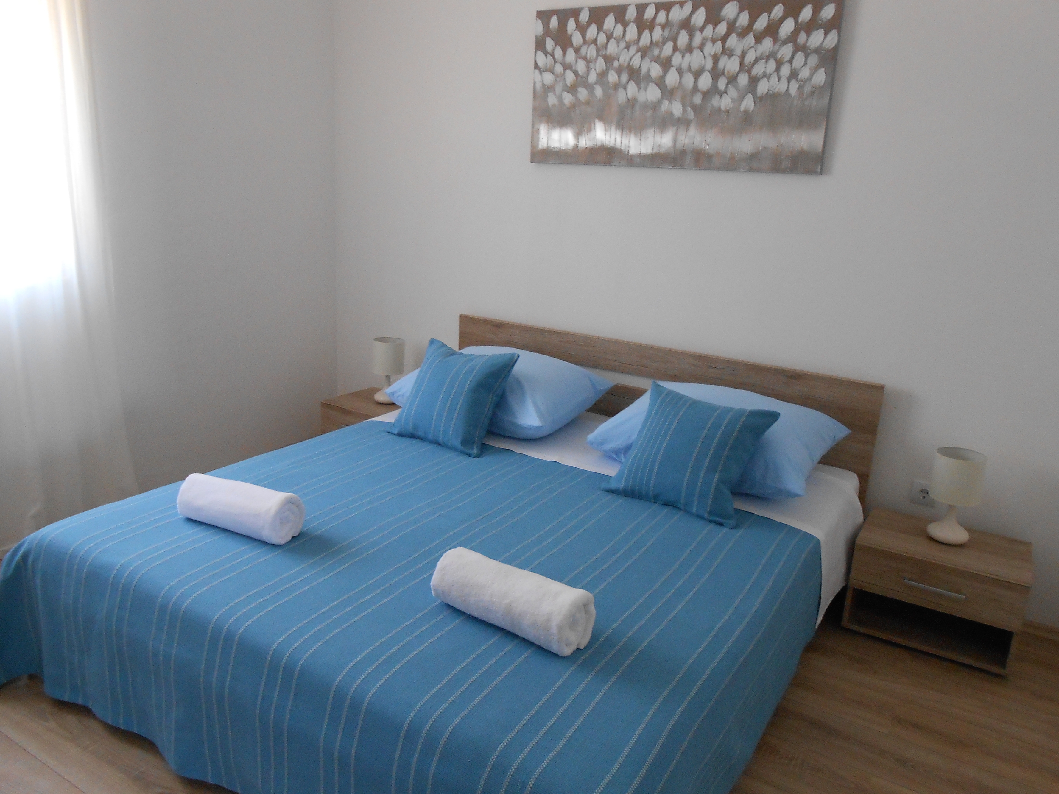 Apartament może przyjąć 4 gości. Łóżka znajdują się w sypialniach, których jest 2, na powierzchni 43m2. Goście mają dostęp do tarasu, by korzystać z ciepłych, letnich wieczorów. Z apartamentu roztacza się widok na morze. Możliwość przygotowywania posiłków poprzez korzystanie ze wspólnego grilla. WLICZONE W CENĘ: taksa pobytowa, sprzątanie końcowe, klimatyzacja, parking, internet, pranie bielizny, żelazko, deska do prasowania, suszarka do włosów, parasol. Dostępność dodatkowych usług w rezerwowanym terminie oraz ich cenę (jeśli nie jest podana) należy sprawdzić wcześniej. Za dodatowe usługi, które nie zostały uwzględnione w kalkulacji ceny, płaci się bezpośrednio właścicielowi obiektu, pod warunkiem śe gość korzysta z tych usług. Zniżki od ceny podstawowej: bezpłatny dzień 14=13 (przy pobycie, trwającym co najmniej 14 dni, otrzymujecie jeden bezpłatny dzień na pobyt do 31.12.2026).