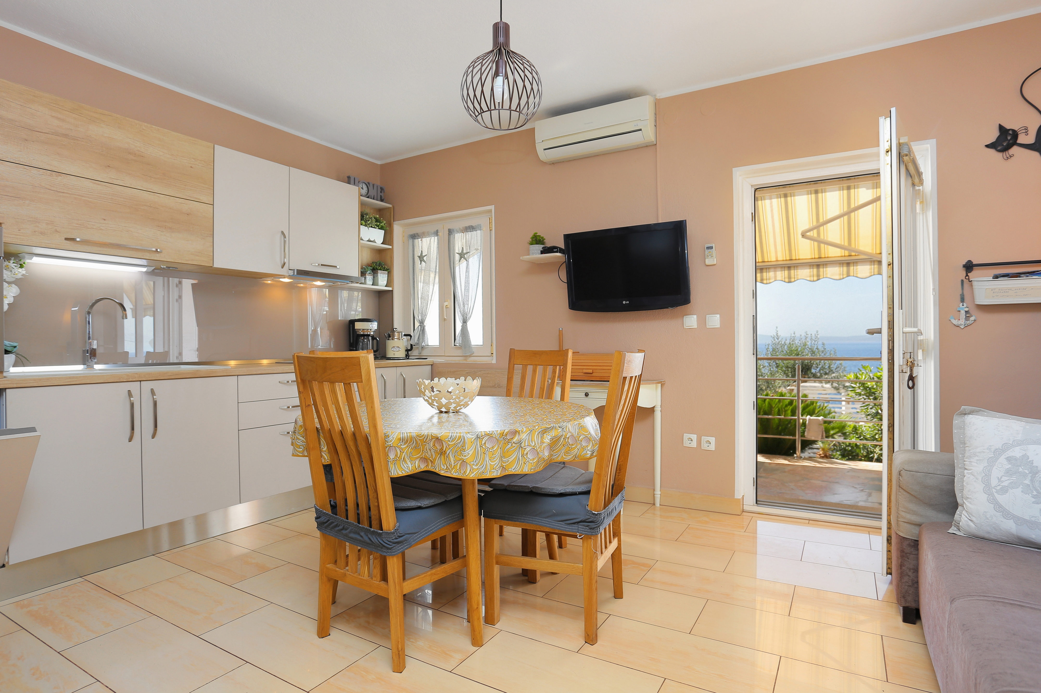 Apartament może przyjąć 6 gości. Łóżka znajdują się w sypialniach, których jest 2, oraz w pokoju dziennym, na powierzchni 49m2. Goście mają dostęp do tarasu, by korzystać z ciepłych, letnich wieczorów. Z apartamentu roztacza się widok na morze. Możliwość przygotowywania posiłków poprzez korzystanie ze wspólnego grilla. Kwatera ma pomieszczenia, które są oddzielone od reszty tej kwatery. WLICZONE W CENĘ: taksa pobytowa, sprzątanie końcowe, klimatyzacja, parking, internet, żelazko, suszarka do włosów, parasol. OBOWIĄZKOWE KOSZTY DODATKOWE: dopłata za krótki termin (procent dopłaty w zalezności od liczby noclegów: 30% - 1, 20% - 2, 10% - 3). Dostępność dodatkowych usług w rezerwowanym terminie oraz ich cenę (jeśli nie jest podana) należy sprawdzić wcześniej. Za dodatowe usługi, które nie zostały uwzględnione w kalkulacji ceny, płaci się bezpośrednio właścicielowi obiektu, pod warunkiem śe gość korzysta z tych usług.