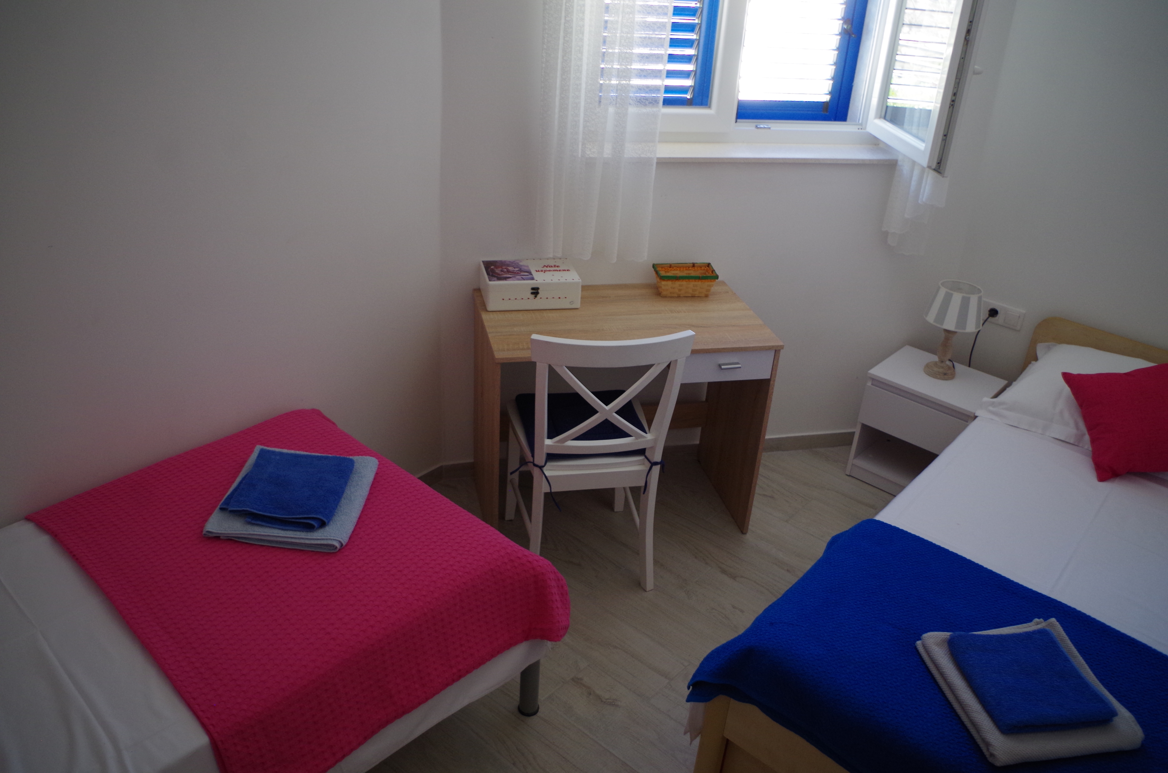 Apartament może przyjąć 5 gości. Łóżka znajdują się w sypialniach, których jest 2, oraz w pokoju dziennym, na powierzchni 41m2. Goście mają dostęp do tarasu, by korzystać z ciepłych, letnich wieczorów. Z apartamentu roztacza się widok na morze. Grill jest dostępny tylko do użytku gości z tej kwatery. WLICZONE W CENĘ: taksa pobytowa, sprzątanie końcowe, klimatyzacja, parking, internet, żelazko, deska do prasowania, suszarka do włosów, przenośny grill. OBOWIĄZKOWE KOSZTY DODATKOWE: dopłata za krótki termin (procent dopłaty w zalezności od liczby noclegów: 30% - 1, 20% - 2, 10% - 3). Dostępność dodatkowych usług w rezerwowanym terminie oraz ich cenę (jeśli nie jest podana) należy sprawdzić wcześniej. Za dodatowe usługi, które nie zostały uwzględnione w kalkulacji ceny, płaci się bezpośrednio właścicielowi obiektu, pod warunkiem śe gość korzysta z tych usług.
