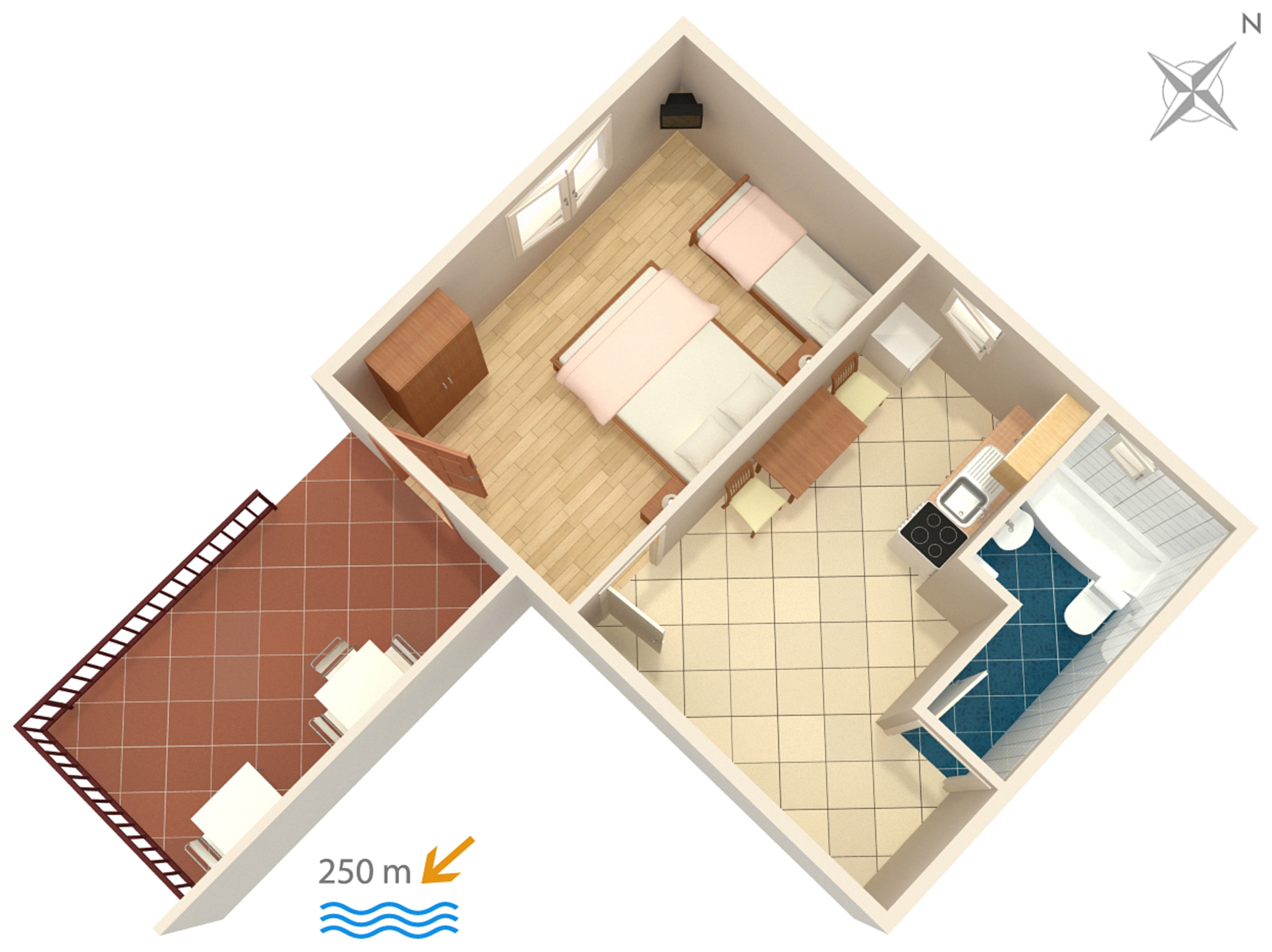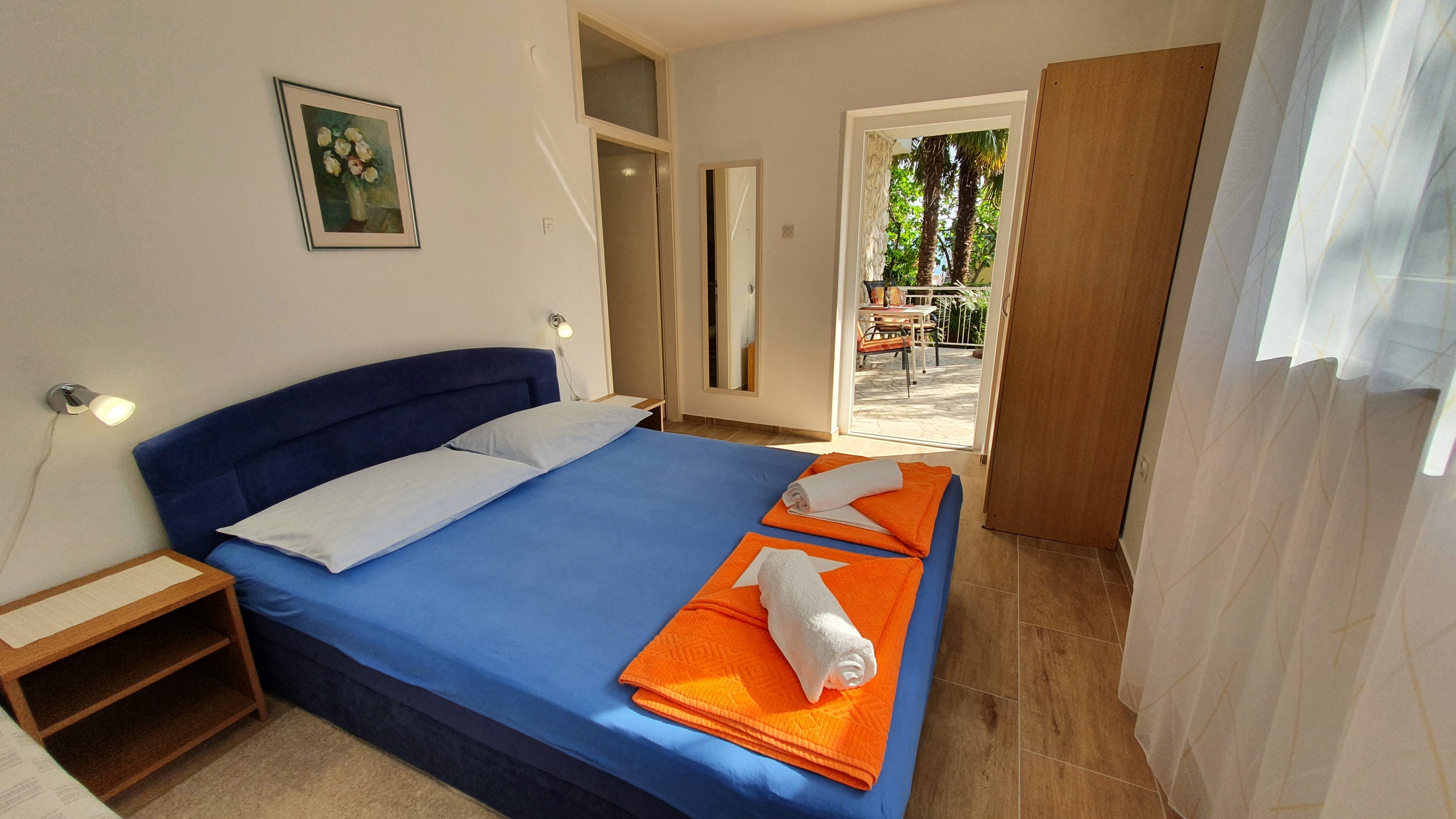 Apartament może przyjąć 3 gości. Łóżka znajdują się w sypialniach, których jest 1, na powierzchni 27m2. Goście mają dostęp do tarasu, by korzystać z ciepłych, letnich wieczorów. Możliwość przygotowywania posiłków poprzez korzystanie ze wspólnego grilla. W kwaterze dozwolony jest pobyt zwierzęcia domowego, za dopłatą. Przez sypialnię rezerwowanej kwatery przechodzi się do pozostałych pomieszczeń kwatery. WLICZONE W CENĘ: taksa pobytowa, sprzątanie końcowe, klimatyzacja, parking, internet, żelazko, deska do prasowania, suszarka do włosów, przenośny grill. OBOWIĄZKOWE KOSZTY DODATKOWE: dopłata za krótki termin (procent dopłaty w zalezności od liczby noclegów: 30% - 1, 20% - 2, 10% - 3). NIEOBOWIĄZKOWE KOSZTY DODATKOWE: pranie bielizny (5,00 € pranie), zwierzęta domowe (12,00 € za nocleg). Dostępność dodatkowych usług w rezerwowanym terminie oraz ich cenę (jeśli nie jest podana) należy sprawdzić wcześniej. Za dodatowe usługi, które nie zostały uwzględnione w kalkulacji ceny, płaci się bezpośrednio właścicielowi obiektu, pod warunkiem śe gość korzysta z tych usług.