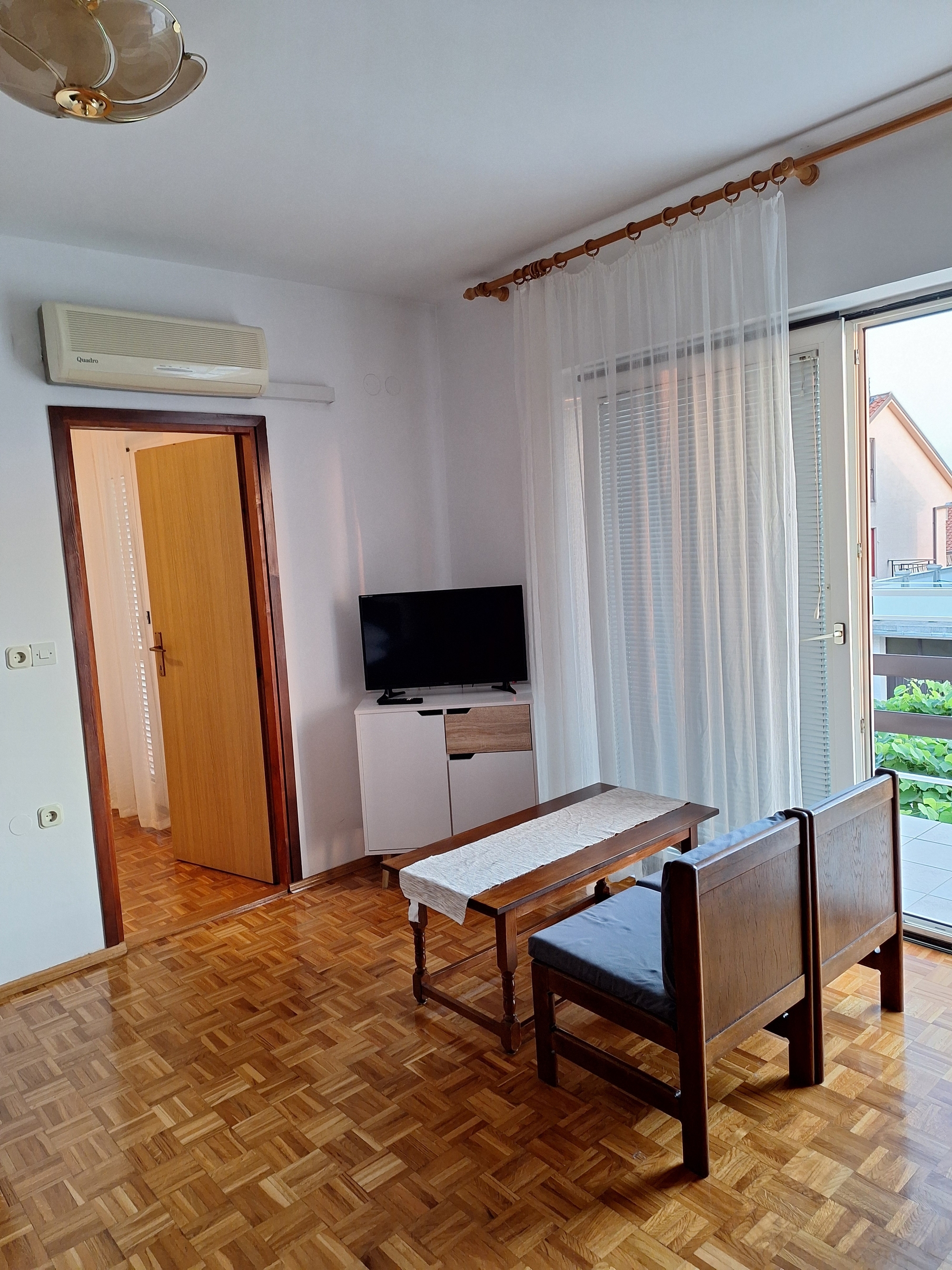 Apartament może przyjąć 4 gości. Łóżka znajdują się w sypialniach, których jest 1, oraz w pokoju dziennym, na powierzchni 38m2. Goście mają dostęp do tarasu, by korzystać z ciepłych, letnich wieczorów. Z apartamentu roztacza się widok na morze. Możliwość przygotowywania posiłków poprzez korzystanie ze wspólnego grilla. W kwaterze dozwolony jest pobyt zwierzęcia domowego, za dopłatą. WLICZONE W CENĘ: taksa pobytowa, sprzątanie końcowe, klimatyzacja, parking, internet, łóżeczko dziecięce, żelazko, deska do prasowania, suszarka do włosów. OBOWIĄZKOWE KOSZTY DODATKOWE: dopłata za krótki termin (procent dopłaty w zalezności od liczby noclegów: 30% - 1, 20% - 2, 10% - 3). NIEOBOWIĄZKOWE KOSZTY DODATKOWE: centralne ogrzewanie (10,00 € za nocleg), zwierzęta domowe (10,00 € za nocleg). Dostępność dodatkowych usług w rezerwowanym terminie oraz ich cenę (jeśli nie jest podana) należy sprawdzić wcześniej. Za dodatowe usługi, które nie zostały uwzględnione w kalkulacji ceny, płaci się bezpośrednio właścicielowi obiektu, pod warunkiem śe gość korzysta z tych usług. Zniżki od ceny podstawowej: bezpłatny dzień 14=13 (przy pobycie, trwającym co najmniej 14 dni, otrzymujecie jeden bezpłatny dzień na pobyt do 31.12.2026).