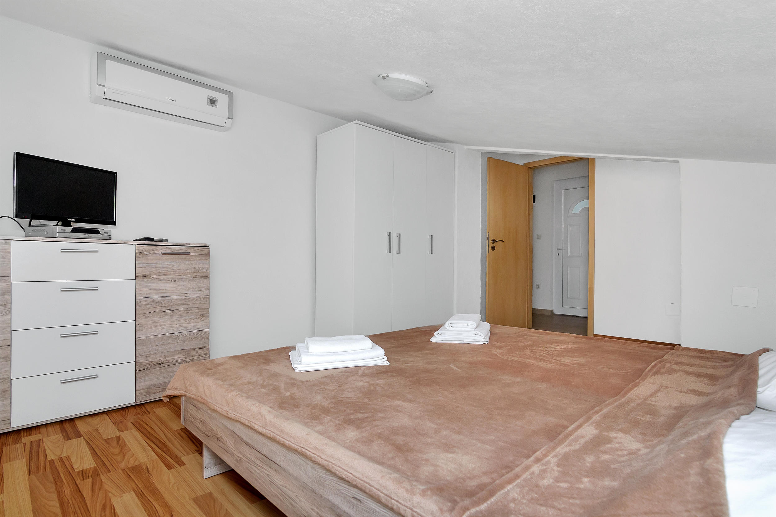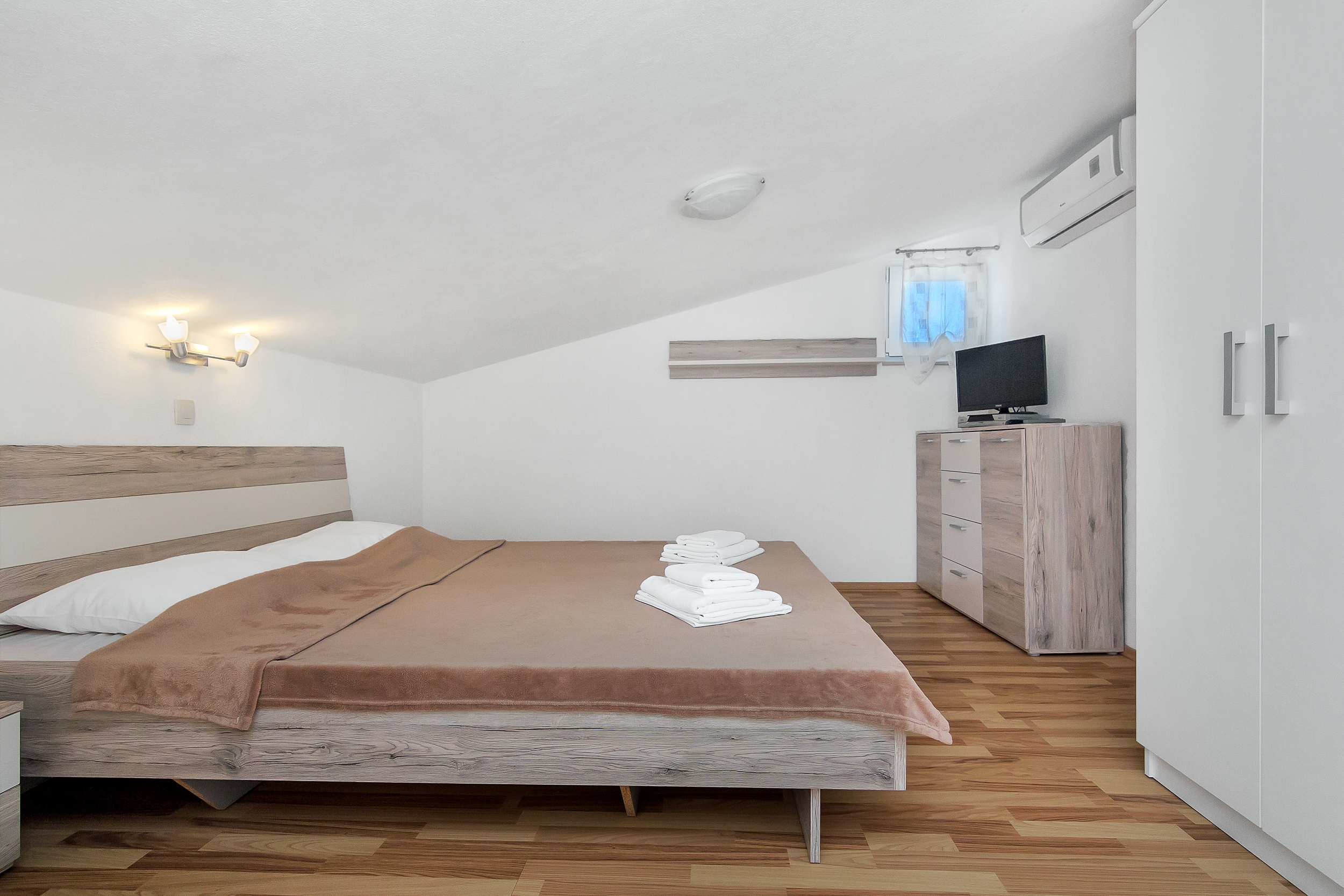 Apartament może przyjąć 7 gości. Łóżka znajdują się w sypialniach, których jest 2, oraz w pokoju dziennym, na powierzchni 49m2. Goście mają dostęp do tarasu, by korzystać z ciepłych, letnich wieczorów. Z apartamentu roztacza się widok na morze. Możliwość przygotowywania posiłków poprzez korzystanie ze wspólnego grilla. W kwaterze dozwolony jest pobyt zwierzęcia domowego, za dopłatą. WLICZONE W CENĘ: taksa pobytowa, sprzątanie końcowe, klimatyzacja, parking, internet, miejsce do cumowania łodzi, łóżeczko dziecięce. NIEOBOWIĄZKOWE KOSZTY DODATKOWE: łódź (115,00 € za nocleg), zwierzęta domowe (13,00 € za nocleg). Dostępność dodatkowych usług w rezerwowanym terminie oraz ich cenę (jeśli nie jest podana) należy sprawdzić wcześniej. Za dodatowe usługi, które nie zostały uwzględnione w kalkulacji ceny, płaci się bezpośrednio właścicielowi obiektu, pod warunkiem śe gość korzysta z tych usług.