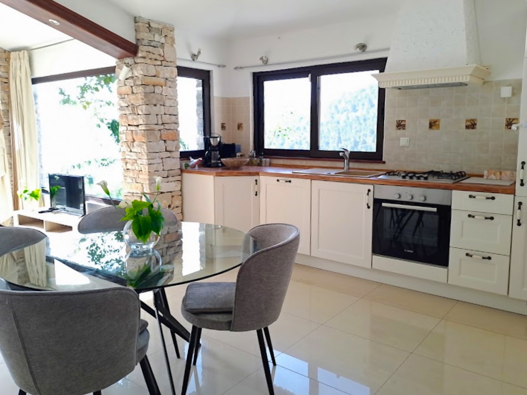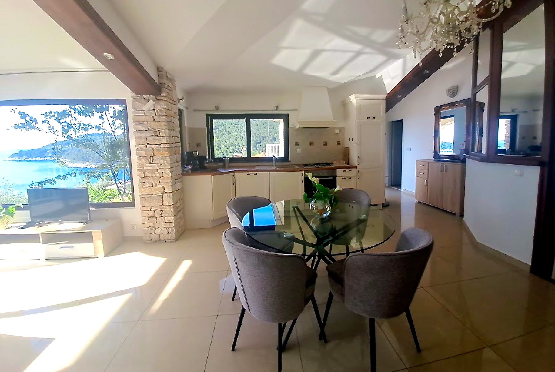 Apartament może przyjąć 5 gości. Łóżka znajdują się w sypialniach, których jest 2, oraz w pokoju dziennym, na powierzchni 92m2. Goście mają dostęp do tarasu, by korzystać z ciepłych, letnich wieczorów. Z apartamentu roztacza się widok na morze. Grill jest dostępny tylko do użytku gości z tej kwatery. W trakcie swojego pobytu goście mogą korzystać ze wspólnego basenu. WLICZONE W CENĘ: taksa pobytowa, sprzątanie końcowe, klimatyzacja, basen, parking, internet, pranie bielizny, miejsce do cumowania łodzi, łóżeczko dziecięce, żelazko, deska do prasowania, suszarka do włosów, przenośny grill. OBOWIĄZKOWE KOSZTY DODATKOWE: dopłata za krótki termin (procent dopłaty w zalezności od liczby noclegów: 30% - 1, 20% - 2, 10% - 3). Dostępność dodatkowych usług w rezerwowanym terminie oraz ich cenę (jeśli nie jest podana) należy sprawdzić wcześniej. Za dodatowe usługi, które nie zostały uwzględnione w kalkulacji ceny, płaci się bezpośrednio właścicielowi obiektu, pod warunkiem śe gość korzysta z tych usług.