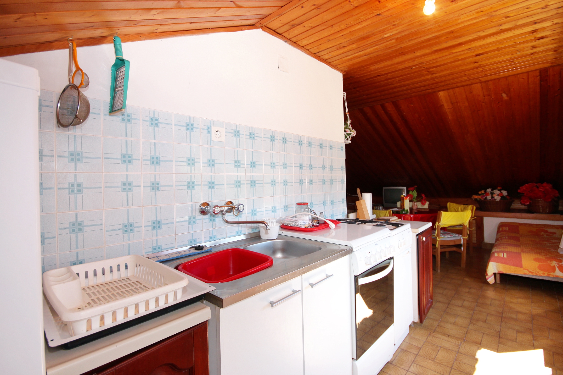 Apartament może przyjąć 7 gości. Łóżka znajdują się w sypialniach, których jest 2, oraz w jadalni, na powierzchni 71m2. Goście mają dostęp do tarasu, by korzystać z ciepłych, letnich wieczorów. Z apartamentu roztacza się widok na morze. Możliwość przygotowywania posiłków poprzez korzystanie ze wspólnego grilla. W kwaterze dozwolony jest pobyt zwierzęcia domowego, za dopłatą. WLICZONE W CENĘ: taksa pobytowa, sprzątanie końcowe, klimatyzacja, parking, internet, pranie bielizny, żelazko, deska do prasowania, suszarka do włosów. OBOWIĄZKOWE KOSZTY DODATKOWE: dopłata za krótki termin (procent dopłaty w zalezności od liczby noclegów: 30% - 1, 20% - 2, 10% - 3). NIEOBOWIĄZKOWE KOSZTY DODATKOWE: zwierzęta domowe (5,00 € za nocleg). Dostępność dodatkowych usług w rezerwowanym terminie oraz ich cenę (jeśli nie jest podana) należy sprawdzić wcześniej. Za dodatowe usługi, które nie zostały uwzględnione w kalkulacji ceny, płaci się bezpośrednio właścicielowi obiektu, pod warunkiem śe gość korzysta z tych usług.