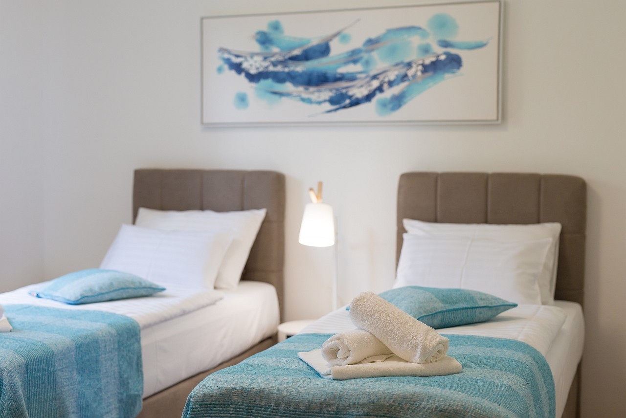 Apartament może przyjąć 4 gości. Łóżka znajdują się w sypialniach, których jest 2, na powierzchni 59m2. Goście mają dostęp do tarasu, by korzystać z ciepłych, letnich wieczorów. Z apartamentu roztacza się widok na morze. WLICZONE W CENĘ: taksa pobytowa, sprzątanie końcowe, klimatyzacja, parking, internet. Dostępność dodatkowych usług w rezerwowanym terminie oraz ich cenę (jeśli nie jest podana) należy sprawdzić wcześniej. Za dodatowe usługi, które nie zostały uwzględnione w kalkulacji ceny, płaci się bezpośrednio właścicielowi obiektu, pod warunkiem śe gość korzysta z tych usług.