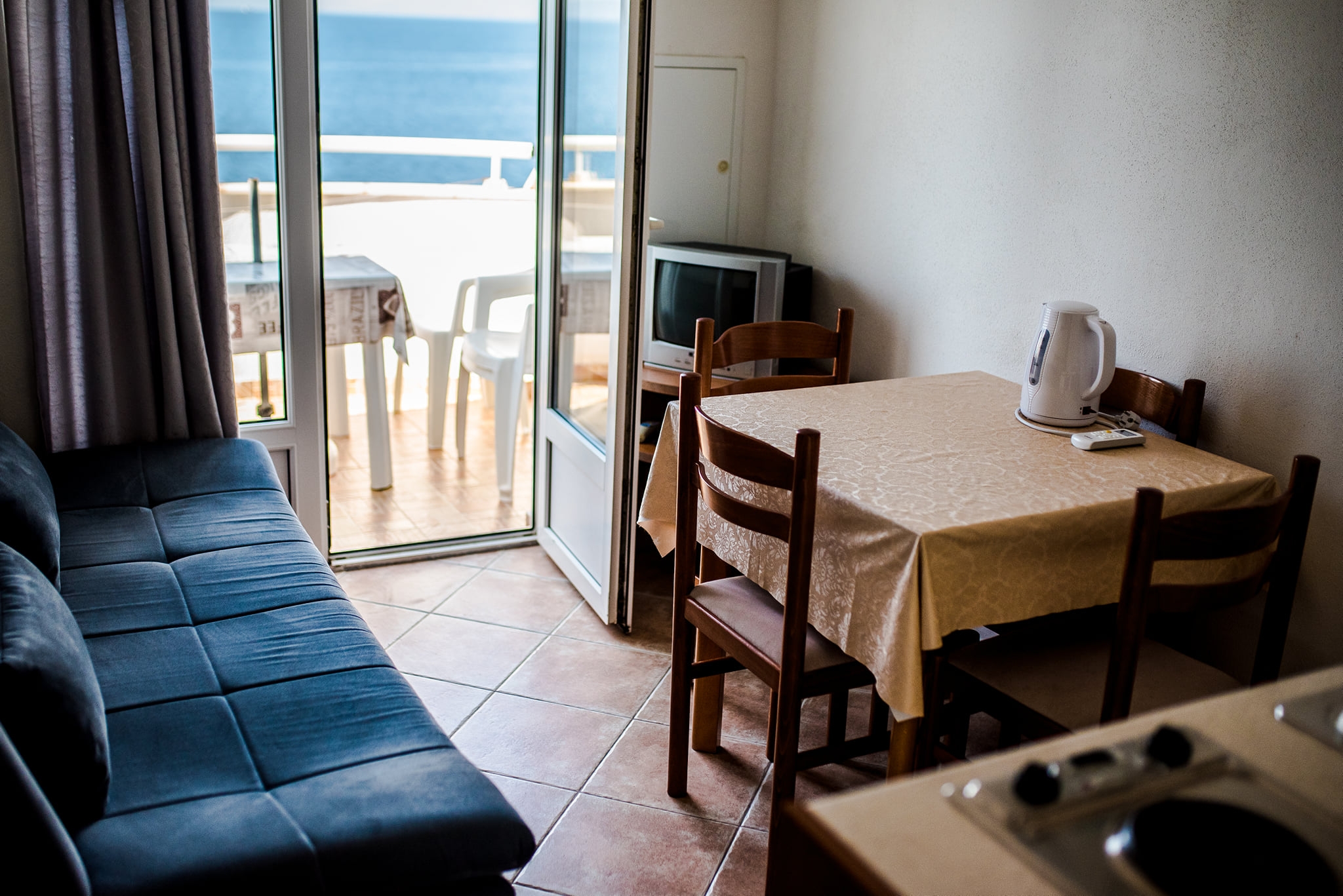 Apartament może przyjąć 3 gości. Łóżka znajdują się w sypialniach, których jest 1, oraz w pokoju dziennym, na powierzchni 17m2. Goście mają dostęp do tarasu, by korzystać z ciepłych, letnich wieczorów. Z apartamentu roztacza się widok na morze. WLICZONE W CENĘ: taksa pobytowa, sprzątanie końcowe, klimatyzacja, internet. Dostępność dodatkowych usług w rezerwowanym terminie oraz ich cenę (jeśli nie jest podana) należy sprawdzić wcześniej. Za dodatowe usługi, które nie zostały uwzględnione w kalkulacji ceny, płaci się bezpośrednio właścicielowi obiektu, pod warunkiem śe gość korzysta z tych usług.