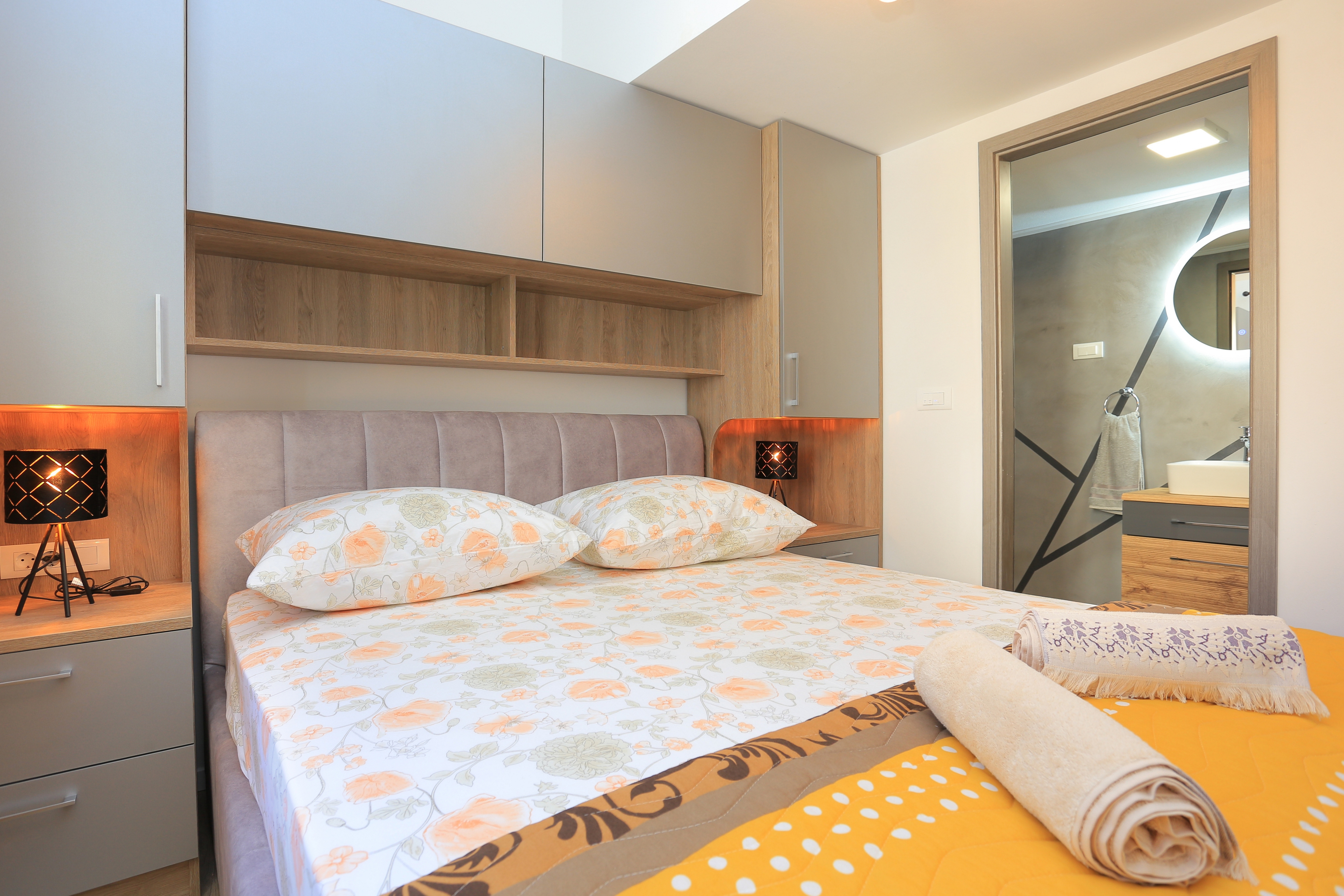 Apartament może przyjąć 8 gości. Łóżka znajdują się w sypialniach, których jest 3, oraz w pokoju dziennym, na powierzchni 74m2. Goście mają dostęp do tarasu, by korzystać z ciepłych, letnich wieczorów. Z apartamentu roztacza się widok na morze. Grill jest dostępny tylko do użytku gości z tej kwatery. WLICZONE W CENĘ: taksa pobytowa, sprzątanie końcowe, klimatyzacja, parking, internet. OBOWIĄZKOWE KOSZTY DODATKOWE: dopłata za krótki termin (procent dopłaty w zalezności od liczby noclegów: 30% - 1, 20% - 2, 10% - 3). Dostępność dodatkowych usług w rezerwowanym terminie oraz ich cenę (jeśli nie jest podana) należy sprawdzić wcześniej. Za dodatowe usługi, które nie zostały uwzględnione w kalkulacji ceny, płaci się bezpośrednio właścicielowi obiektu, pod warunkiem śe gość korzysta z tych usług. Zniżki od ceny podstawowej: bezpłatny dzień 14=13 (przy pobycie, trwającym co najmniej 14 dni, otrzymujecie jeden bezpłatny dzień na pobyt do 31.12.2026).