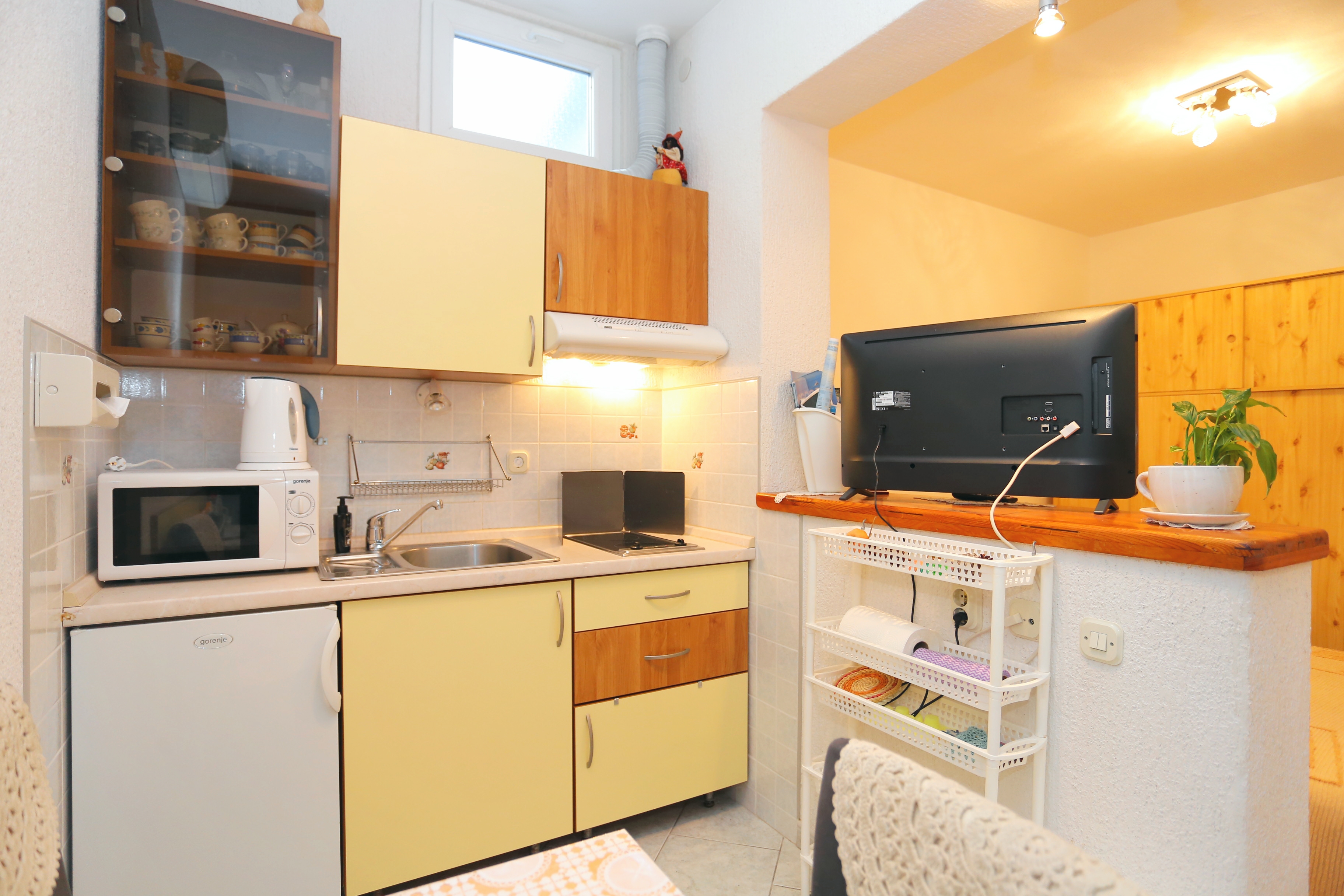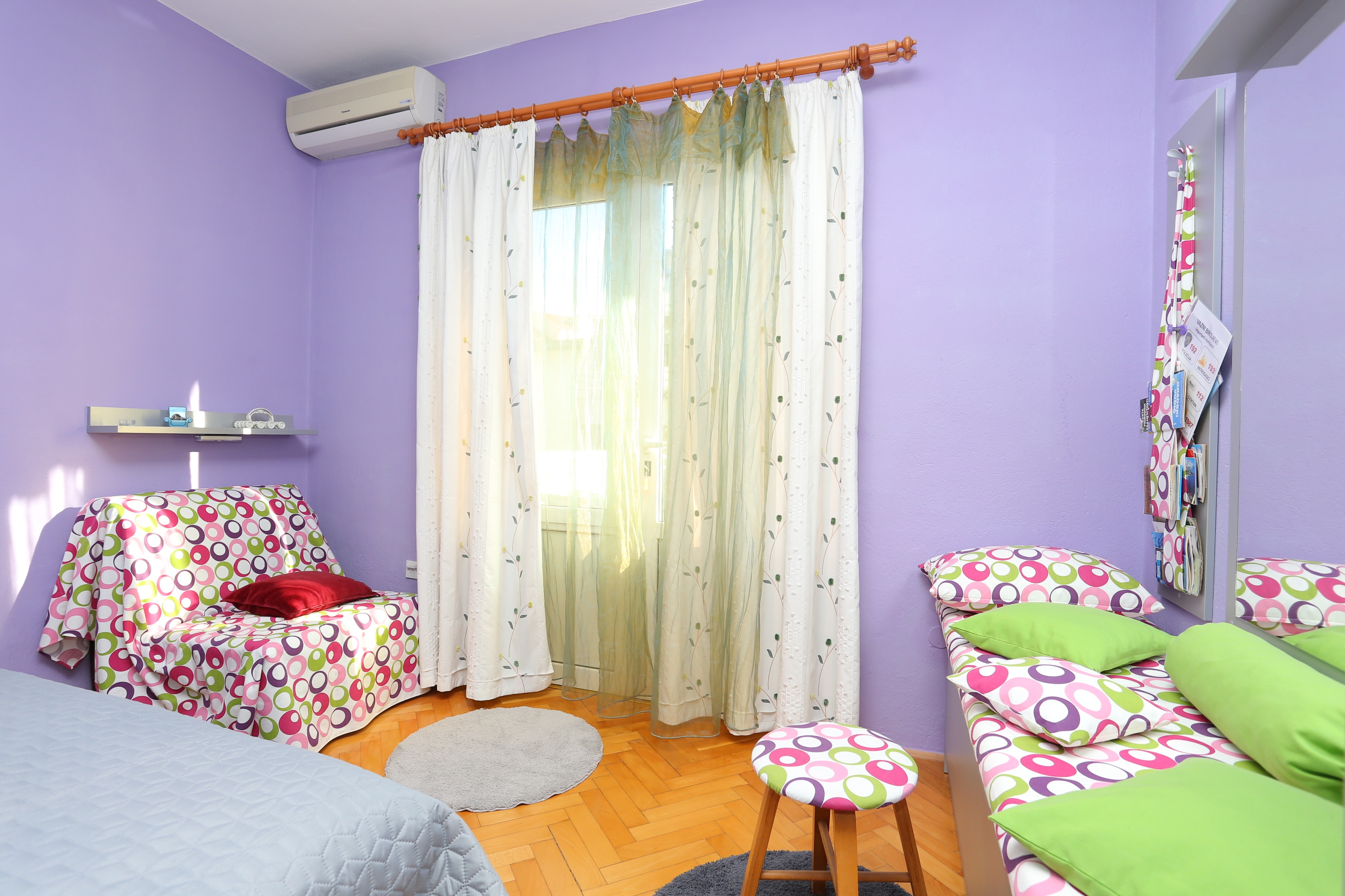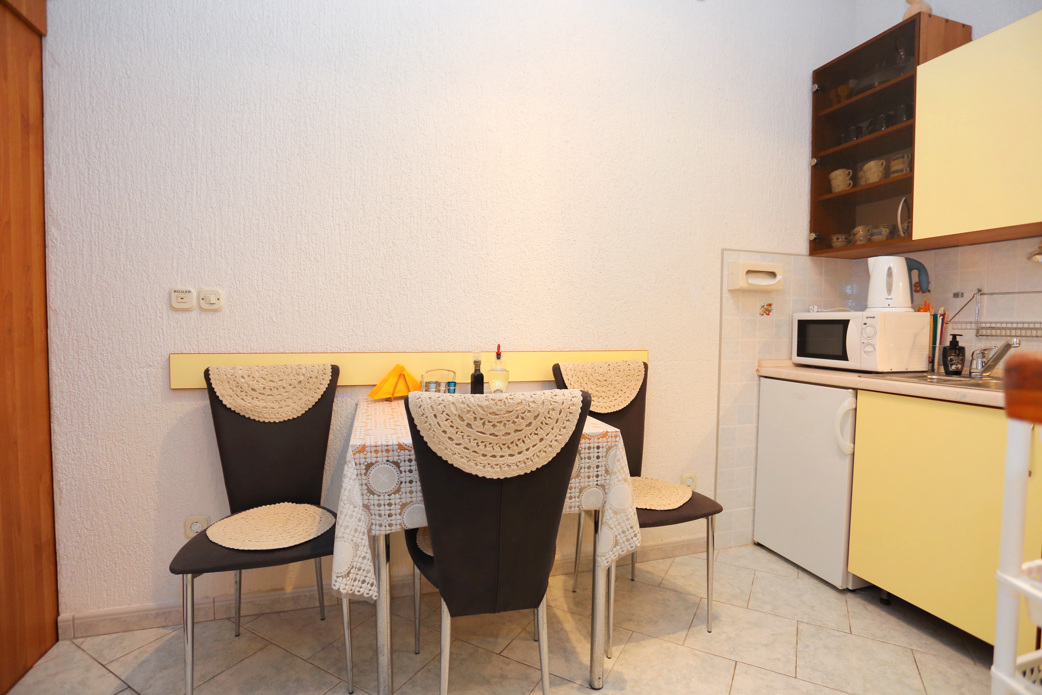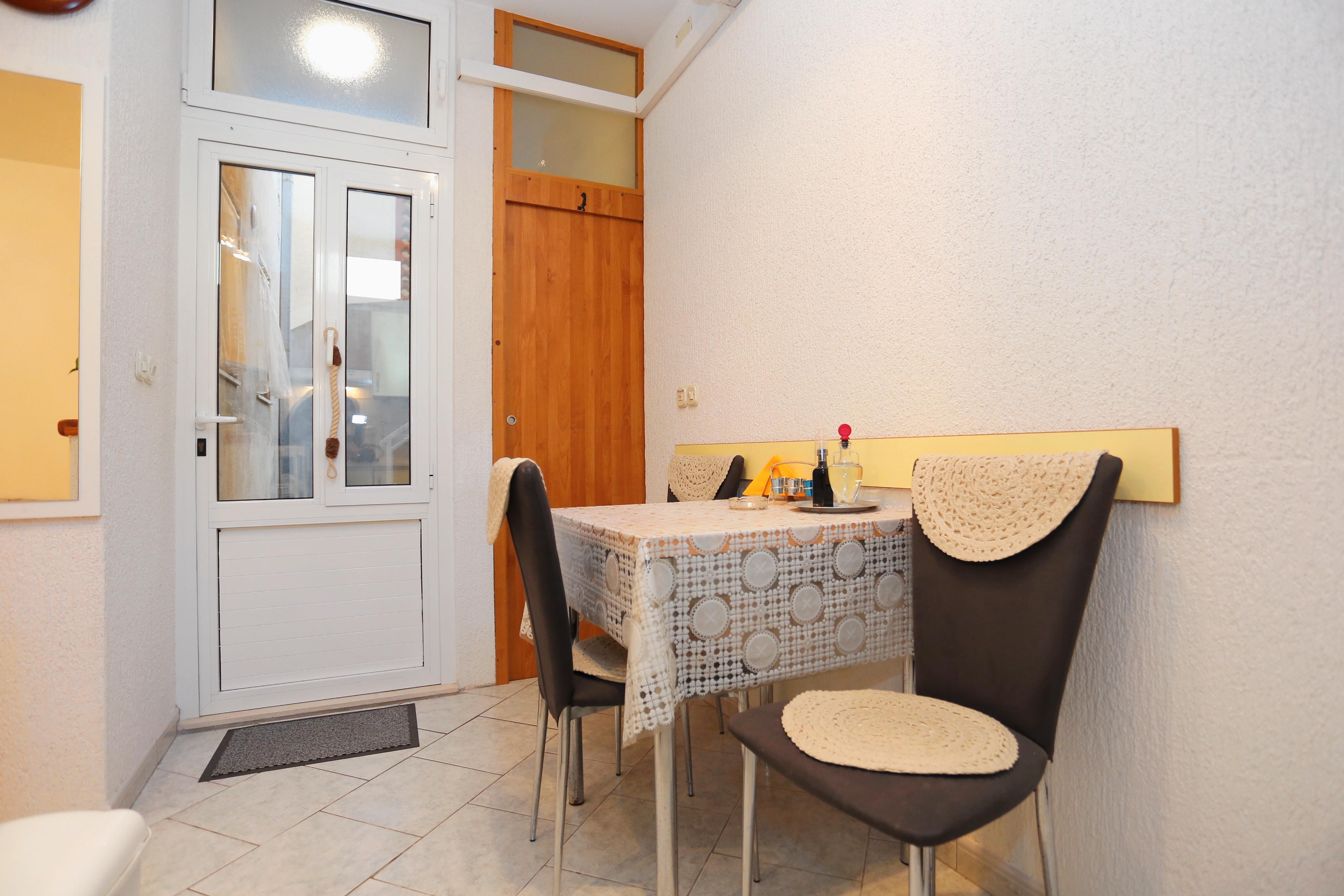 Apartament może przyjąć 9 gości. Łóżka znajdują się w sypialniach, których jest 3, na powierzchni 70m2. Goście mają dostęp do tarasu, by korzystać z ciepłych, letnich wieczorów. Z apartamentu roztacza się widok na morze. Możliwość przygotowywania posiłków poprzez korzystanie ze wspólnego grilla. W kwaterze dozwolony jest pobyt zwierzęcia domowego, za dopłatą. WLICZONE W CENĘ: taksa pobytowa, sprzątanie końcowe, klimatyzacja, parking, internet, łóżeczko dziecięce, żelazko, deska do prasowania, suszarka do włosów. OBOWIĄZKOWE KOSZTY DODATKOWE: dopłata za krótki termin (procent dopłaty w zalezności od liczby noclegów: 30% - 1, 20% - 2, 10% - 3). NIEOBOWIĄZKOWE KOSZTY DODATKOWE: zwierzęta domowe (7,00 € za nocleg). Dostępność dodatkowych usług w rezerwowanym terminie oraz ich cenę (jeśli nie jest podana) należy sprawdzić wcześniej. Za dodatowe usługi, które nie zostały uwzględnione w kalkulacji ceny, płaci się bezpośrednio właścicielowi obiektu, pod warunkiem śe gość korzysta z tych usług.