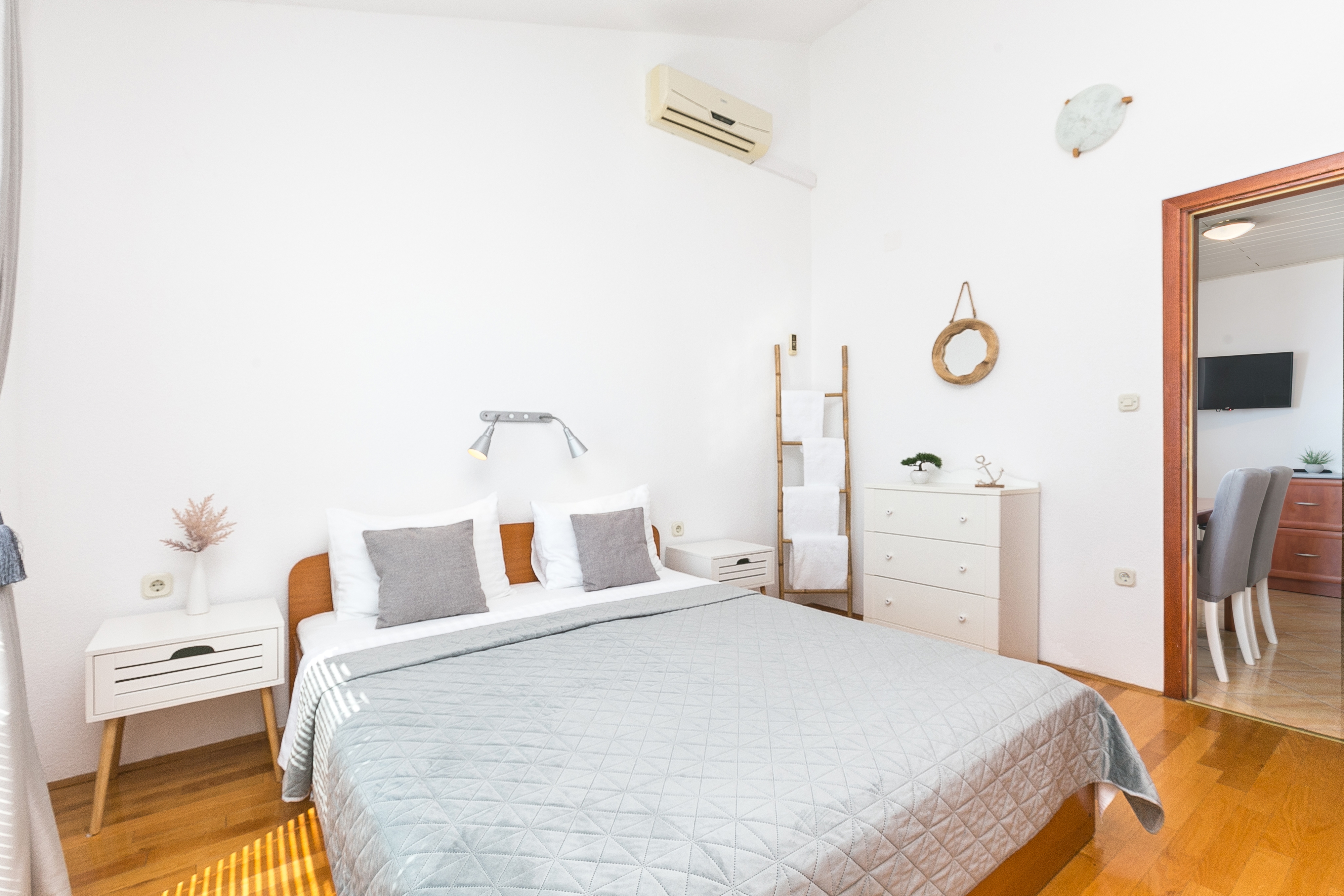 Apartament może przyjąć 4 gości. Łóżka znajdują się w sypialniach, których jest 2, na powierzchni 42m2. Goście mają dostęp do balkonu, by korzystać z ciepłych, letnich wieczorów. Z apartamentu roztacza się widok na morze. Możliwość przygotowywania posiłków poprzez korzystanie ze wspólnego grilla. WLICZONE W CENĘ: taksa pobytowa, sprzątanie końcowe, klimatyzacja, parking, internet, pranie bielizny, łóżeczko dziecięce, żelazko, deska do prasowania. OBOWIĄZKOWE KOSZTY DODATKOWE: dopłata za krótki termin (procent dopłaty w zalezności od liczby noclegów: 30% - 1, 20% - 2, 10% - 3). Dostępność dodatkowych usług w rezerwowanym terminie oraz ich cenę (jeśli nie jest podana) należy sprawdzić wcześniej. Za dodatowe usługi, które nie zostały uwzględnione w kalkulacji ceny, płaci się bezpośrednio właścicielowi obiektu, pod warunkiem śe gość korzysta z tych usług. Zniżki od ceny podstawowej: bezpłatny dzień 14=13 (przy pobycie, trwającym co najmniej 14 dni, otrzymujecie jeden bezpłatny dzień na pobyt do 31.12.2026).