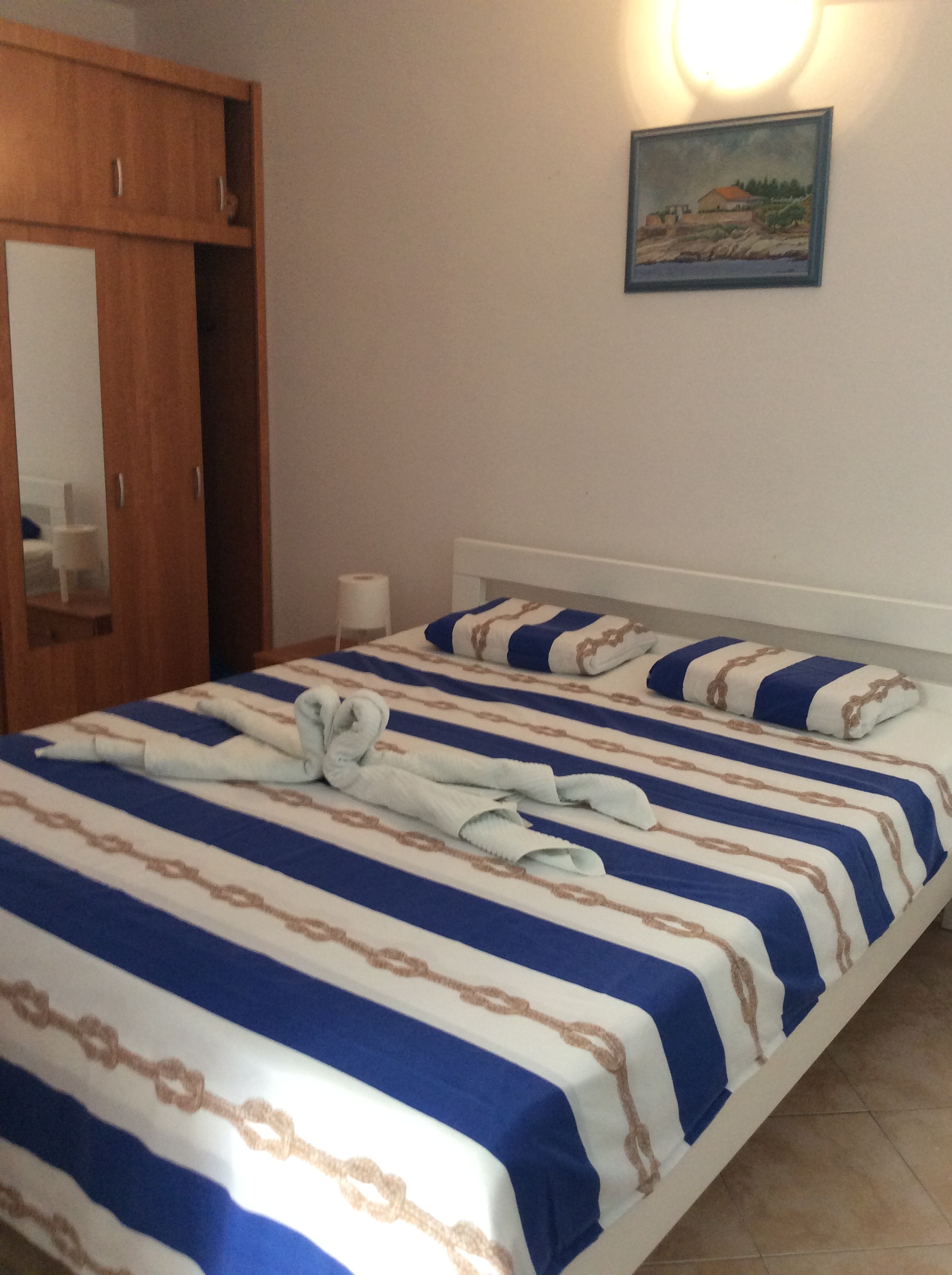 Apartament może przyjąć 6 gości. Łóżka znajdują się w sypialniach, których jest 3, na powierzchni 54m2. Goście mają dostęp do tarasu, by korzystać z ciepłych, letnich wieczorów. Z apartamentu roztacza się widok na morze. Możliwość przygotowywania posiłków poprzez korzystanie ze wspólnego grilla. W kwaterze dozwolony jest pobyt zwierzęcia domowego, za dopłatą. WLICZONE W CENĘ: taksa pobytowa, sprzątanie końcowe, klimatyzacja, parking, internet, łóżeczko dziecięce, żelazko, deska do prasowania, suszarka do włosów. OBOWIĄZKOWE KOSZTY DODATKOWE: dopłata za krótki termin (procent dopłaty w zalezności od liczby noclegów: 30% - 1, 20% - 2, 10% - 3). NIEOBOWIĄZKOWE KOSZTY DODATKOWE: zwierzęta domowe (10,00 € za nocleg), rower (5,00 € za dzień (za sztukę)). Dostępność dodatkowych usług w rezerwowanym terminie oraz ich cenę (jeśli nie jest podana) należy sprawdzić wcześniej. Za dodatowe usługi, które nie zostały uwzględnione w kalkulacji ceny, płaci się bezpośrednio właścicielowi obiektu, pod warunkiem śe gość korzysta z tych usług.