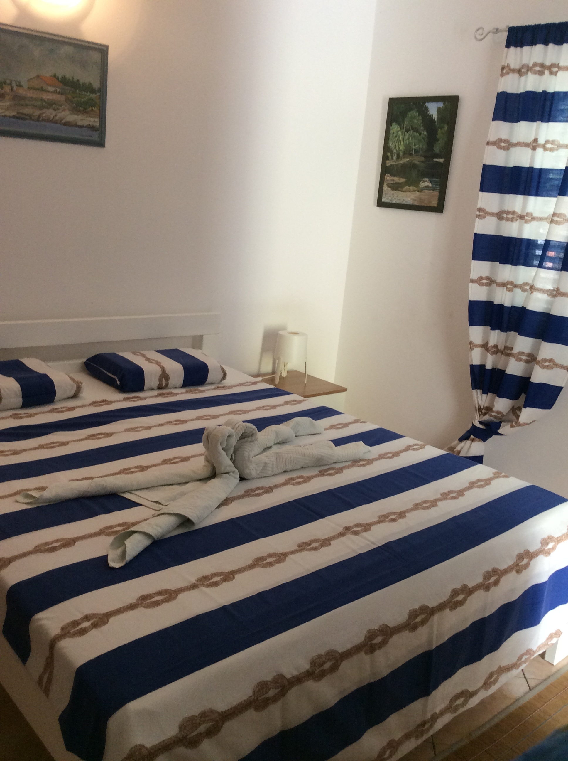 Zakwaterowanie w kwaterach typu Apartament (2) mogą Państwo znaleźć w obiekcie 5125 w miejscowości Murter, Murter - Północna Dalmacja. Obiekt jest oddalony 40 m od morza i znajduje się w kategorii "Obiekty tuż przy plaży". Plaża najbliższa obiektowi jest skały. W obiekcie istnieje więcej apartamentów, w których prawdopodobnie będą przebywać także inni goście w czasie Państwa wakacji. W czasie Państwa pobytu gospodarze także będą przebywać w obiekcie. Właściciel nie ma obowiązku przyjąć dodatkowych niezgłoszonych osób ani zwierząt domowych, dlatego też trzeba je wcześniej zgłosić.ZAWARTOŚĆ Teren wokół domu (Uporządkowane), Podwórko (100m2, Miejsce do siedzenia), Parking (Liczba miejsc parkingowych: 6, Odległość od obiektu: Na podwórku), Grill: wspólny, WiFi Internet, Rower (Ilość: 2), Suszarka do włosów, Żelazko, Deska do prasowania, Łóżeczko dziecięce LOKALIZACJA I DOSTĘP Obiekt znajduje się przy lokalnej drodze Pomiędzy obiektem i plażą znajduje się lokalna droga Obiekt znajduje się przy plaży Ilość schodów od obiektu do plaży: 10 Możliwość dojazdu samochodem: Tak Obiekt znajduje się w relatywnie cichej okolicy Obiekt jest częściowo otoczony zielenią ODLEGŁOŚCI Morze: 40 m Plaża: 40 m Centrum: 1,8 km Sklep: 700 m Apteka: 1,5 km Kantor: 1,5 km Bankomat: 550 m Informacje turystyczne: 1,8 km Stacja benzynowa: 3 km Targ: 1,8 km