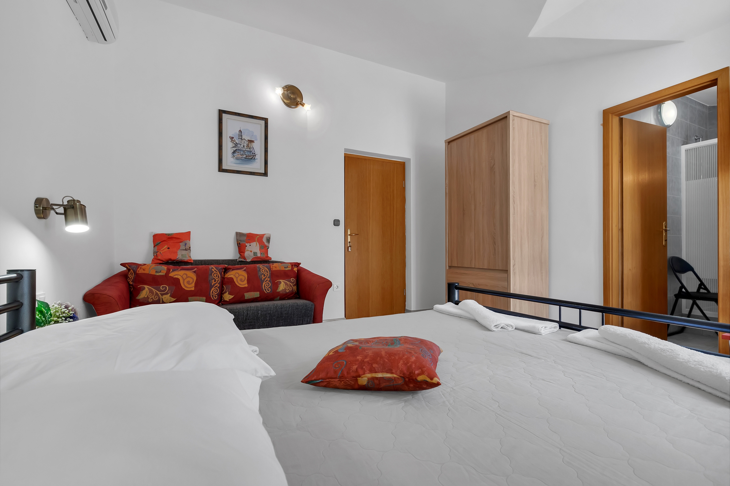 Pokój może przyjąć 3 gości. Łóżka znajdują się w sypialniach, których jest 1, na powierzchni 19m2. Goście mają dostęp do balkonu, by korzystać z ciepłych, letnich wieczorów. Z pokoju roztacza się widok na morze. W kwaterze dozwolony jest pobyt zwierzęcia domowego, za dopłatą. Rezerwowana kwatera to pokój z własną łazienką, bez możliwości korzystania z kuchni. Rezerwowana kwatera ma taras wspólny z inną kwaterą. WLICZONE W CENĘ: taksa pobytowa, sprzątanie końcowe, klimatyzacja, parking, internet, żelazko, deska do prasowania, suszarka do włosów. OBOWIĄZKOWE KOSZTY DODATKOWE: dopłata za krótki termin (procent dopłaty w zalezności od liczby noclegów: 30% - 1, 20% - 2, 10% - 3). NIEOBOWIĄZKOWE KOSZTY DODATKOWE: zwierzęta domowe (10,00 € za nocleg). Dostępność dodatkowych usług w rezerwowanym terminie oraz ich cenę (jeśli nie jest podana) należy sprawdzić wcześniej. Za dodatowe usługi, które nie zostały uwzględnione w kalkulacji ceny, płaci się bezpośrednio właścicielowi obiektu, pod warunkiem śe gość korzysta z tych usług. Zniżki od ceny podstawowej: bezpłatny dzień 14=13 (przy pobycie, trwającym co najmniej 14 dni, otrzymujecie jeden bezpłatny dzień na pobyt do 31.12.2026).