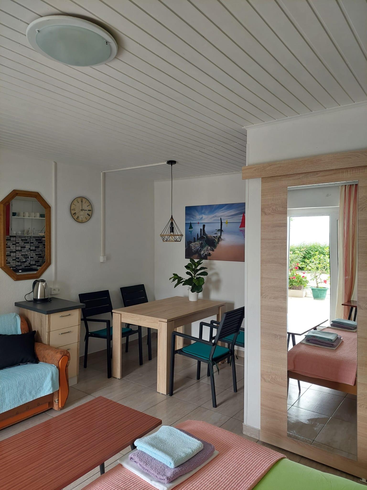 Studio może przyjąć 3 gości. Łóżka znajdują się w sypialniach, których jest 1, na powierzchni 21m2. Goście mają dostęp do tarasu, by korzystać z ciepłych, letnich wieczorów. Z apartamentu typu studio roztacza się widok na morze. Możliwość przygotowywania posiłków poprzez korzystanie ze wspólnego grilla. WLICZONE W CENĘ: taksa pobytowa, sprzątanie końcowe, klimatyzacja, parking, internet, deska do prasowania, suszarka do włosów. OBOWIĄZKOWE KOSZTY DODATKOWE: dopłata za krótki termin (procent dopłaty w zalezności od liczby noclegów: 30% - 1, 20% - 2, 10% - 3). Dostępność dodatkowych usług w rezerwowanym terminie oraz ich cenę (jeśli nie jest podana) należy sprawdzić wcześniej. Za dodatowe usługi, które nie zostały uwzględnione w kalkulacji ceny, płaci się bezpośrednio właścicielowi obiektu, pod warunkiem śe gość korzysta z tych usług. Zniżki od ceny podstawowej: bezpłatny dzień 14=13 (przy pobycie, trwającym co najmniej 14 dni, otrzymujecie jeden bezpłatny dzień na pobyt do 31.12.2026).