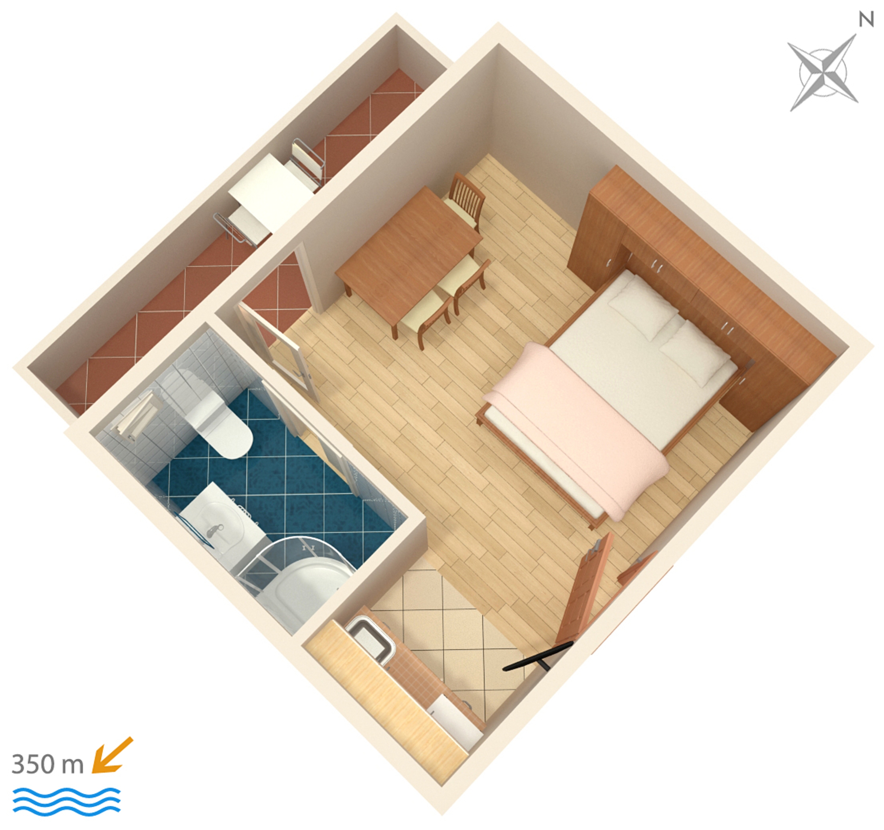 Studio może przyjąć 2 gości. Łóżka znajdują się w sypialniach, których jest 1, na powierzchni 16m2. Goście mają dostęp do balkonu, by korzystać z ciepłych, letnich wieczorów. Z apartamentu typu studio roztacza się widok na morze. Możliwość przygotowywania posiłków poprzez korzystanie ze wspólnego grilla. WLICZONE W CENĘ: taksa pobytowa, sprzątanie końcowe, klimatyzacja, parking, internet, pranie bielizny, przenośny grill. OBOWIĄZKOWE KOSZTY DODATKOWE: dopłata za krótki termin (procent dopłaty w zalezności od liczby noclegów: 30% - 1, 20% - 2, 10% - 3). NIEOBOWIĄZKOWE KOSZTY DODATKOWE: miejsce do cumowania łodzi (10,00 € za nocleg), dostawka (10,00 € za nocleg). Dostępność dodatkowych usług w rezerwowanym terminie oraz ich cenę (jeśli nie jest podana) należy sprawdzić wcześniej. Za dodatowe usługi, które nie zostały uwzględnione w kalkulacji ceny, płaci się bezpośrednio właścicielowi obiektu, pod warunkiem śe gość korzysta z tych usług.
