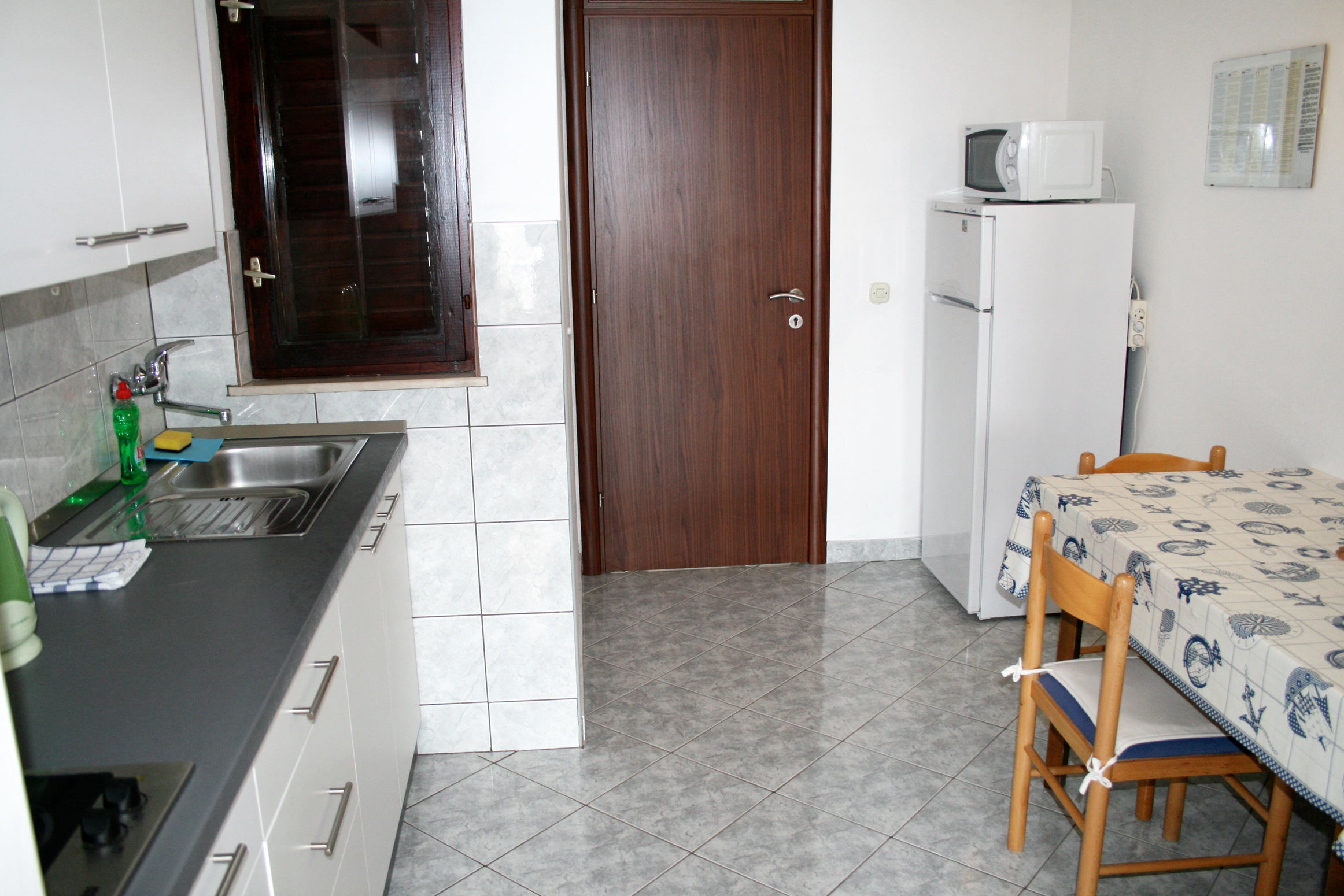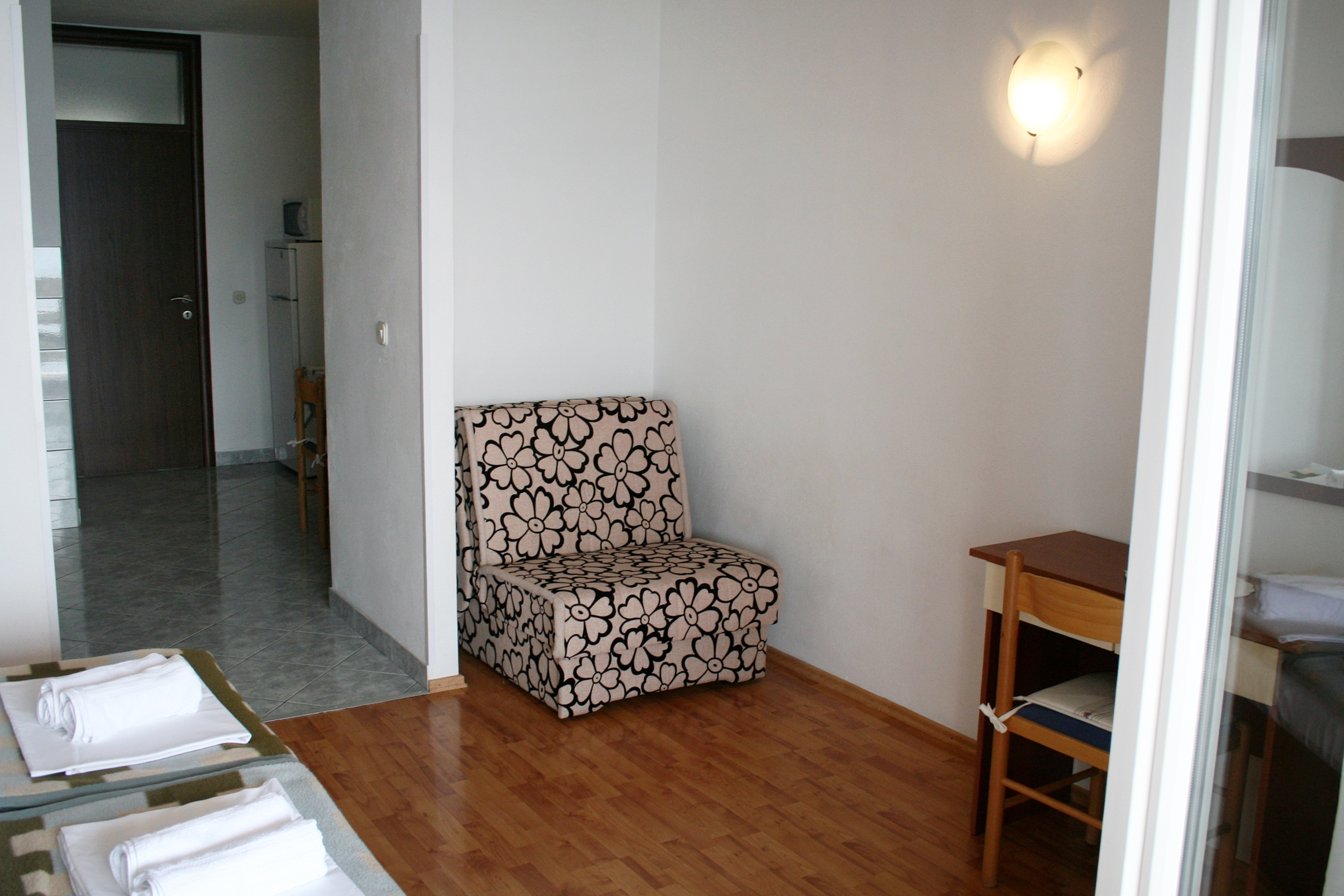 Studio może przyjąć 3 gości. Łóżka znajdują się w sypialniach, których jest 1, na powierzchni 28m2. Goście mają dostęp do tarasu, by korzystać z ciepłych, letnich wieczorów. Z apartamentu typu studio roztacza się widok na morze. Możliwość przygotowywania posiłków poprzez korzystanie ze wspólnego grilla. W kwaterze dozwolony jest pobyt zwierzęcia domowego, za dopłatą. WLICZONE W CENĘ: taksa pobytowa, sprzątanie końcowe, parking, garaż, internet, łóżeczko dziecięce. OBOWIĄZKOWE KOSZTY DODATKOWE: dopłata za krótki termin (procent dopłaty w zalezności od liczby noclegów: 30% - 1, 20% - 2, 10% - 3). NIEOBOWIĄZKOWE KOSZTY DODATKOWE: klimatyzacja (0,50 € za godzinę), zwierzęta domowe (10,00 € za nocleg). Dostępność dodatkowych usług w rezerwowanym terminie oraz ich cenę (jeśli nie jest podana) należy sprawdzić wcześniej. Za dodatowe usługi, które nie zostały uwzględnione w kalkulacji ceny, płaci się bezpośrednio właścicielowi obiektu, pod warunkiem śe gość korzysta z tych usług.