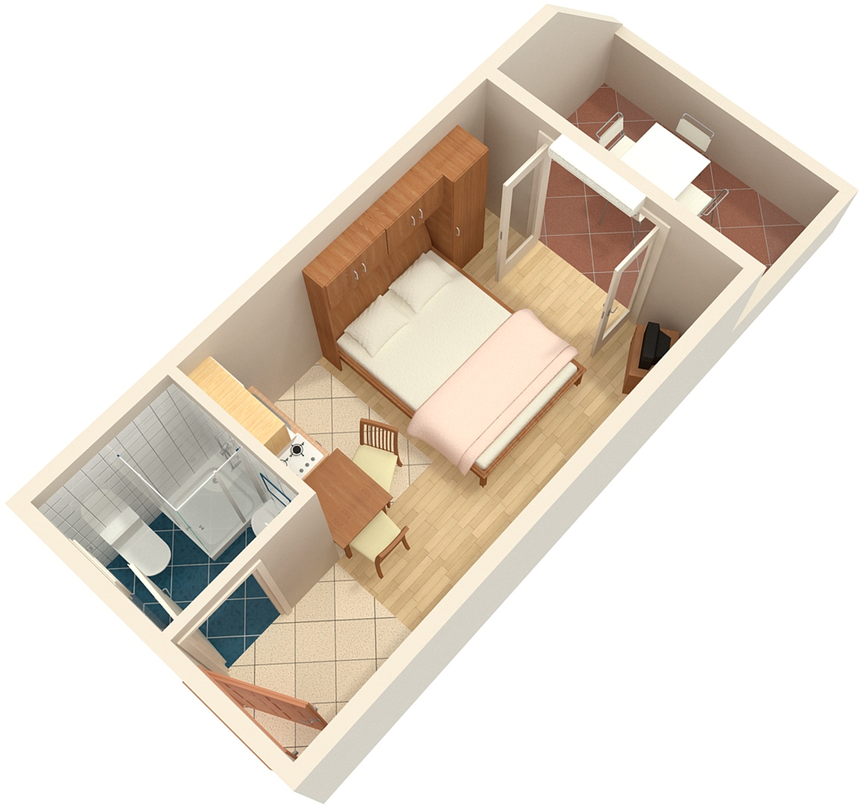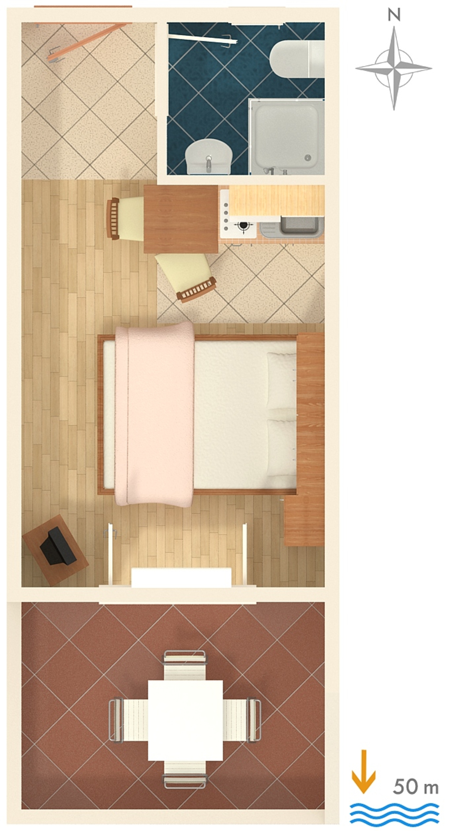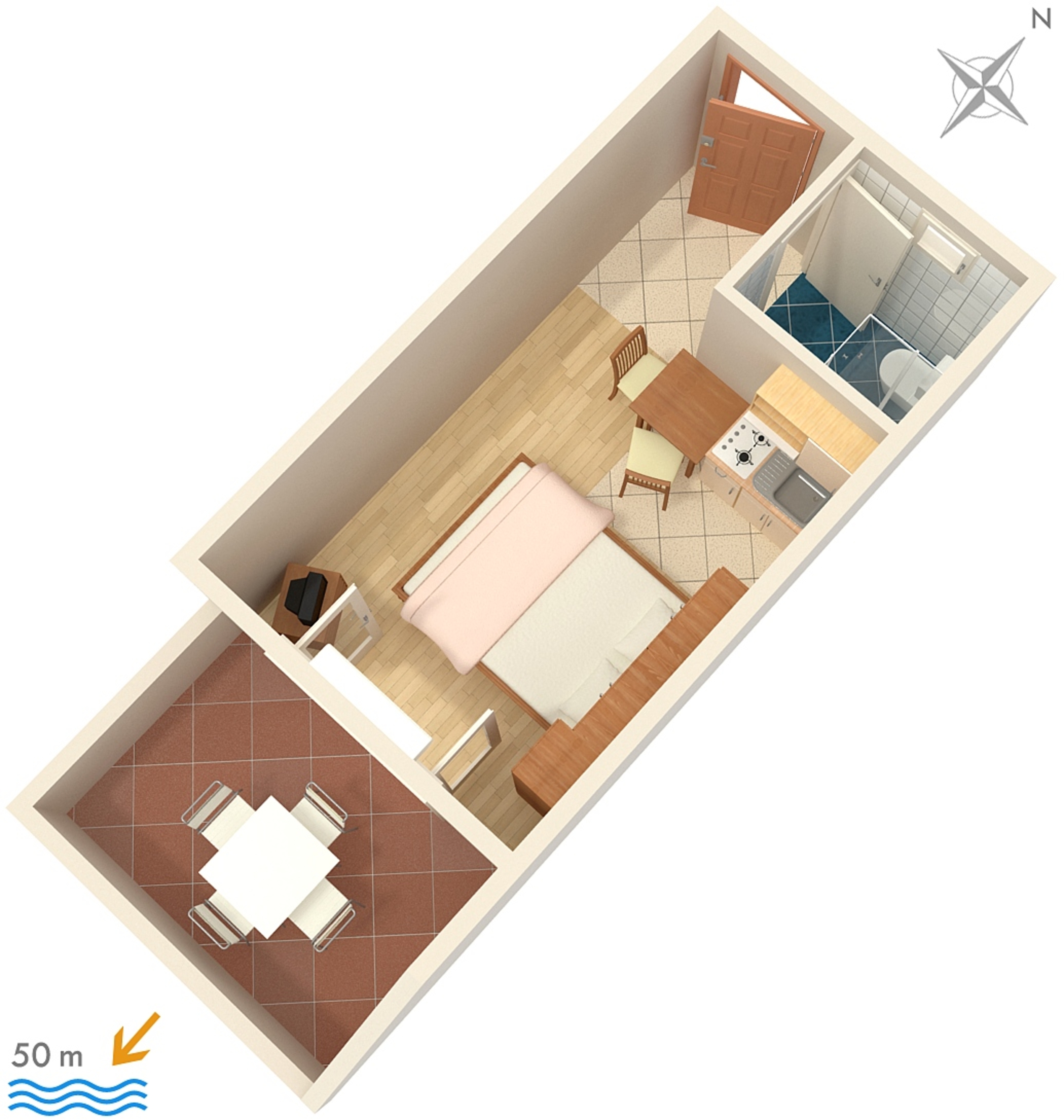 Studio może przyjąć 2 gości. Łóżka znajdują się w sypialniach, których jest 1, na powierzchni 18m2. Goście mają dostęp do tarasu, by korzystać z ciepłych, letnich wieczorów. Z apartamentu typu studio roztacza się widok na morze. Możliwość przygotowywania posiłków poprzez korzystanie ze wspólnego grilla. WLICZONE W CENĘ: taksa pobytowa, sprzątanie końcowe, klimatyzacja, parking, internet, pranie bielizny, łóżeczko dziecięce, żelazko, suszarka do włosów. Dostępność dodatkowych usług w rezerwowanym terminie oraz ich cenę (jeśli nie jest podana) należy sprawdzić wcześniej. Za dodatowe usługi, które nie zostały uwzględnione w kalkulacji ceny, płaci się bezpośrednio właścicielowi obiektu, pod warunkiem śe gość korzysta z tych usług.