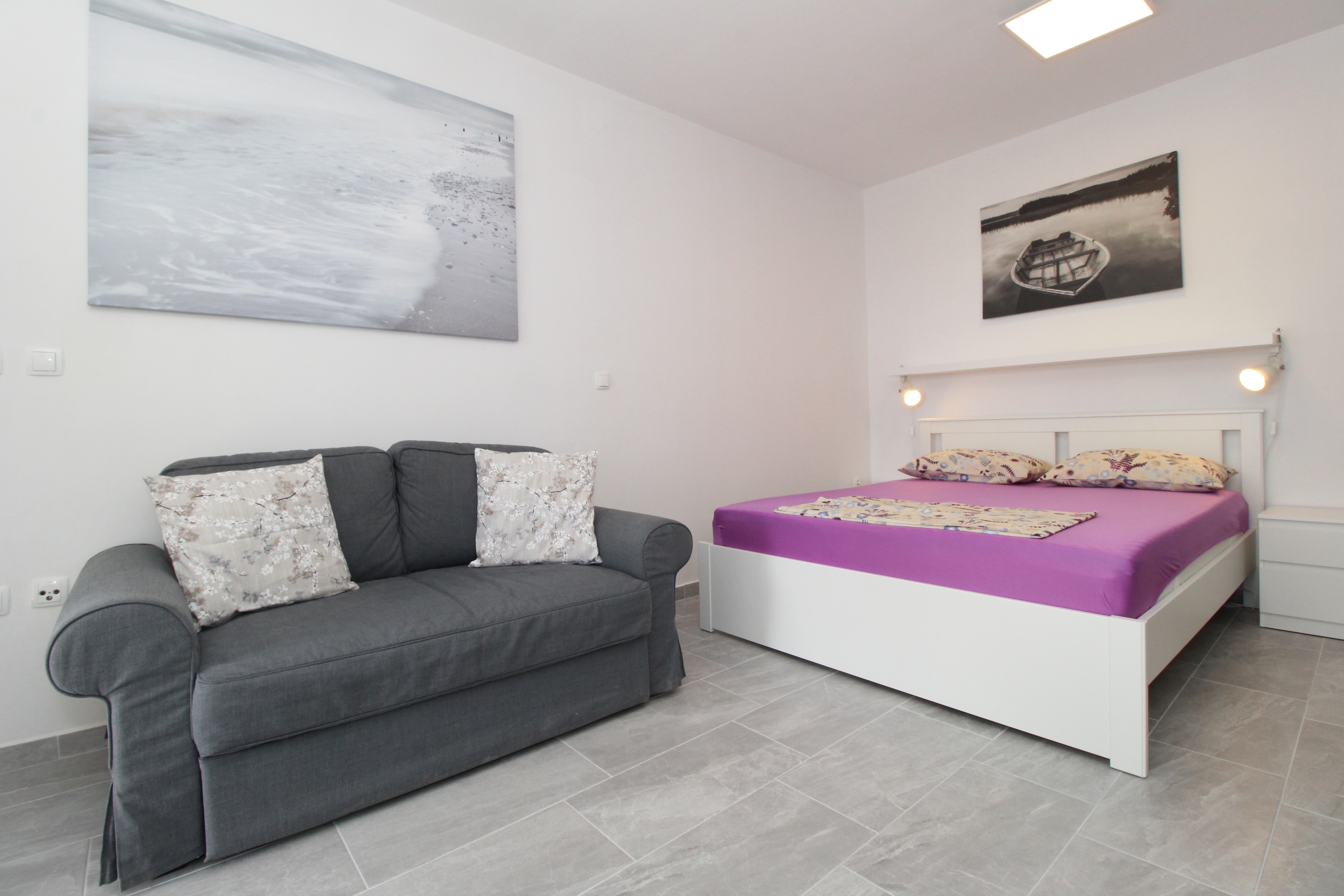 Studio może przyjąć 2 gości. Łóżka znajdują się w sypialniach, których jest 1, na powierzchni 30m2. Goście mają dostęp do tarasu, by korzystać z ciepłych, letnich wieczorów. Z apartamentu typu studio roztacza się widok na morze. Możliwość przygotowywania posiłków poprzez korzystanie ze wspólnego grilla. WLICZONE W CENĘ: taksa pobytowa, sprzątanie końcowe, klimatyzacja, parking, internet, pranie bielizny, łóżeczko dziecięce, żelazko, deska do prasowania, suszarka do włosów. OBOWIĄZKOWE KOSZTY DODATKOWE: dopłata za krótki termin (procent dopłaty w zalezności od liczby noclegów: 30% - 1, 20% - 2, 10% - 3). NIEOBOWIĄZKOWE KOSZTY DODATKOWE: łódź (200,00 € za nocleg). Dostępność dodatkowych usług w rezerwowanym terminie oraz ich cenę (jeśli nie jest podana) należy sprawdzić wcześniej. Za dodatowe usługi, które nie zostały uwzględnione w kalkulacji ceny, płaci się bezpośrednio właścicielowi obiektu, pod warunkiem śe gość korzysta z tych usług.