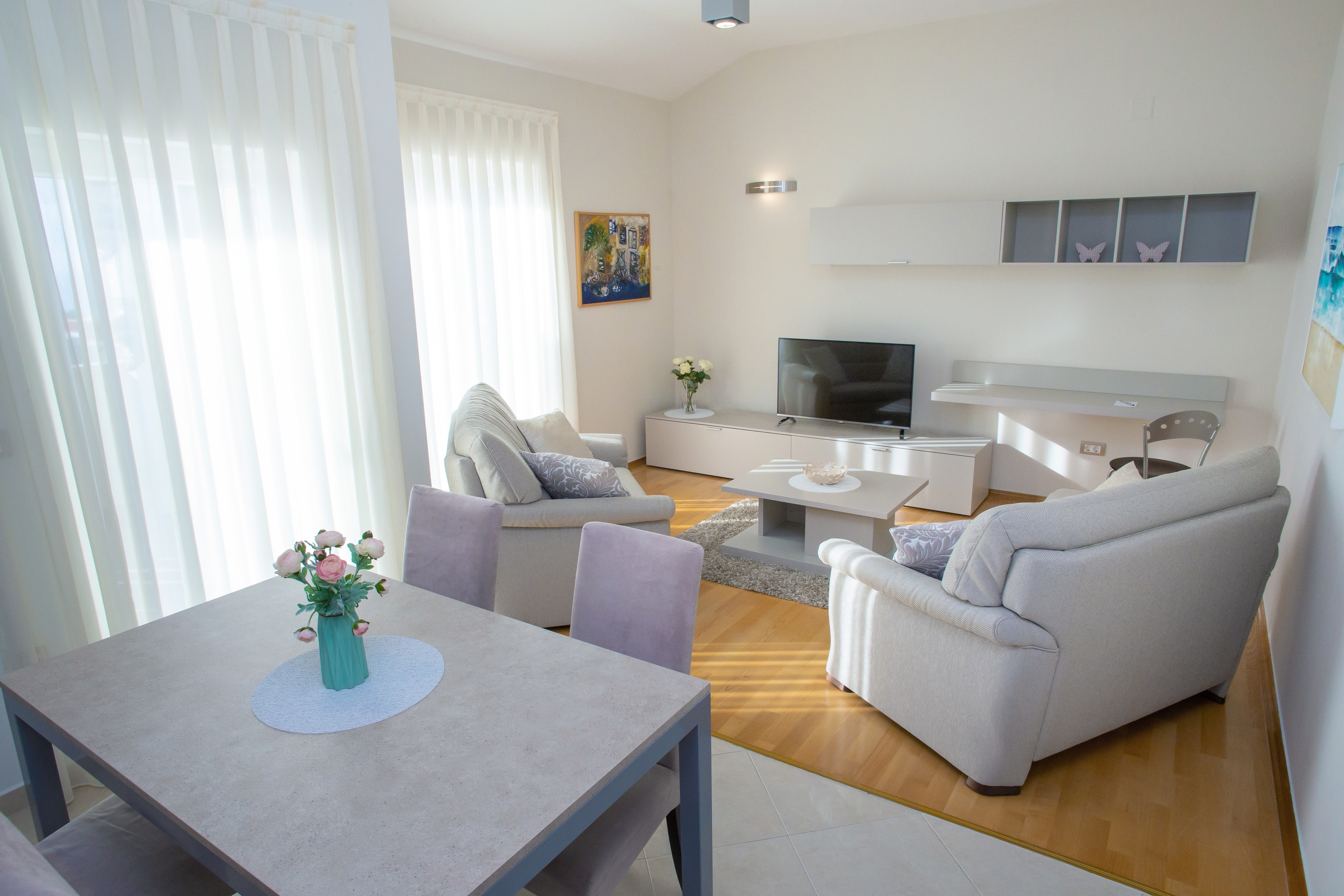 Apartament może przyjąć 4 gości. Łóżka znajdują się w sypialniach, których jest 1, oraz w pokoju dziennym, na powierzchni 55m2. Goście mają dostęp do tarasu, by korzystać z ciepłych, letnich wieczorów. Z apartamentu roztacza się widok na morze. Możliwość przygotowywania posiłków poprzez korzystanie ze wspólnego grilla. W trakcie swojego pobytu goście mogą korzystać ze wspólnego basenu. WLICZONE W CENĘ: taksa pobytowa, sprzątanie końcowe, klimatyzacja, basen, parking, garaż, internet, suszarka do włosów. NIEOBOWIĄZKOWE KOSZTY DODATKOWE: pranie bielizny (10,00 € pranie). Dostępność dodatkowych usług w rezerwowanym terminie oraz ich cenę (jeśli nie jest podana) należy sprawdzić wcześniej. Za dodatowe usługi, które nie zostały uwzględnione w kalkulacji ceny, płaci się bezpośrednio właścicielowi obiektu, pod warunkiem śe gość korzysta z tych usług. Zniżki od ceny podstawowej: bezpłatny dzień 14=13 (przy pobycie, trwającym co najmniej 14 dni, otrzymujecie jeden bezpłatny dzień na pobyt do 31.12.2026).