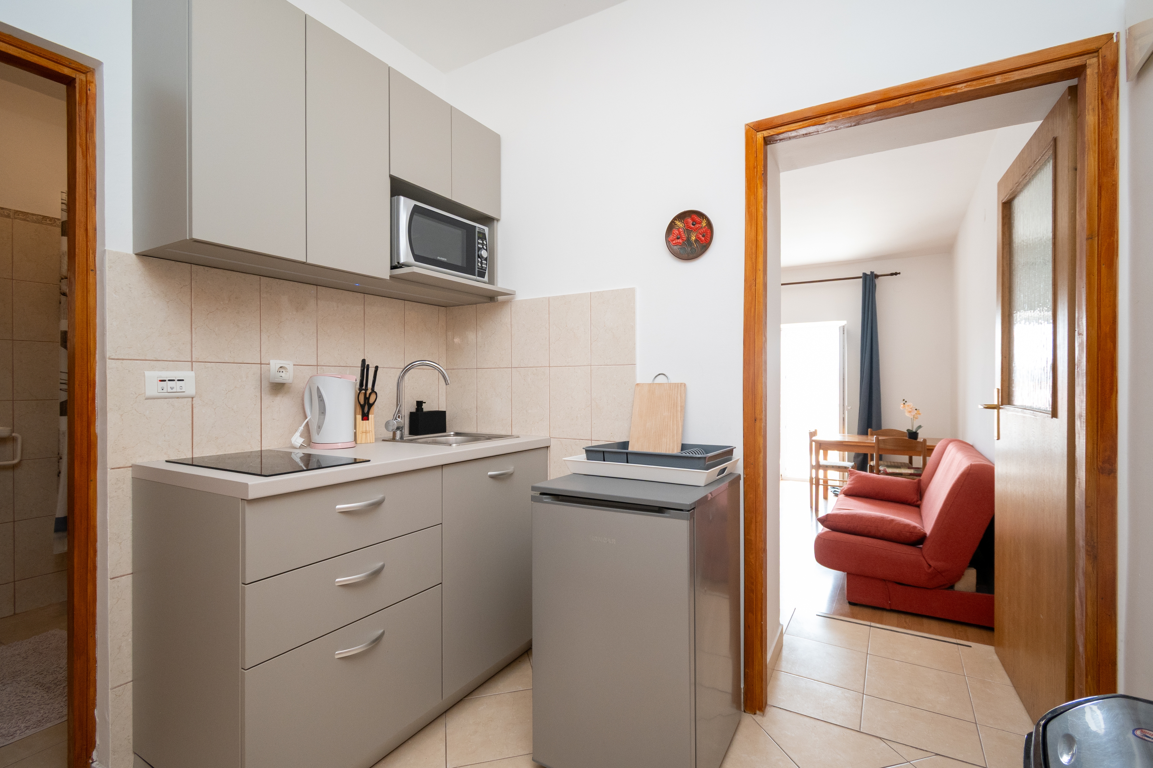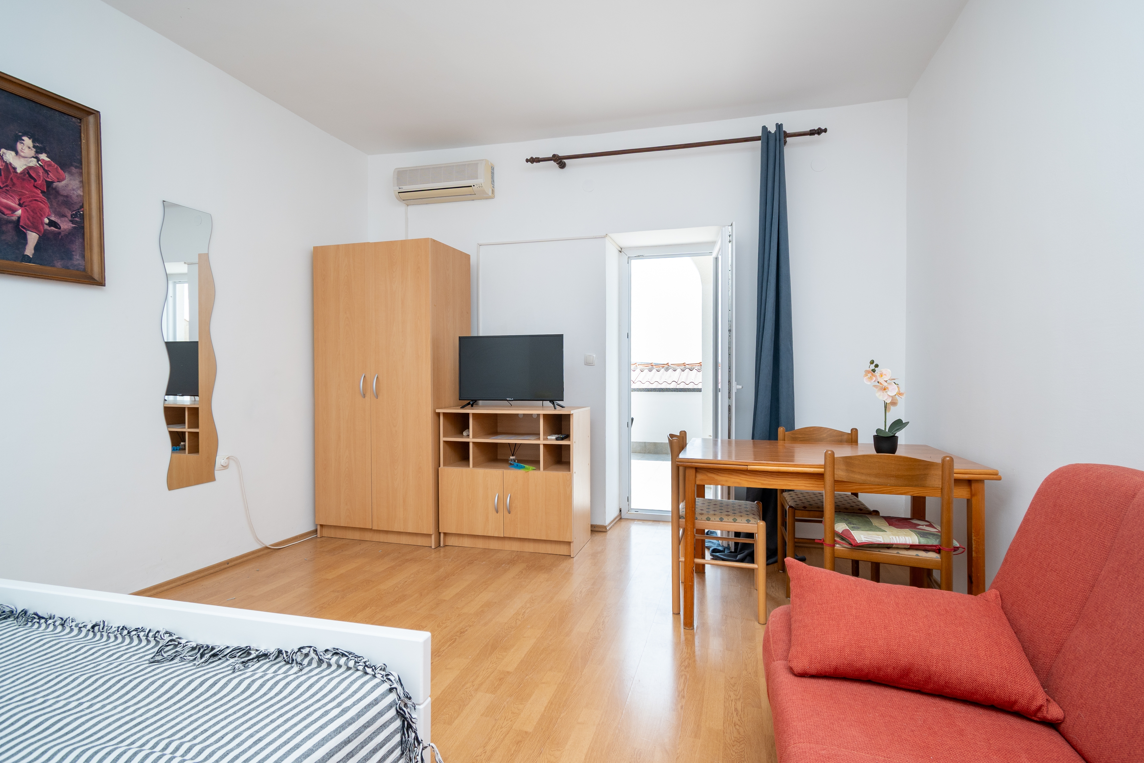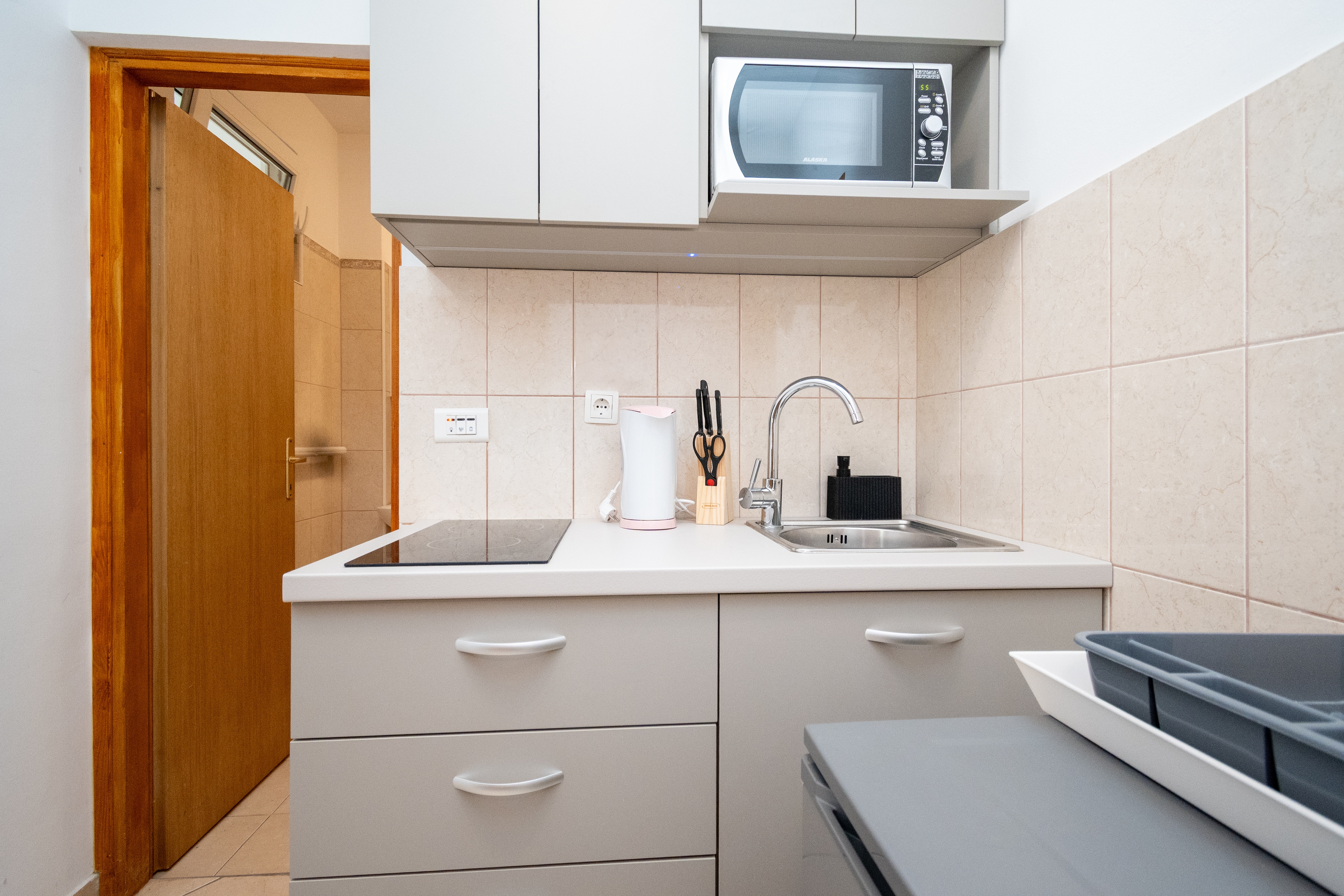 Studio może przyjąć 2 gości. Łóżka znajdują się w sypialniach, których jest 1, na powierzchni 28m2. Goście mają dostęp do tarasu, by korzystać z ciepłych, letnich wieczorów. Z apartamentu typu studio roztacza się widok na morze. Możliwość przygotowywania posiłków poprzez korzystanie ze wspólnego grilla. W trakcie swojego pobytu goście mogą korzystać ze wspólnego basenu. Do kwatery można przyjechać ze zwierzęciem domowym, a usługa jest wliczona w cenę wynajęcia kwatery. W rezerwowanej kwaterze na miejscu jest pobierana kaucja (jej wysokość jest podana na stronie). WLICZONE W CENĘ: taksa pobytowa, sprzątanie końcowe, klimatyzacja, basen, parking, internet, pranie bielizny, zwierzęta domowe, rower, łóżeczko dziecięce, żelazko, deska do prasowania, suszarka do włosów. OBOWIĄZKOWE KOSZTY DODATKOWE: depozyt (200,00 € jednorazowo), dopłata za krótki termin (procent dopłaty w zalezności od liczby noclegów: 30% - 1, 20% - 2, 10% - 3). Dostępność dodatkowych usług w rezerwowanym terminie oraz ich cenę (jeśli nie jest podana) należy sprawdzić wcześniej. Za dodatowe usługi, które nie zostały uwzględnione w kalkulacji ceny, płaci się bezpośrednio właścicielowi obiektu, pod warunkiem śe gość korzysta z tych usług. Zniżki od ceny podstawowej: bezpłatny dzień 21=19 (przy pobycie, trwającym co najmniej 21 dni, trzymujecie dwa bezpłatne dni na pobyt do 31.12.2026).