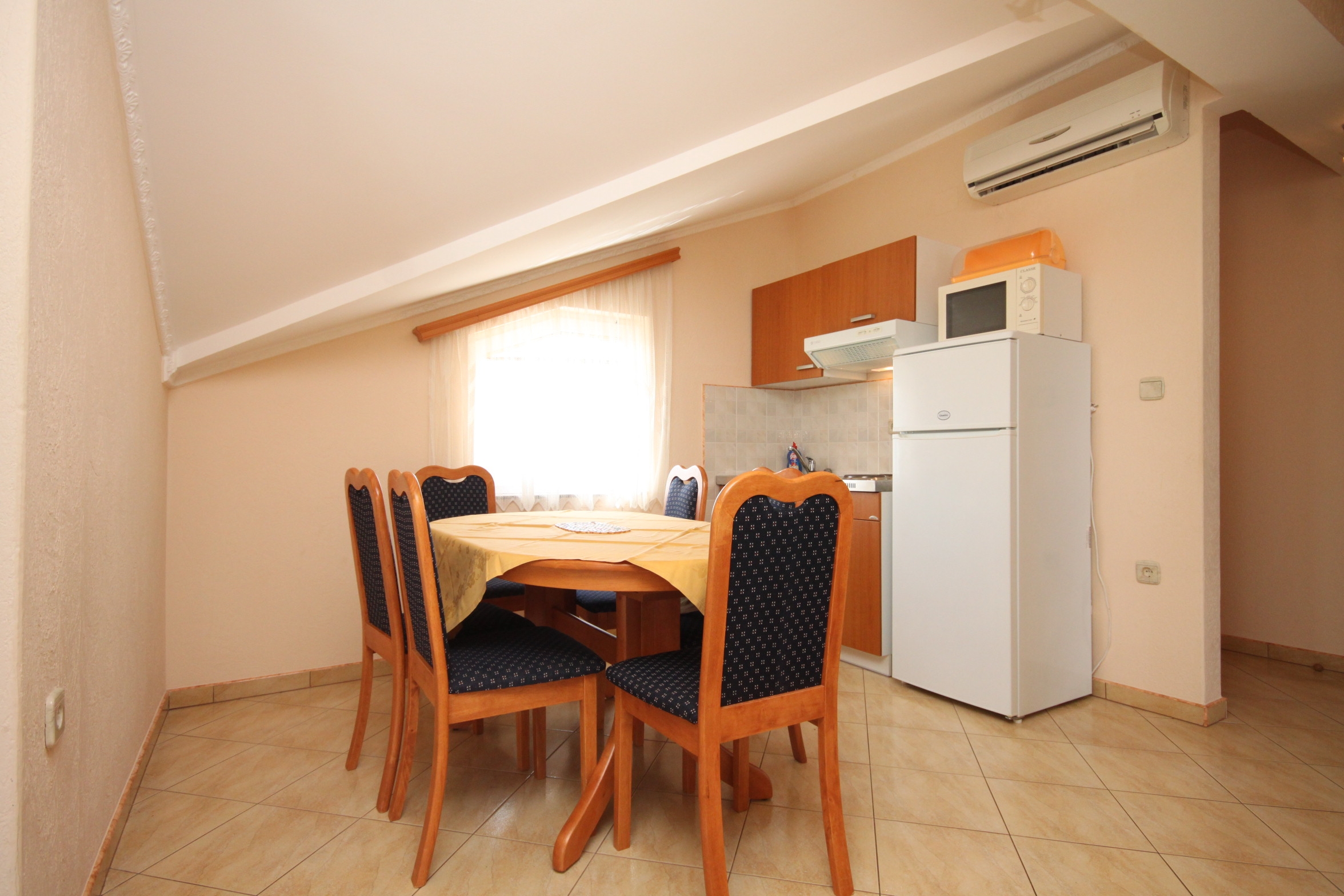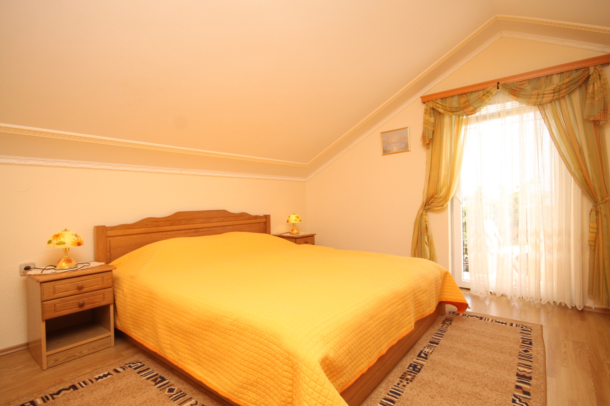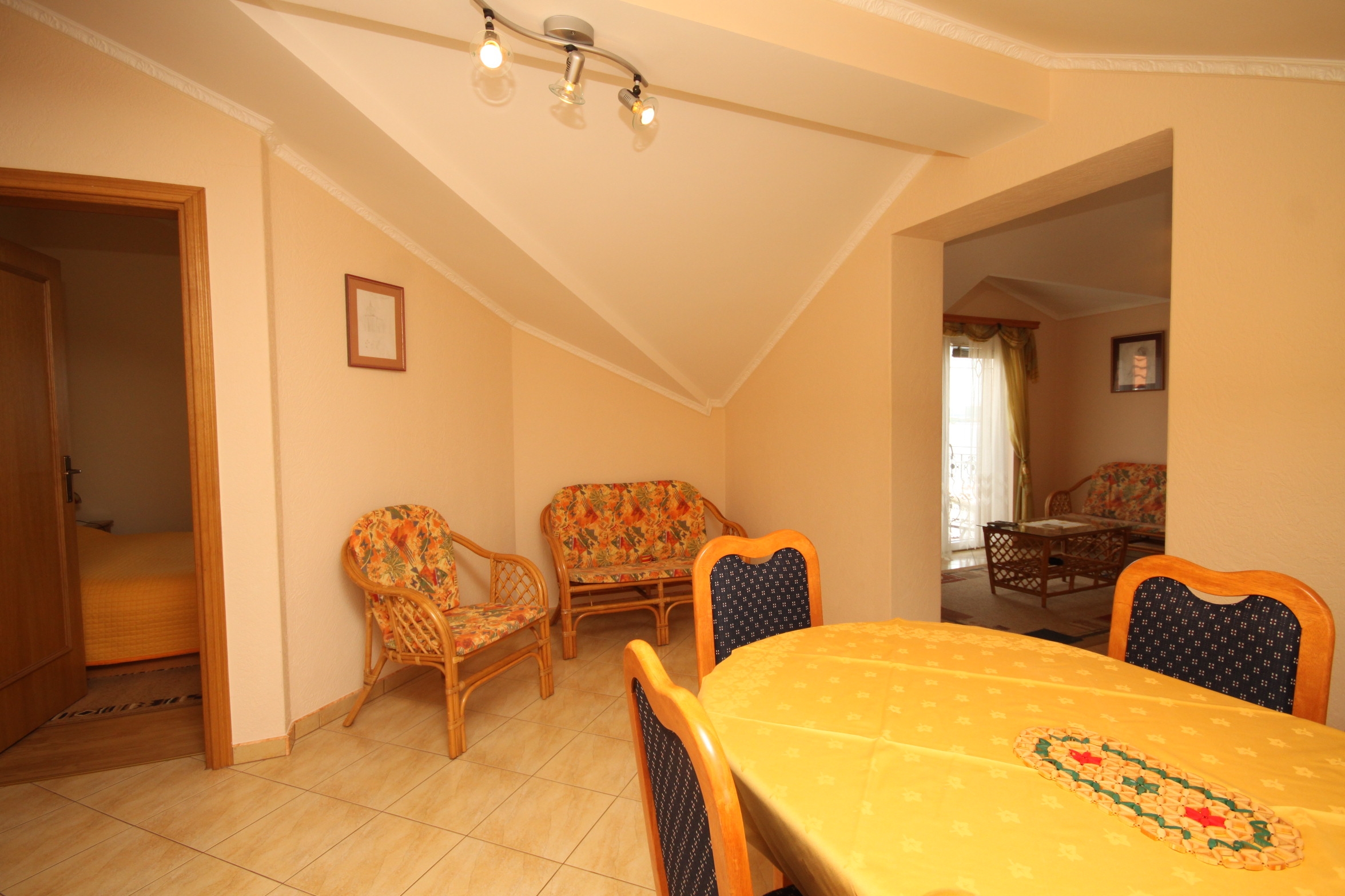 Apartament może przyjąć 6 gości. Łóżka znajdują się w sypialniach, których jest 2, na powierzchni 63m2. Goście mają dostęp do tarasu, by korzystać z ciepłych, letnich wieczorów. Z apartamentu roztacza się widok na morze. Możliwość przygotowywania posiłków poprzez korzystanie ze wspólnego grilla. WLICZONE W CENĘ: sprzątanie końcowe, klimatyzacja, parking, internet, żelazko, deska do prasowania, suszarka do włosów, leżaki. OBOWIĄZKOWE KOSZTY DODATKOWE: taksa pobytowa (dorośli 0,93 € - 1,50 € noclegosoba, zniżka dla dzieci w wieku 12 - 17 lat), dopłata za krótki termin (procent dopłaty w zalezności od liczby noclegów: 30% - 1, 20% - 2, 10% - 3). Dostępność dodatkowych usług w rezerwowanym terminie oraz ich cenę (jeśli nie jest podana) należy sprawdzić wcześniej. Za dodatowe usługi, które nie zostały uwzględnione w kalkulacji ceny, płaci się bezpośrednio właścicielowi obiektu, pod warunkiem śe gość korzysta z tych usług.