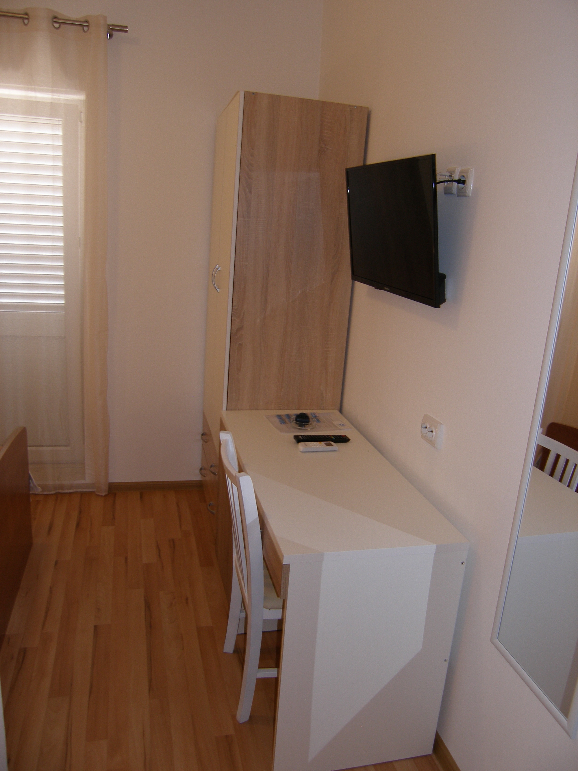 Pokój może przyjąć 2 gości. Łóżka znajdują się w sypialniach, których jest 1, na powierzchni 12m2. Goście mają dostęp do balkonu, by korzystać z ciepłych, letnich wieczorów. Z pokoju roztacza się widok na morze. Rezerwowana kwatera to pokój z własną łazienką, bez możliwości korzystania z kuchni. WLICZONE W CENĘ: taksa pobytowa, sprzątanie końcowe, klimatyzacja, parking, internet, łóżeczko dziecięce, suszarka do włosów. OBOWIĄZKOWE KOSZTY DODATKOWE: dopłata za krótki termin (procent dopłaty w zalezności od liczby noclegów: 30% - 1, 20% - 2, 10% - 3). NIEOBOWIĄZKOWE KOSZTY DODATKOWE: pranie bielizny (2,00 € pranie). Dostępność dodatkowych usług w rezerwowanym terminie oraz ich cenę (jeśli nie jest podana) należy sprawdzić wcześniej. Za dodatowe usługi, które nie zostały uwzględnione w kalkulacji ceny, płaci się bezpośrednio właścicielowi obiektu, pod warunkiem śe gość korzysta z tych usług. Zniżki od ceny podstawowej: bezpłatny dzień 14=13 (przy pobycie, trwającym co najmniej 14 dni, otrzymujecie jeden bezpłatny dzień na pobyt do 31.12.2026).
