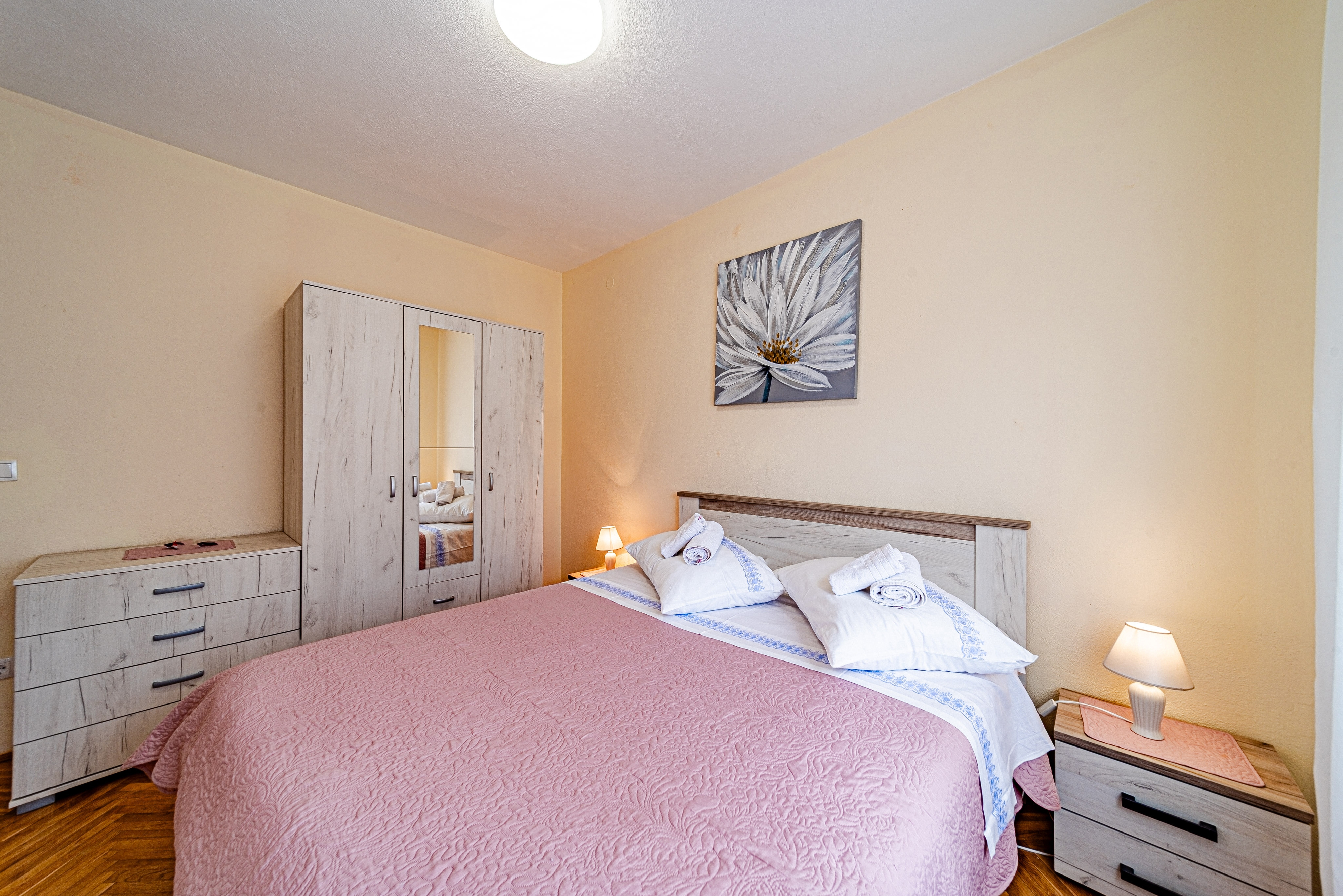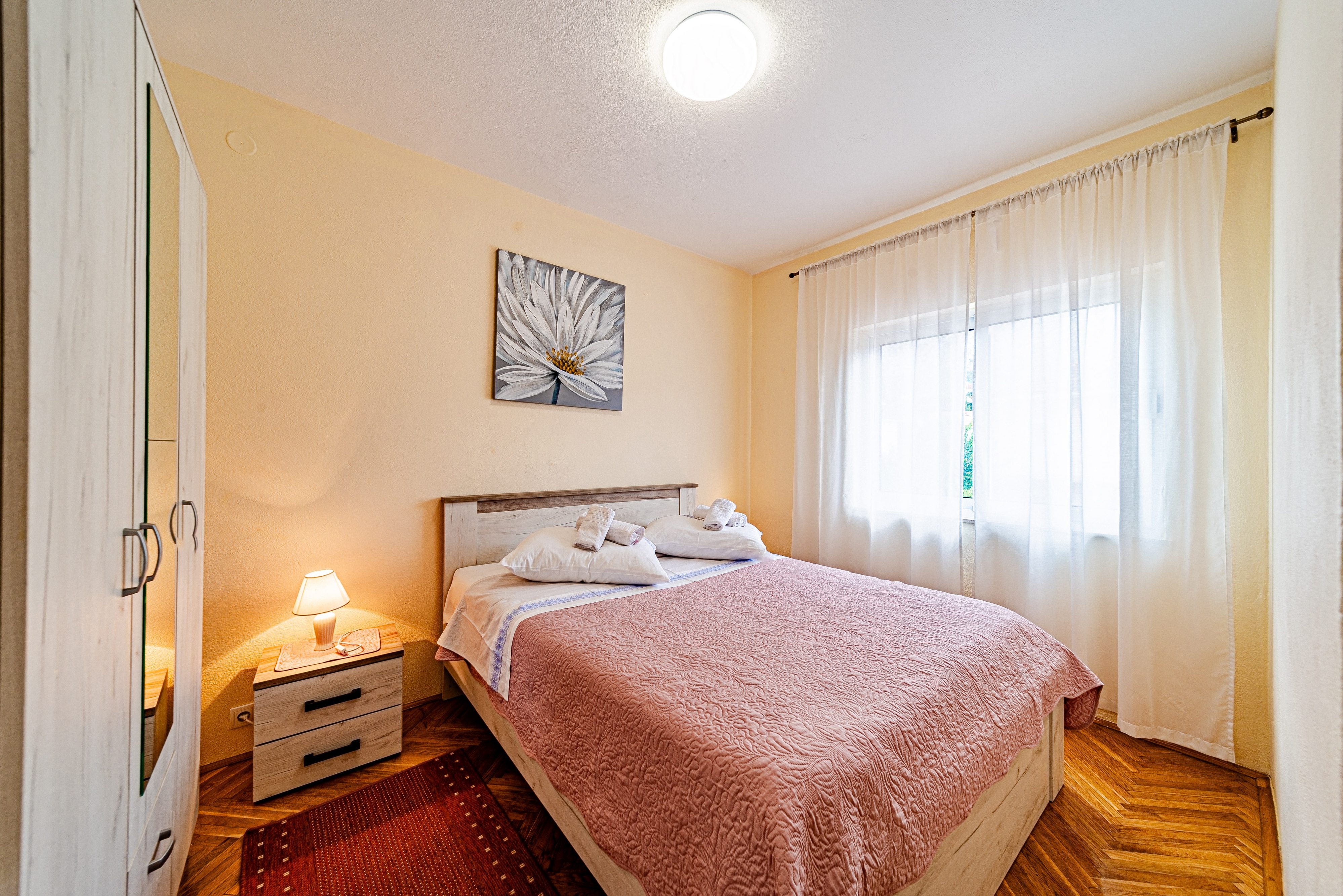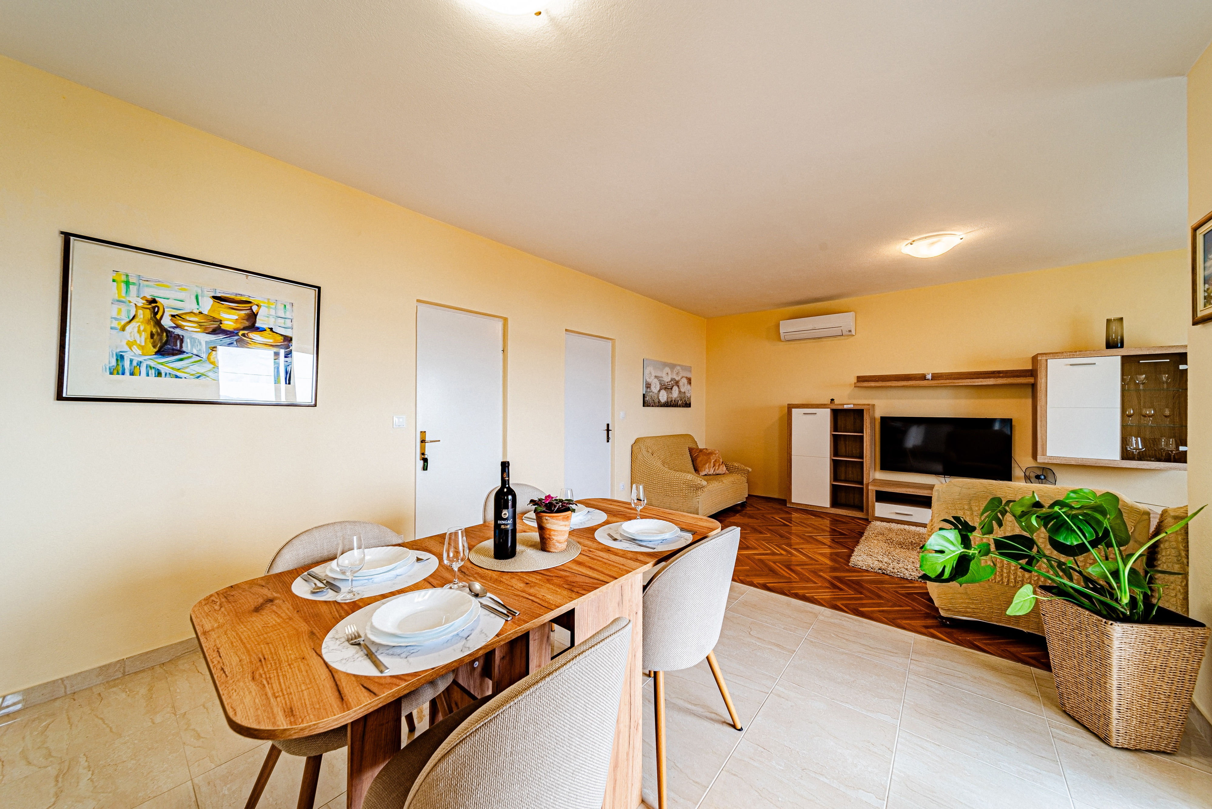 Apartament może przyjąć 4 gości. Łóżka znajdują się w sypialniach, których jest 2, na powierzchni 63m2. Goście mają dostęp do tarasu, by korzystać z ciepłych, letnich wieczorów. Z apartamentu roztacza się widok na morze. Możliwość przygotowywania posiłków poprzez korzystanie ze wspólnego grilla. WLICZONE W CENĘ: taksa pobytowa, sprzątanie końcowe, klimatyzacja, parking, internet, pranie bielizny, żelazko, deska do prasowania, suszarka do włosów. Dostępność dodatkowych usług w rezerwowanym terminie oraz ich cenę (jeśli nie jest podana) należy sprawdzić wcześniej. Za dodatowe usługi, które nie zostały uwzględnione w kalkulacji ceny, płaci się bezpośrednio właścicielowi obiektu, pod warunkiem śe gość korzysta z tych usług.