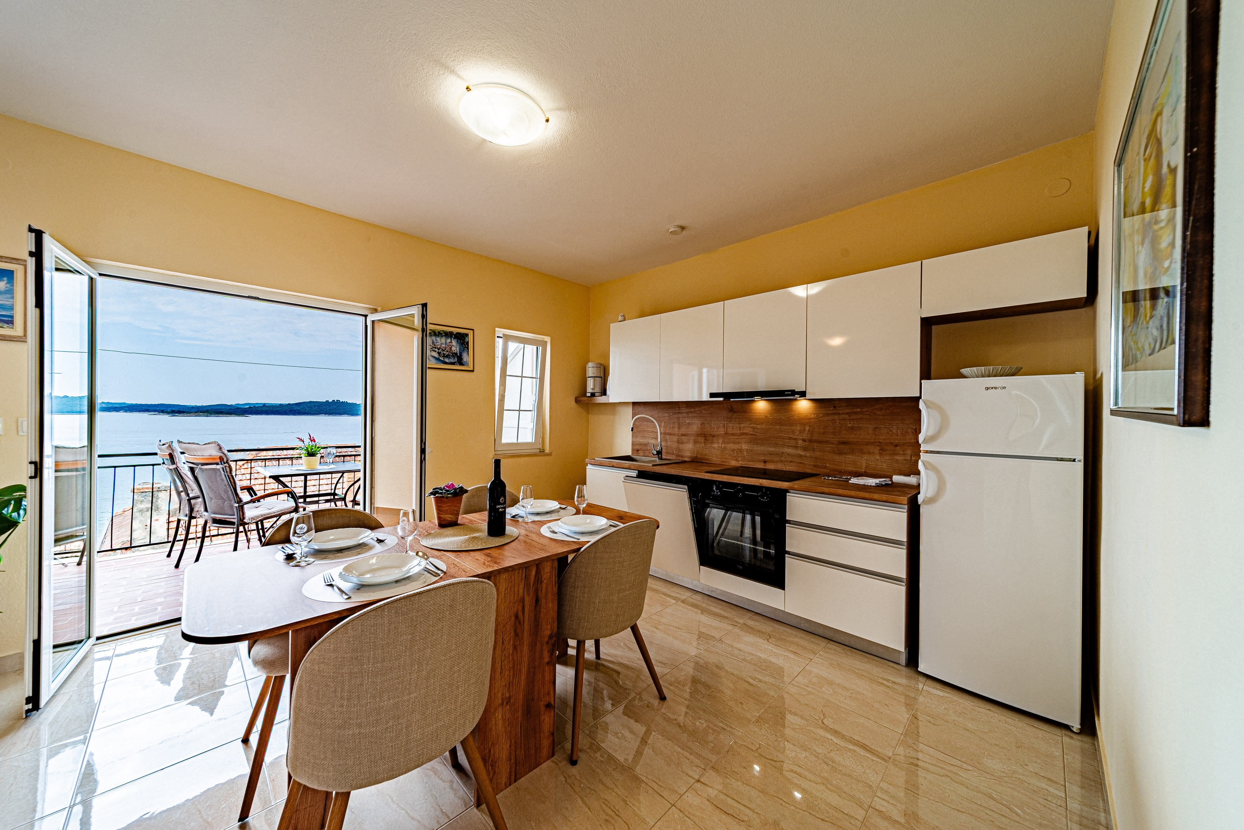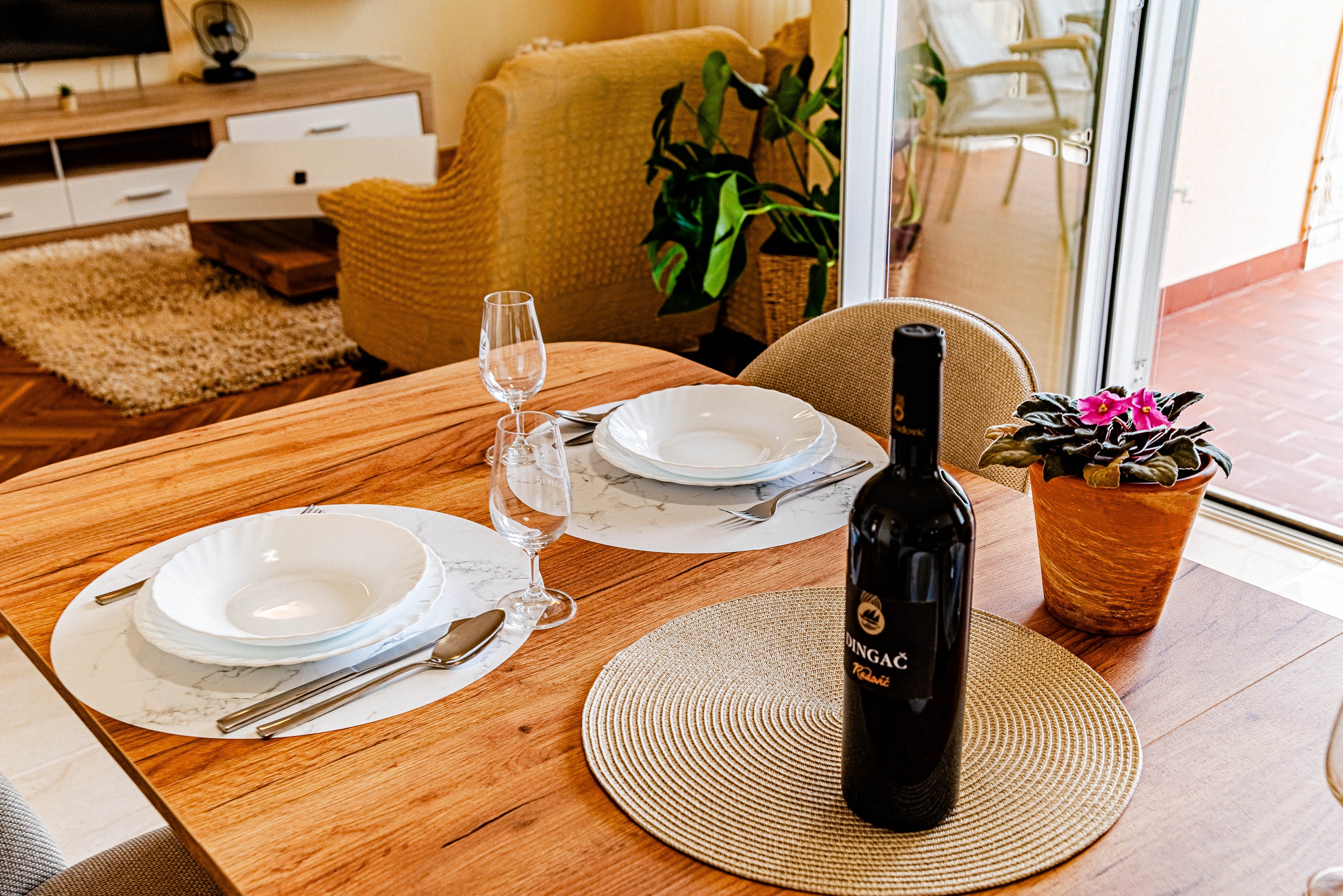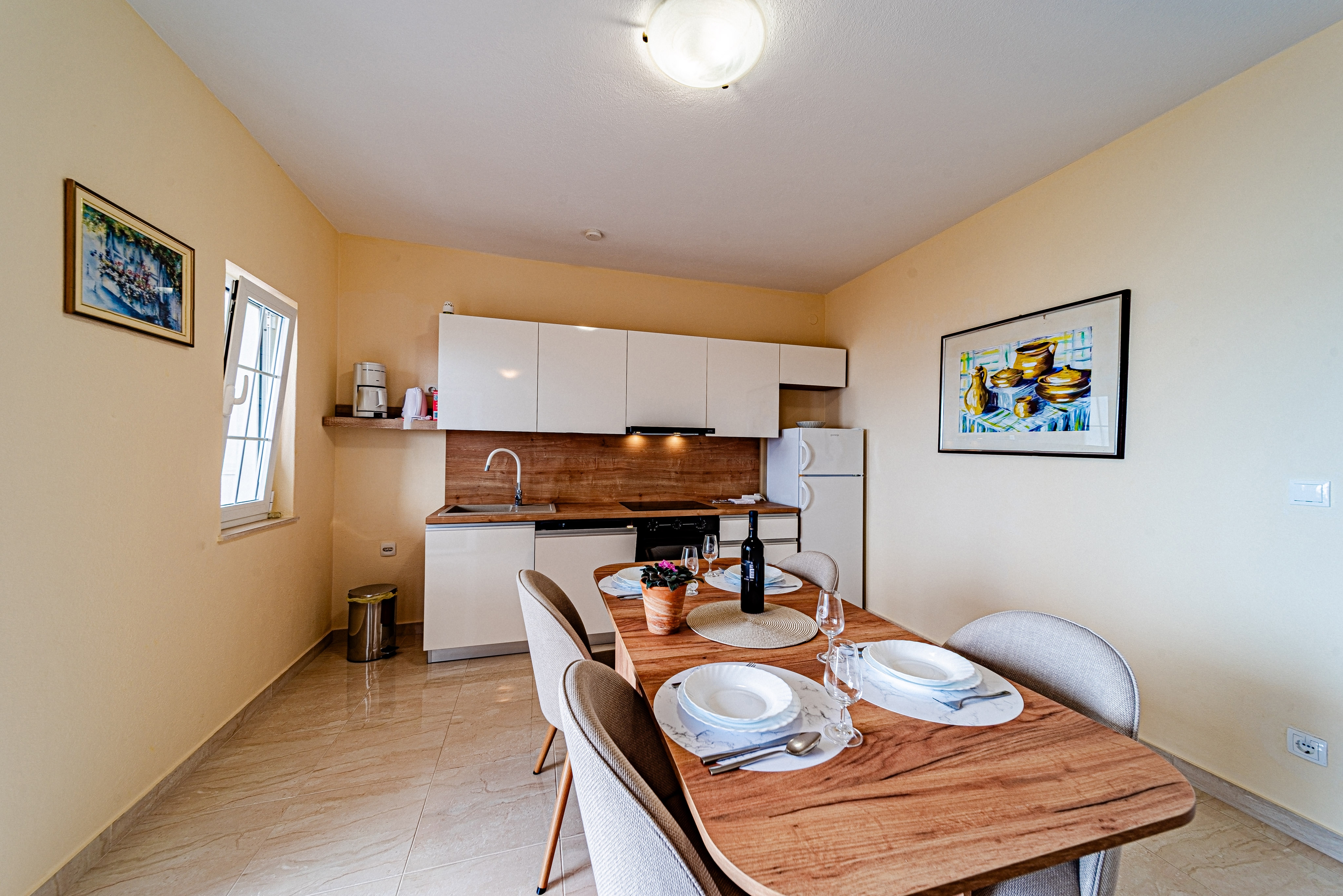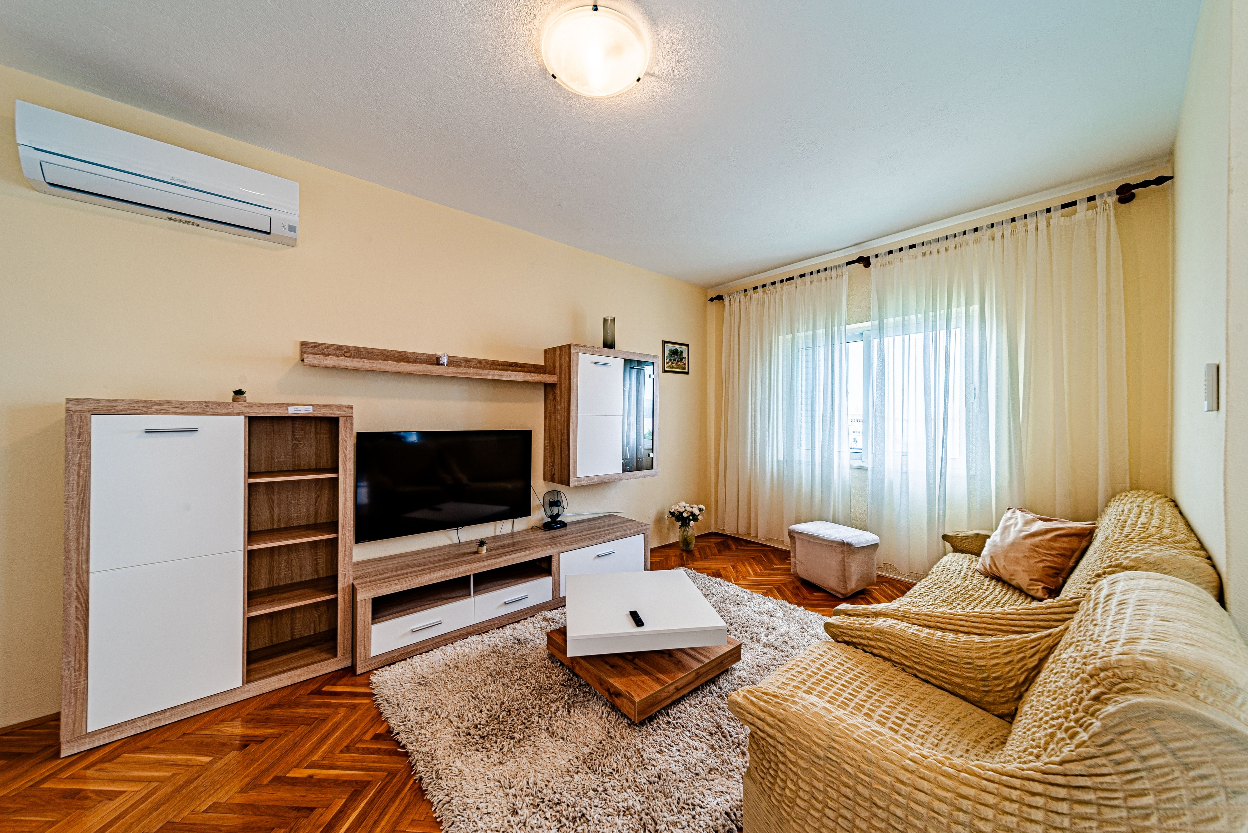 Apartament może przyjąć 4 gości. Łóżka znajdują się w sypialniach, których jest 2, na powierzchni 63m2. Goście mają dostęp do tarasu, by korzystać z ciepłych, letnich wieczorów. Z apartamentu roztacza się widok na morze. Możliwość przygotowywania posiłków poprzez korzystanie ze wspólnego grilla. WLICZONE W CENĘ: taksa pobytowa, sprzątanie końcowe, klimatyzacja, parking, internet, pranie bielizny, żelazko, deska do prasowania, suszarka do włosów. Dostępność dodatkowych usług w rezerwowanym terminie oraz ich cenę (jeśli nie jest podana) należy sprawdzić wcześniej. Za dodatowe usługi, które nie zostały uwzględnione w kalkulacji ceny, płaci się bezpośrednio właścicielowi obiektu, pod warunkiem śe gość korzysta z tych usług.