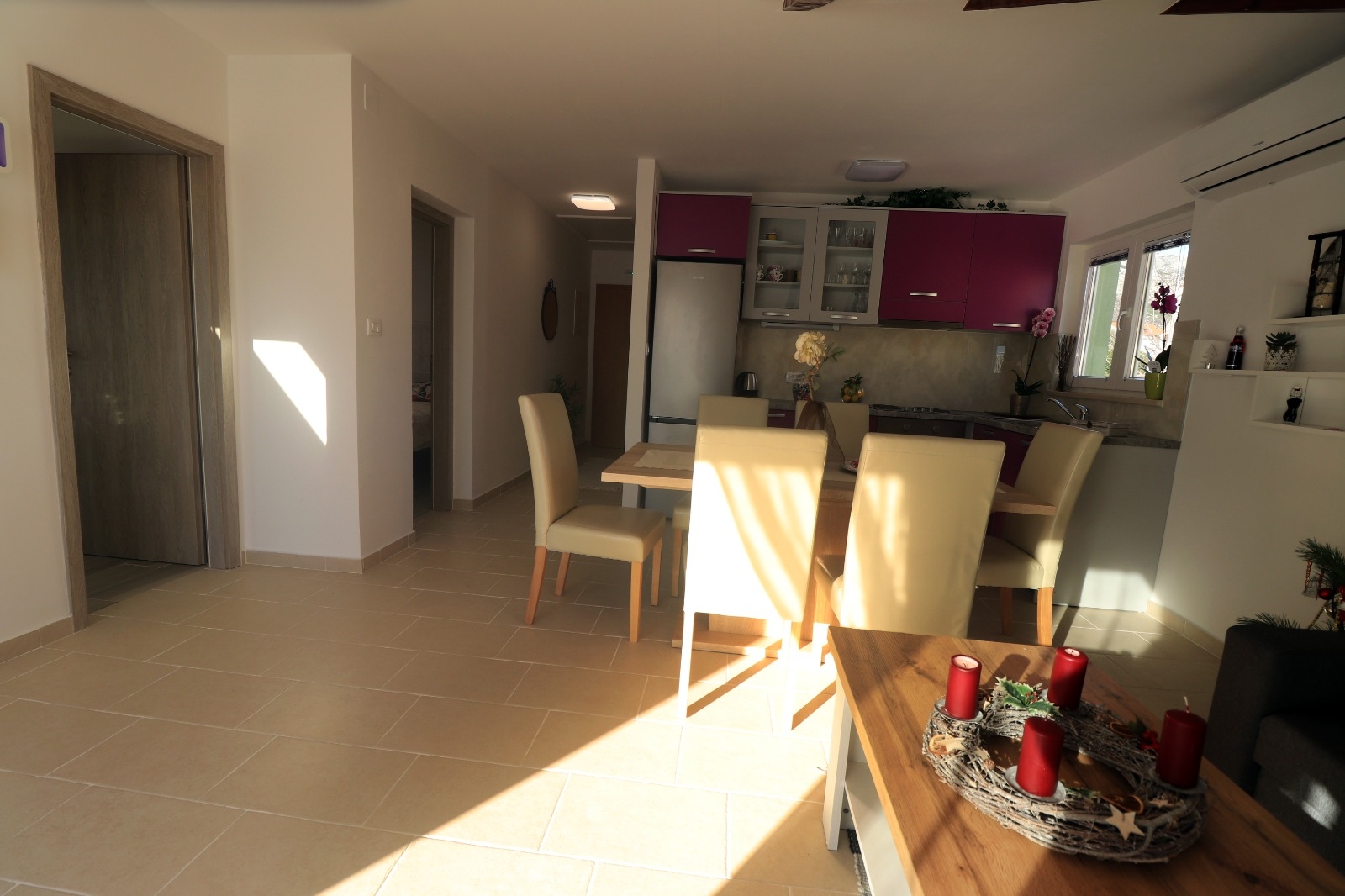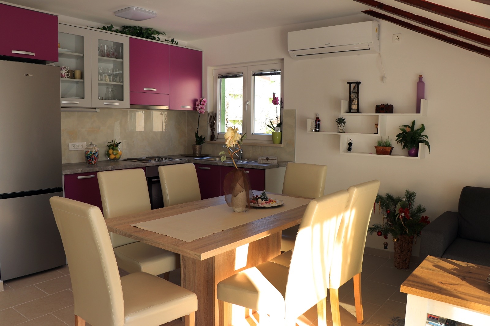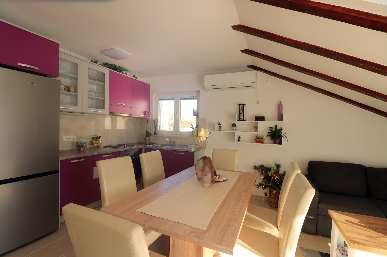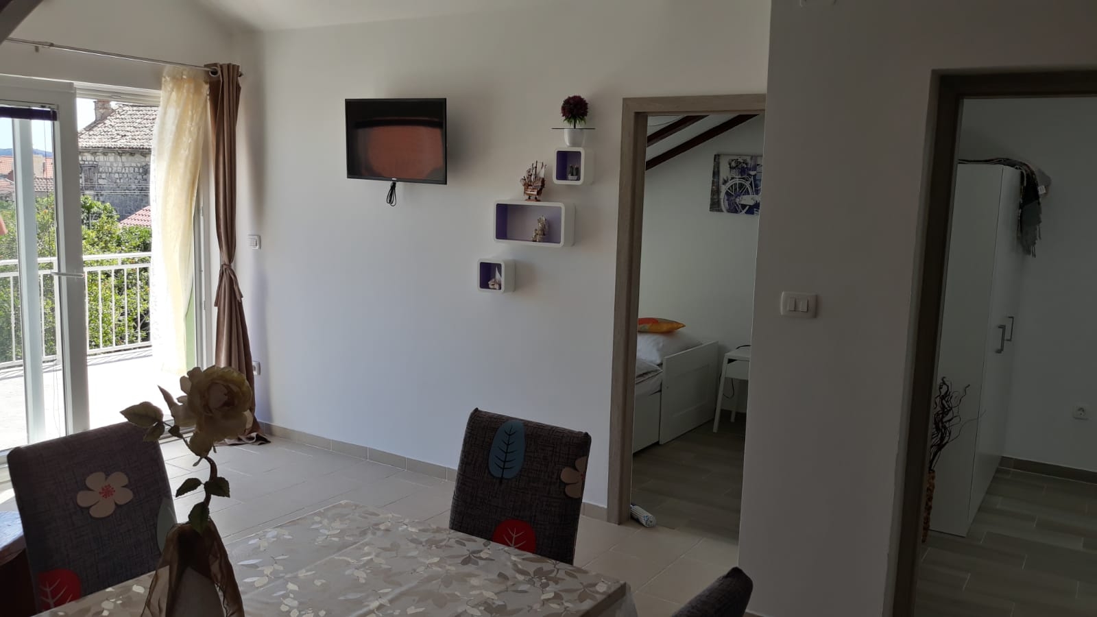 Apartament może przyjąć 6 gości. Łóżka znajdują się w sypialniach, których jest 2, oraz w pokoju dziennym, na powierzchni 62m2. Goście mają dostęp do tarasu, by korzystać z ciepłych, letnich wieczorów. Z apartamentu roztacza się widok na morze. Możliwość przygotowywania posiłków poprzez korzystanie ze wspólnego grilla. W kwaterze dozwolony jest pobyt zwierzęcia domowego, za dopłatą. WLICZONE W CENĘ: taksa pobytowa, sprzątanie końcowe, klimatyzacja, parking, internet, łóżeczko dziecięce, żelazko, deska do prasowania, suszarka do włosów. NIEOBOWIĄZKOWE KOSZTY DODATKOWE: zwierzęta domowe (5,00 € za nocleg). Dostępność dodatkowych usług w rezerwowanym terminie oraz ich cenę (jeśli nie jest podana) należy sprawdzić wcześniej. Za dodatowe usługi, które nie zostały uwzględnione w kalkulacji ceny, płaci się bezpośrednio właścicielowi obiektu, pod warunkiem śe gość korzysta z tych usług.