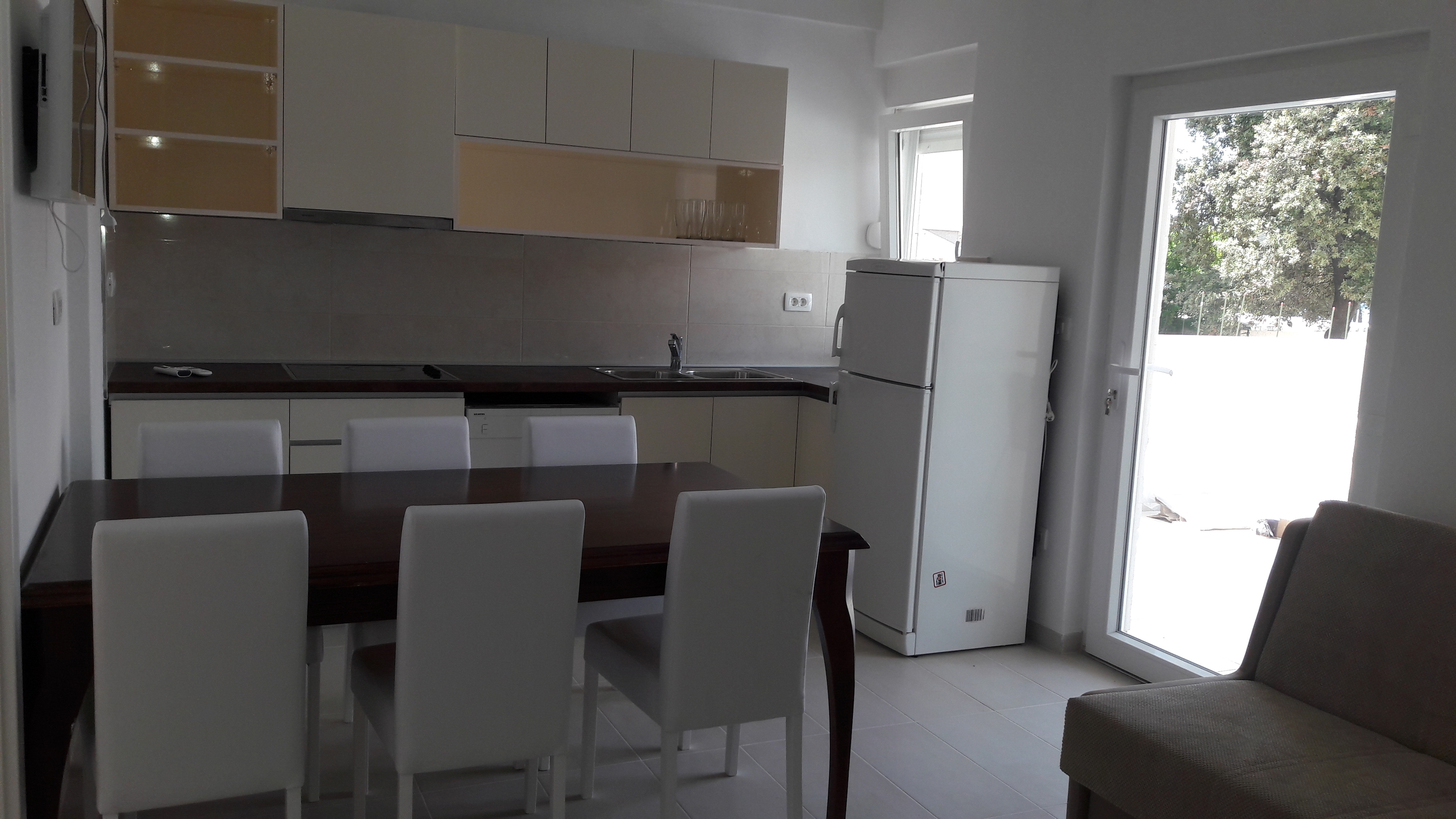 Apartament może przyjąć 7 gości. Łóżka znajdują się w sypialniach, których jest 3, na powierzchni 58m2. Goście mają dostęp do tarasu, by korzystać z ciepłych, letnich wieczorów. Możliwość przygotowywania posiłków poprzez korzystanie ze wspólnego grilla. W kwaterze dozwolony jest pobyt zwierzęcia domowego, za dopłatą. WLICZONE W CENĘ: taksa pobytowa, sprzątanie końcowe, parking, internet, miejsce do cumowania łodzi, rower, żelazko, deska do prasowania, suszarka do włosów. OBOWIĄZKOWE KOSZTY DODATKOWE: dopłata za krótki termin (procent dopłaty w zalezności od liczby noclegów: 30% - 1, 20% - 2, 10% - 3). NIEOBOWIĄZKOWE KOSZTY DODATKOWE: klimatyzacja (8,00 € za nocleg), pranie bielizny (3,00 € pranie), zwierzęta domowe (5,00 € za nocleg). Dostępność dodatkowych usług w rezerwowanym terminie oraz ich cenę (jeśli nie jest podana) należy sprawdzić wcześniej. Za dodatowe usługi, które nie zostały uwzględnione w kalkulacji ceny, płaci się bezpośrednio właścicielowi obiektu, pod warunkiem śe gość korzysta z tych usług. Zniżki od ceny podstawowej: bezpłatny dzień 14=13 (przy pobycie, trwającym co najmniej 14 dni, otrzymujecie jeden bezpłatny dzień na pobyt do 31.12.2026).