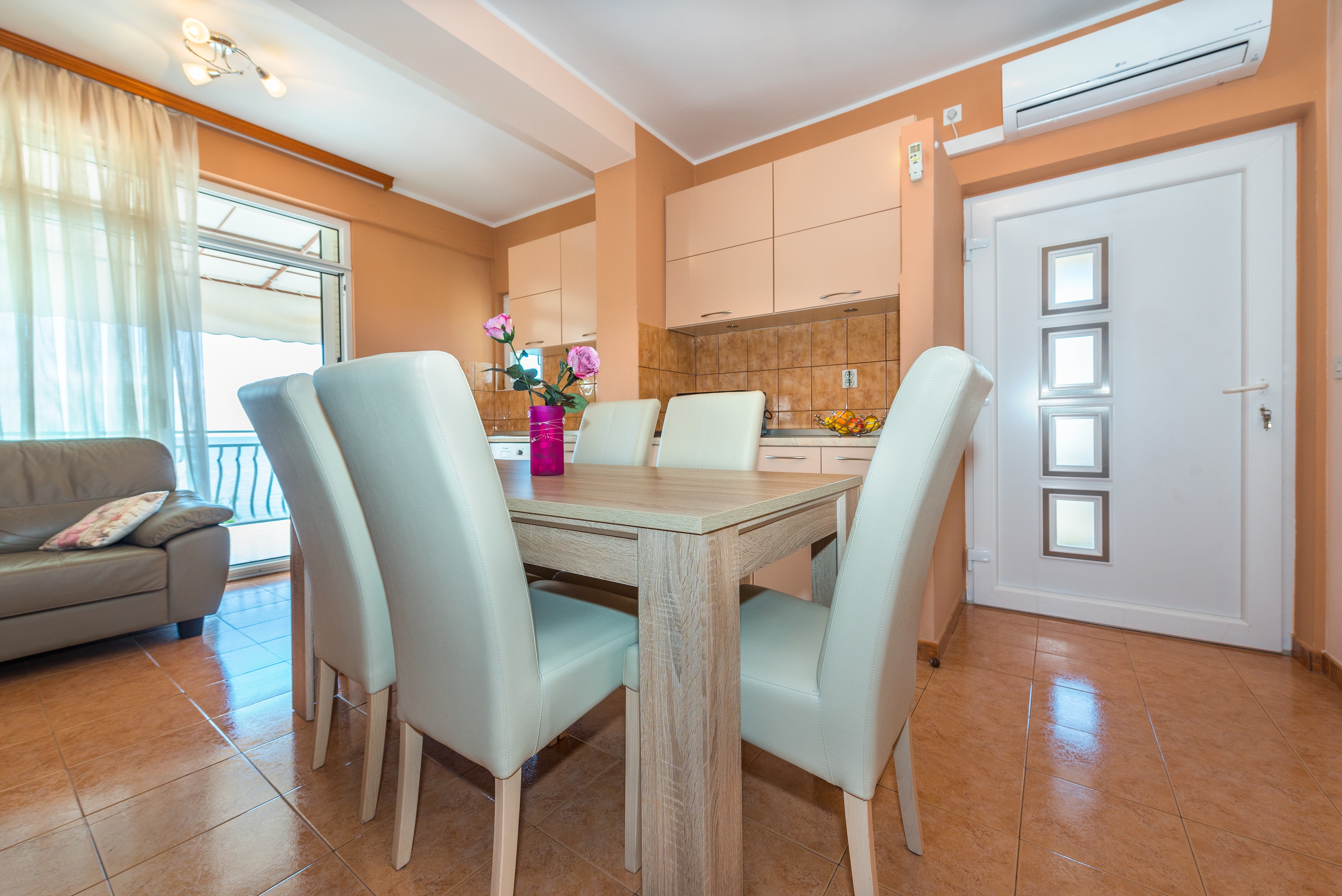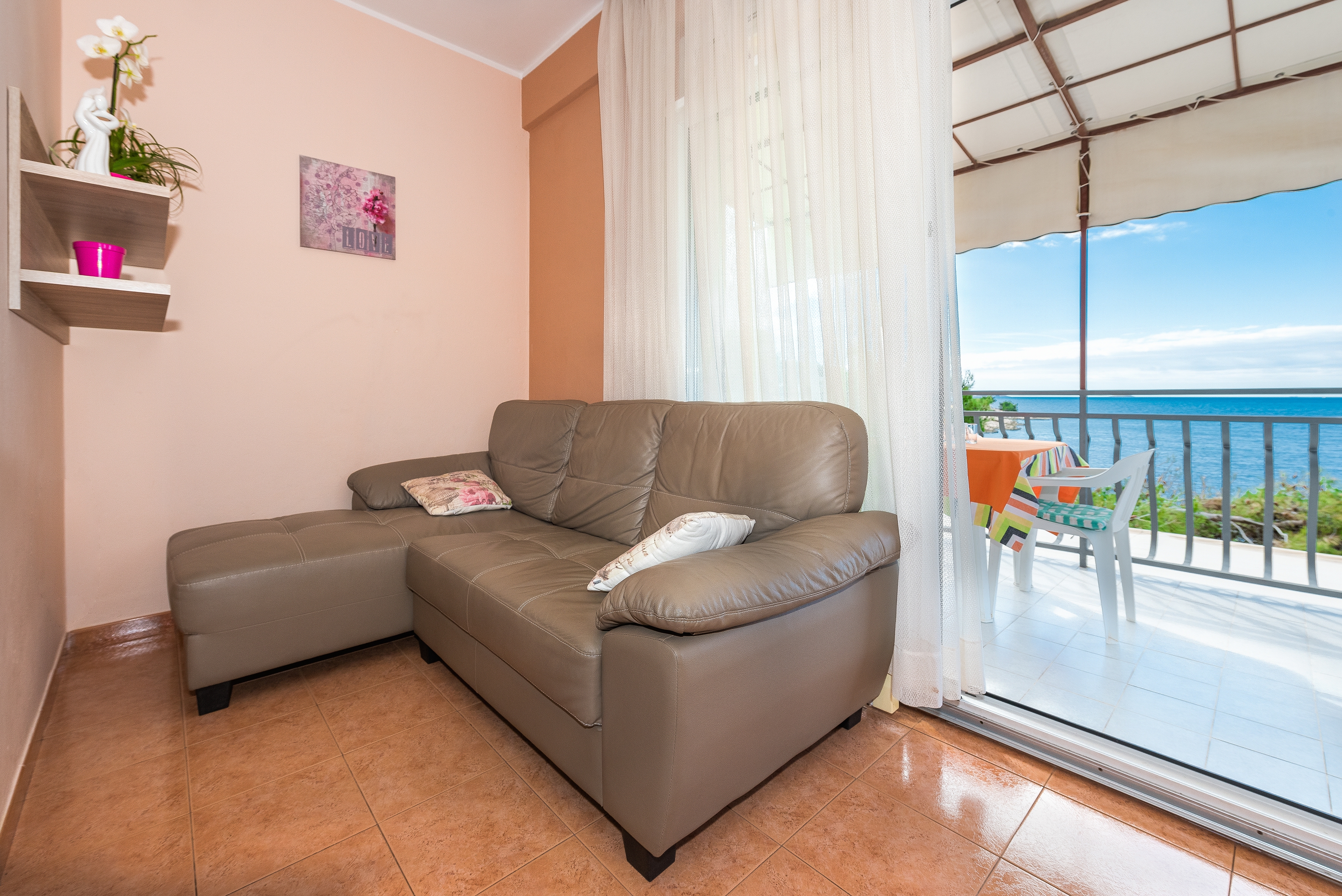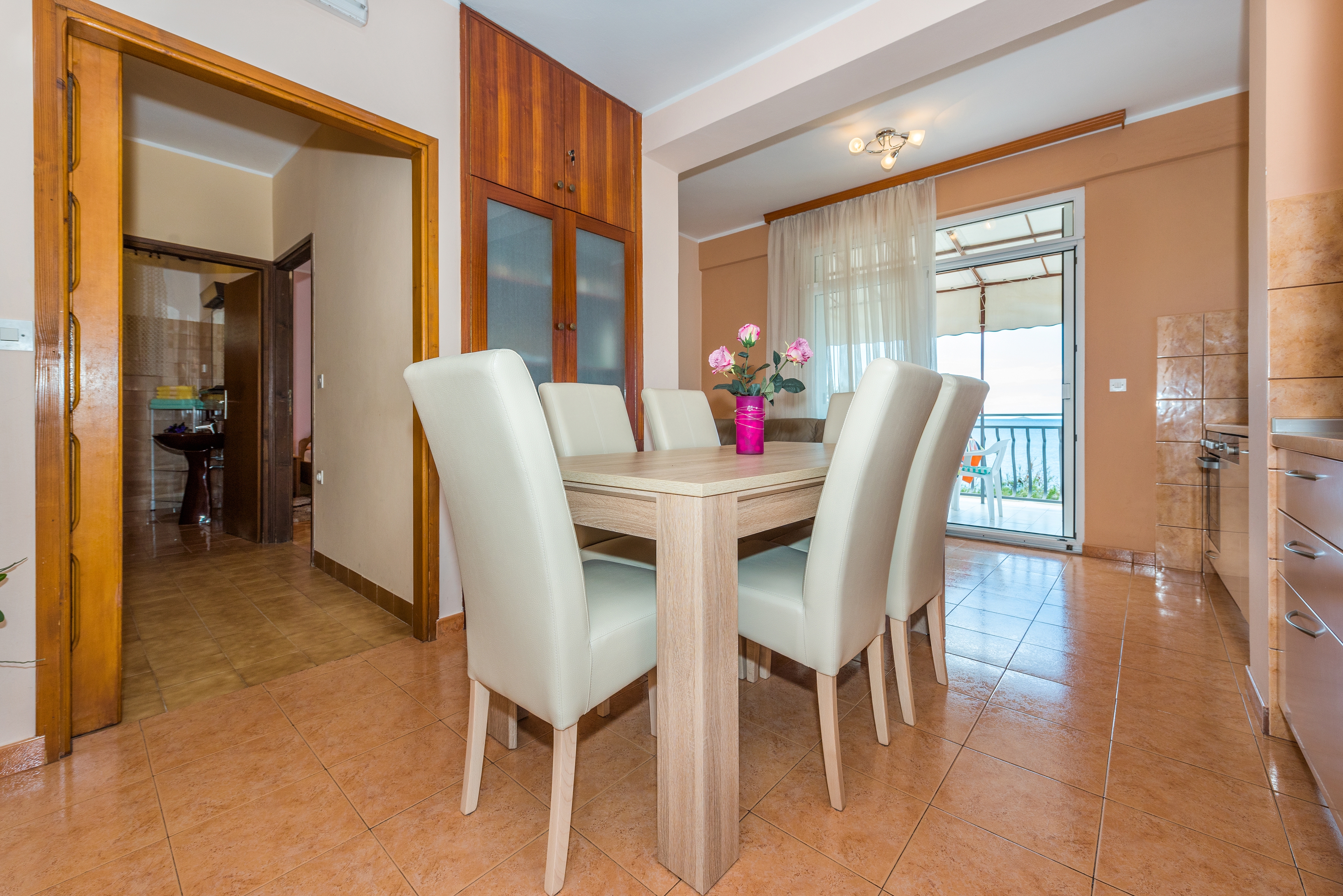 Apartament może przyjąć 5 gości. Łóżka znajdują się w sypialniach, których jest 2, oraz w jadalni, na powierzchni 48m2. Goście mają dostęp do tarasu, by korzystać z ciepłych, letnich wieczorów. Z apartamentu roztacza się widok na morze. Możliwość przygotowywania posiłków poprzez korzystanie ze wspólnego grilla. WLICZONE W CENĘ: taksa pobytowa, sprzątanie końcowe, klimatyzacja, parking, internet, miejsce do cumowania łodzi, żelazko, suszarka do włosów. OBOWIĄZKOWE KOSZTY DODATKOWE: dopłata za krótki termin (procent dopłaty w zalezności od liczby noclegów: 30% - 1, 20% - 2, 10% - 3). NIEOBOWIĄZKOWE KOSZTY DODATKOWE: dostawka (20,00 € za nocleg), 1 łóżeczko dziecięce (10,00 € osobadzień). Dostępność dodatkowych usług w rezerwowanym terminie oraz ich cenę (jeśli nie jest podana) należy sprawdzić wcześniej. Za dodatowe usługi, które nie zostały uwzględnione w kalkulacji ceny, płaci się bezpośrednio właścicielowi obiektu, pod warunkiem śe gość korzysta z tych usług. Zniżki od ceny podstawowej: bezpłatny dzień 14=13 (przy pobycie, trwającym co najmniej 14 dni, otrzymujecie jeden bezpłatny dzień na pobyt do 31.12.2026).