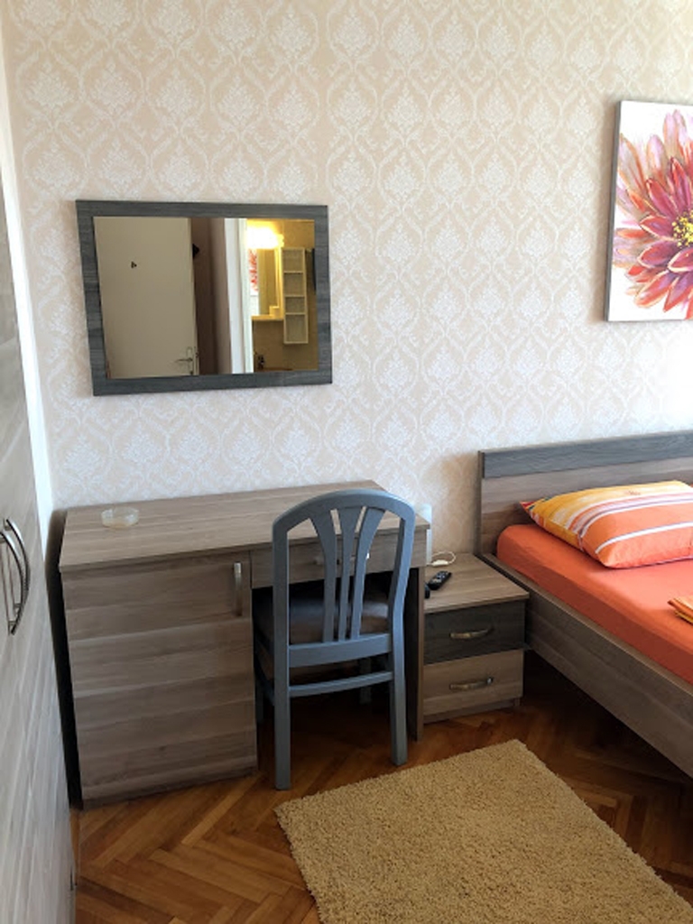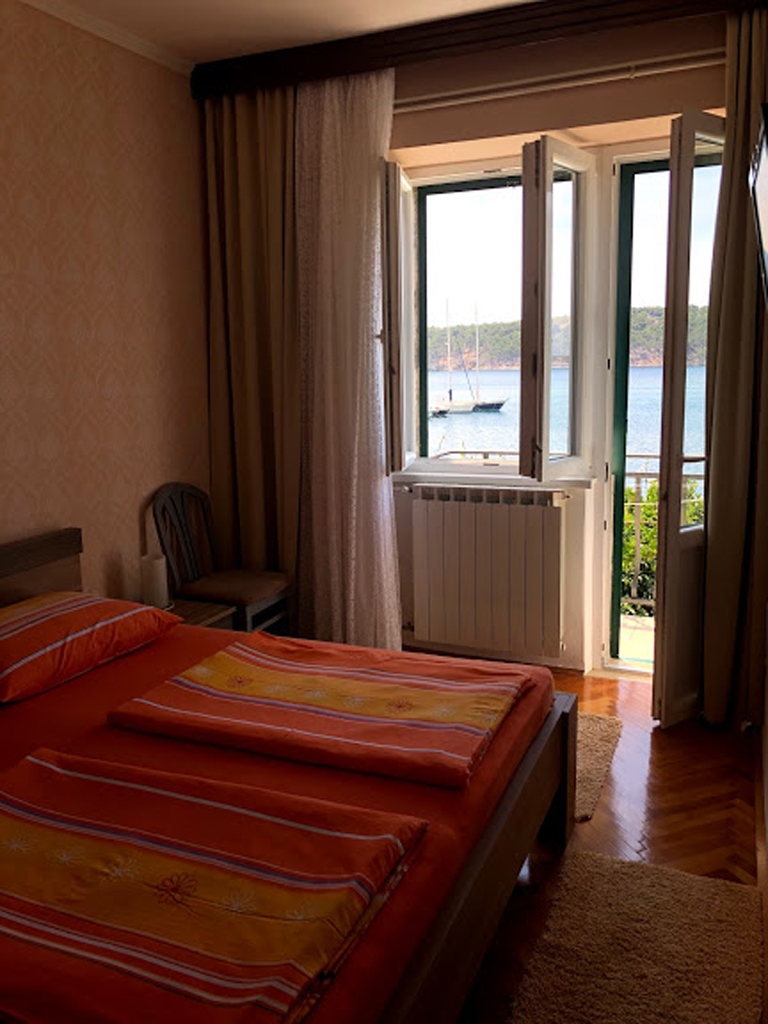 Pokój może przyjąć 2 gości. Łóżka znajdują się w sypialniach, których jest 1, na powierzchni 15m2. Goście mają dostęp do balkonu, by korzystać z ciepłych, letnich wieczorów. Z pokoju roztacza się widok na morze. Możliwość przygotowywania posiłków poprzez korzystanie ze wspólnego grilla. Rezerwowana kwatera to pokój z własną łazienką, bez możliwości korzystania z kuchni. WLICZONE W CENĘ: taksa pobytowa, sprzątanie końcowe, klimatyzacja, parking, internet, łóżeczko dziecięce. OBOWIĄZKOWE KOSZTY DODATKOWE: dopłata za krótki termin (procent dopłaty w zalezności od liczby noclegów: 30% - 1, 20% - 2, 10% - 3). NIEOBOWIĄZKOWE KOSZTY DODATKOWE: śniadanie (10,00 €, 50% zniżki dla dzieci od 4 do 12 lat, Bezpłatne dla dzieci do 4 lat), pranie bielizny (3,00 € pranie), miejsce do cumowania łodzi (10,00 € za nocleg). Dostępność dodatkowych usług w rezerwowanym terminie oraz ich cenę (jeśli nie jest podana) należy sprawdzić wcześniej. Za dodatowe usługi, które nie zostały uwzględnione w kalkulacji ceny, płaci się bezpośrednio właścicielowi obiektu, pod warunkiem śe gość korzysta z tych usług.