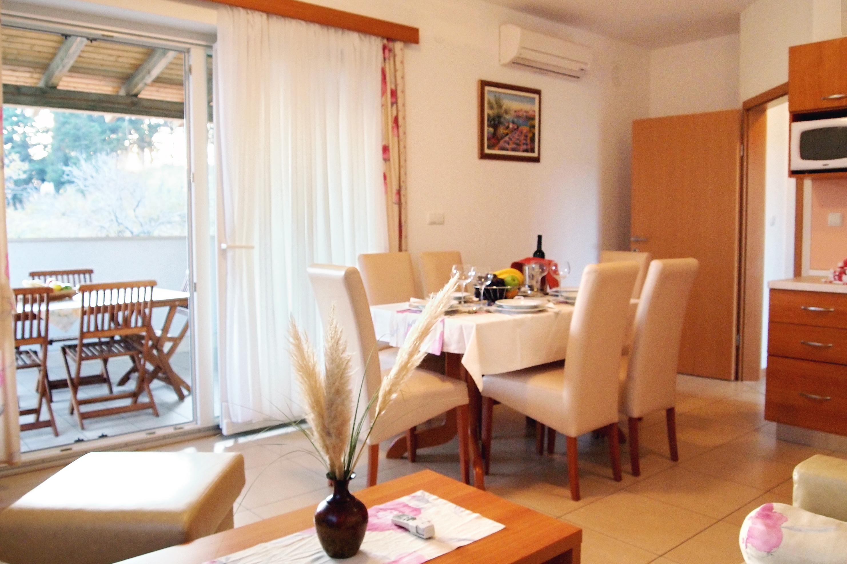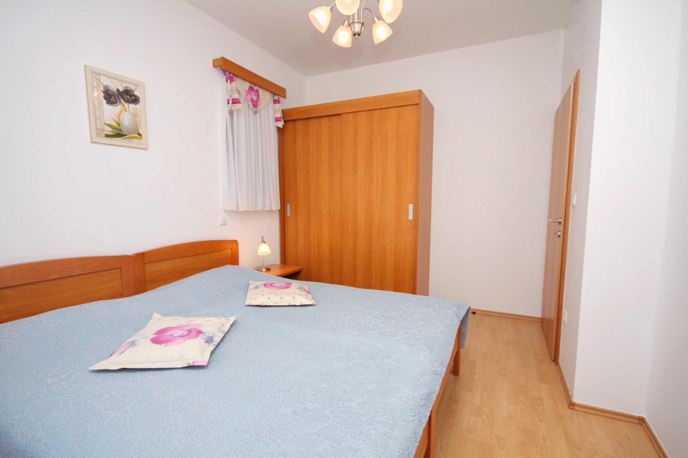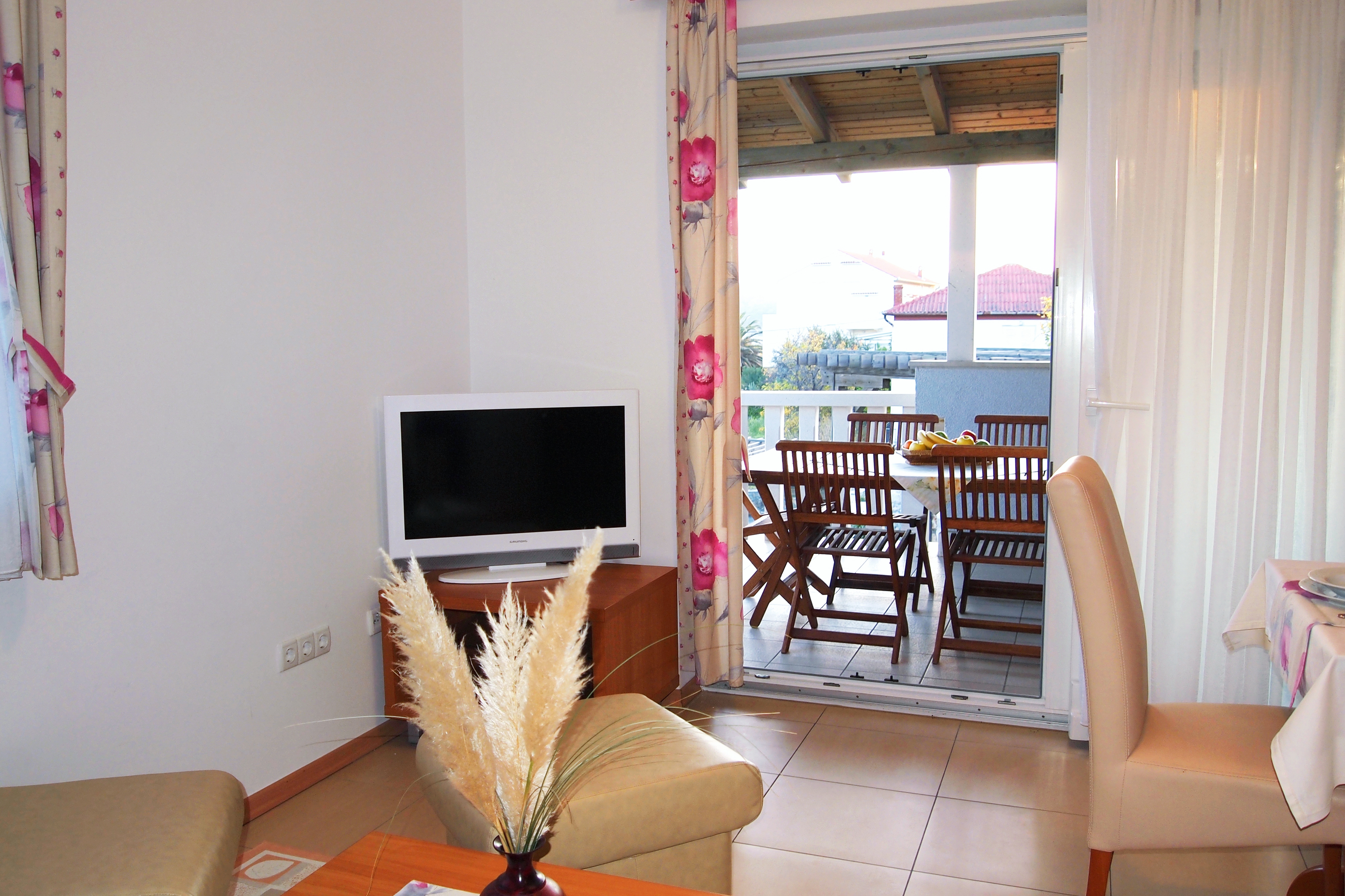 Apartament może przyjąć 6 gości. Łóżka znajdują się w sypialniach, których jest 2, oraz w pokoju dziennym, na powierzchni 59m2. Goście mają dostęp do tarasu, by korzystać z ciepłych, letnich wieczorów. Z apartamentu roztacza się widok na morze. Możliwość przygotowywania posiłków poprzez korzystanie ze wspólnego grilla. W trakcie swojego pobytu goście mogą korzystać ze wspólnego basenu. W rezerwowanej kwaterze na miejscu jest pobierana kaucja (jej wysokość jest podana na stronie). WLICZONE W CENĘ: sprzątanie końcowe, klimatyzacja, basen, parking, internet, suszarka do włosów. OBOWIĄZKOWE KOSZTY DODATKOWE: taksa pobytowa (dorośli 0,93 € - 1,90 € noclegosoba, zniżka dla dzieci w wieku 12 - 17 lat), depozyt (100,00 € jednorazowo). Dostępność dodatkowych usług w rezerwowanym terminie oraz ich cenę (jeśli nie jest podana) należy sprawdzić wcześniej. Za dodatowe usługi, które nie zostały uwzględnione w kalkulacji ceny, płaci się bezpośrednio właścicielowi obiektu, pod warunkiem śe gość korzysta z tych usług.