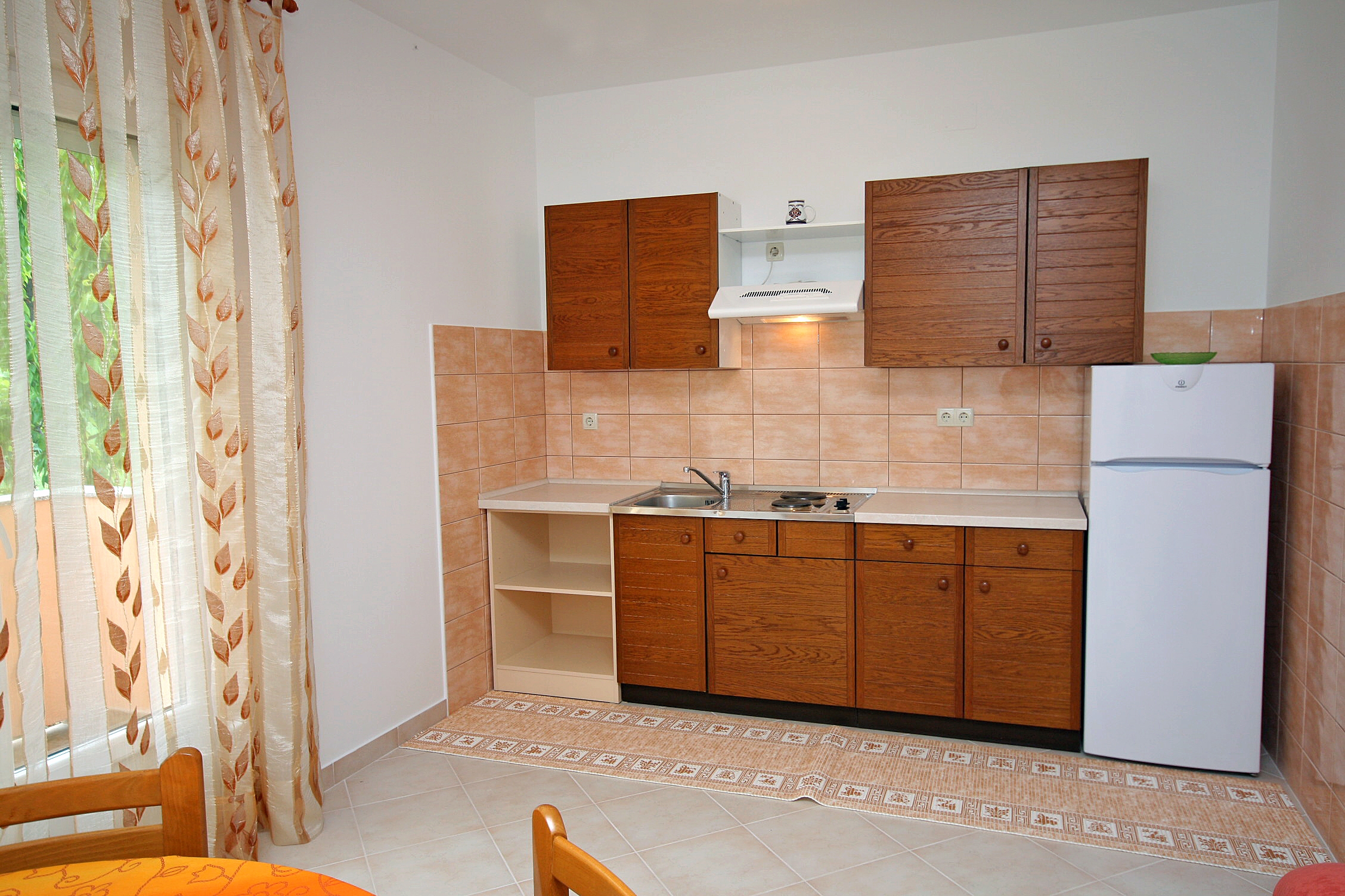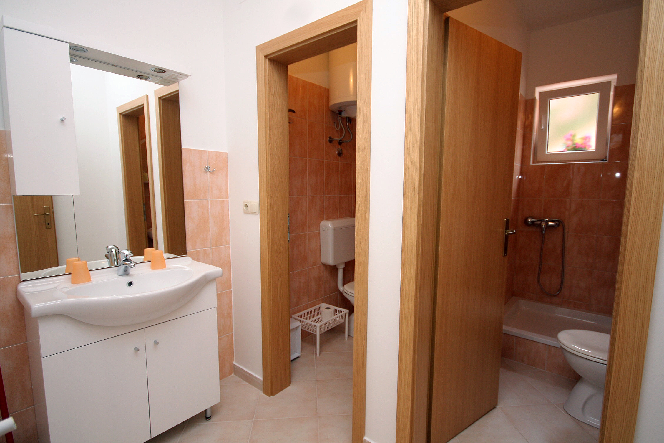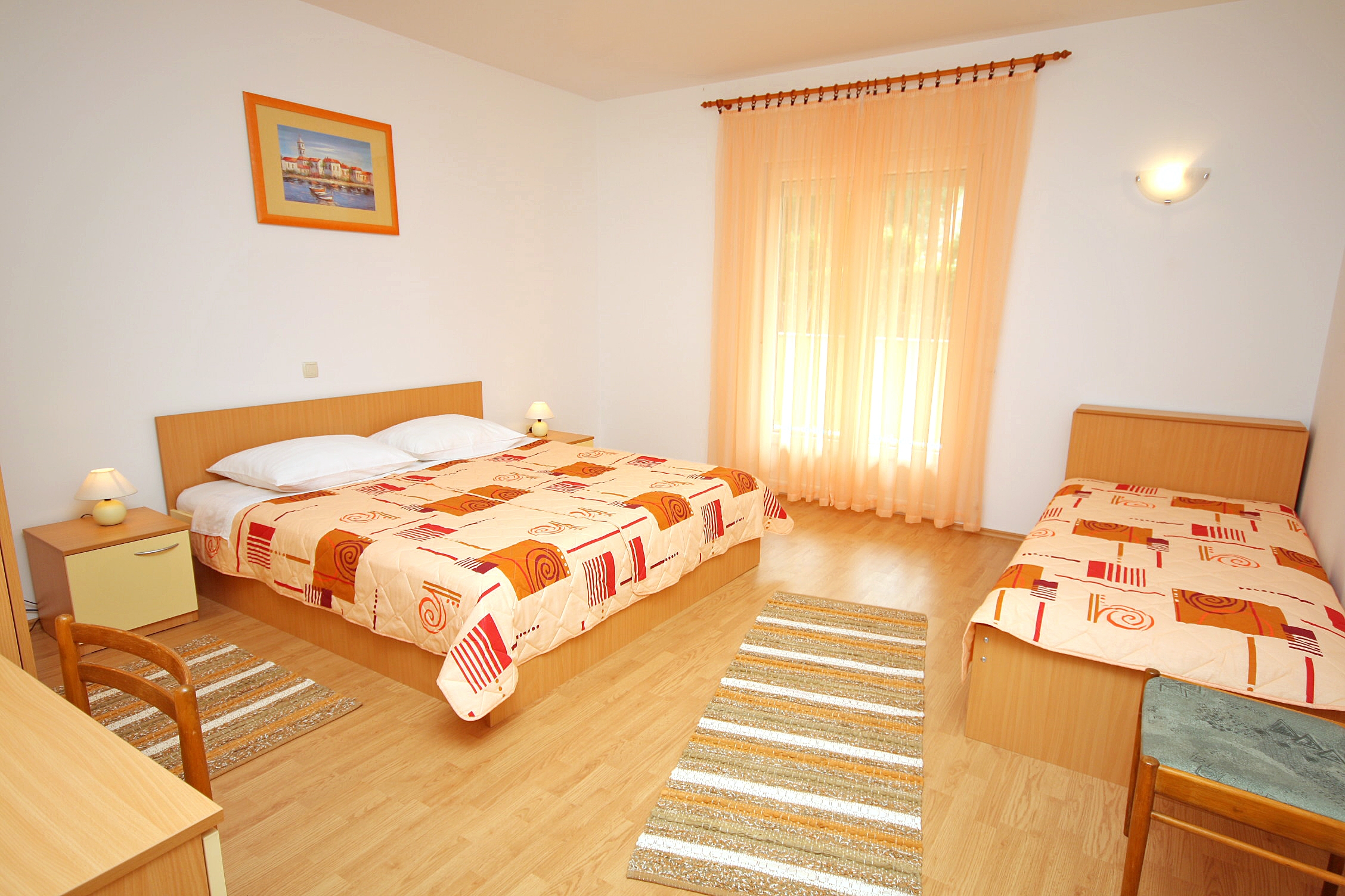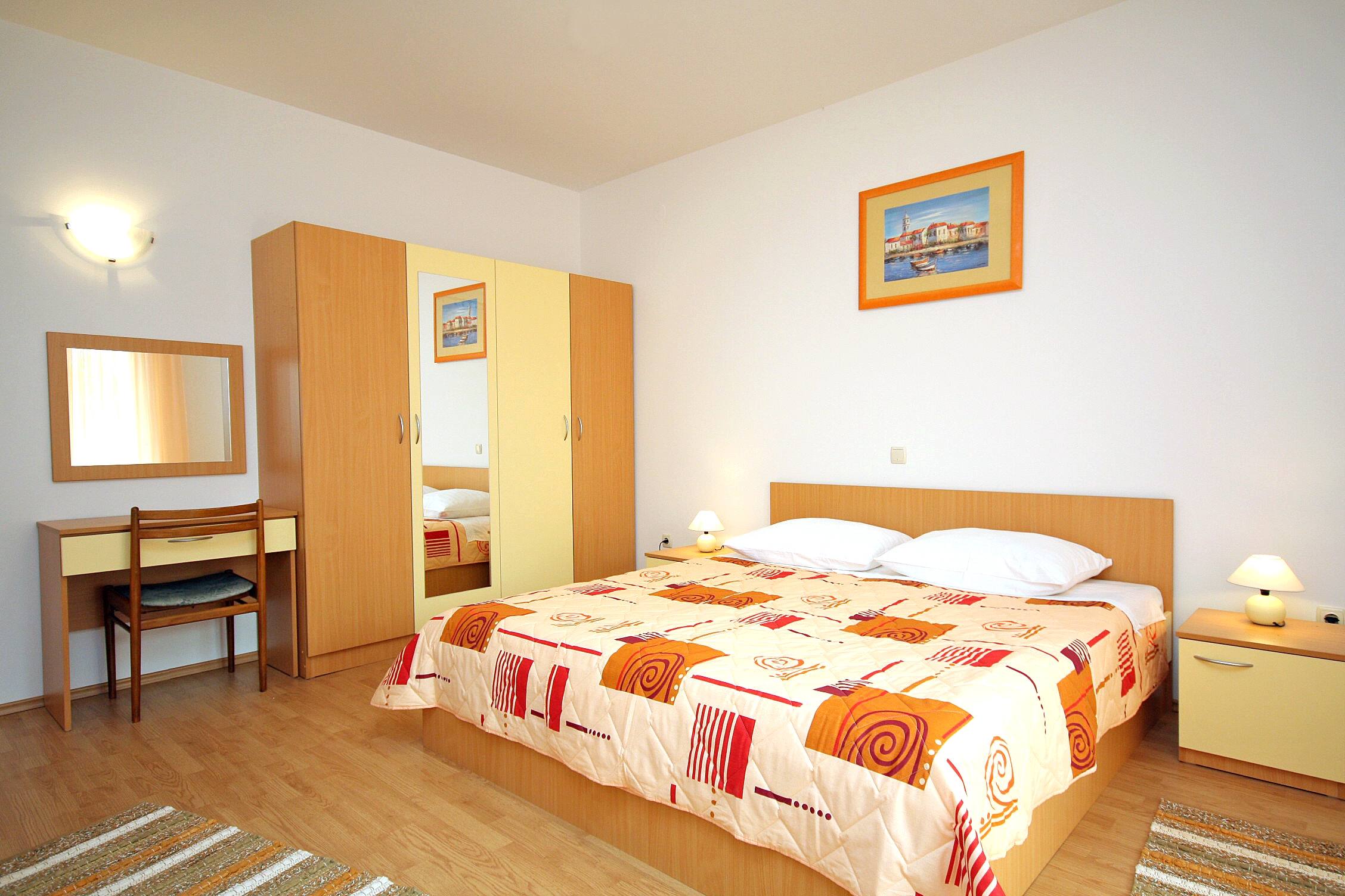 Apartament może przyjąć 5 gości. Łóżka znajdują się w sypialniach, których jest 2, na powierzchni 71m2. Goście mają dostęp do tarasu, by korzystać z ciepłych, letnich wieczorów. Możliwość przygotowywania posiłków poprzez korzystanie ze wspólnego grilla. WLICZONE W CENĘ: taksa pobytowa, sprzątanie końcowe, klimatyzacja, parking, internet, żelazko, deska do prasowania, suszarka do włosów. OBOWIĄZKOWE KOSZTY DODATKOWE: dopłata za krótki termin (procent dopłaty w zalezności od liczby noclegów: 30% - 1, 20% - 2, 10% - 3). NIEOBOWIĄZKOWE KOSZTY DODATKOWE: pranie bielizny (10,00 € pranie), miejsce do cumowania łodzi (10,00 € za nocleg). Dostępność dodatkowych usług w rezerwowanym terminie oraz ich cenę (jeśli nie jest podana) należy sprawdzić wcześniej. Za dodatowe usługi, które nie zostały uwzględnione w kalkulacji ceny, płaci się bezpośrednio właścicielowi obiektu, pod warunkiem śe gość korzysta z tych usług.