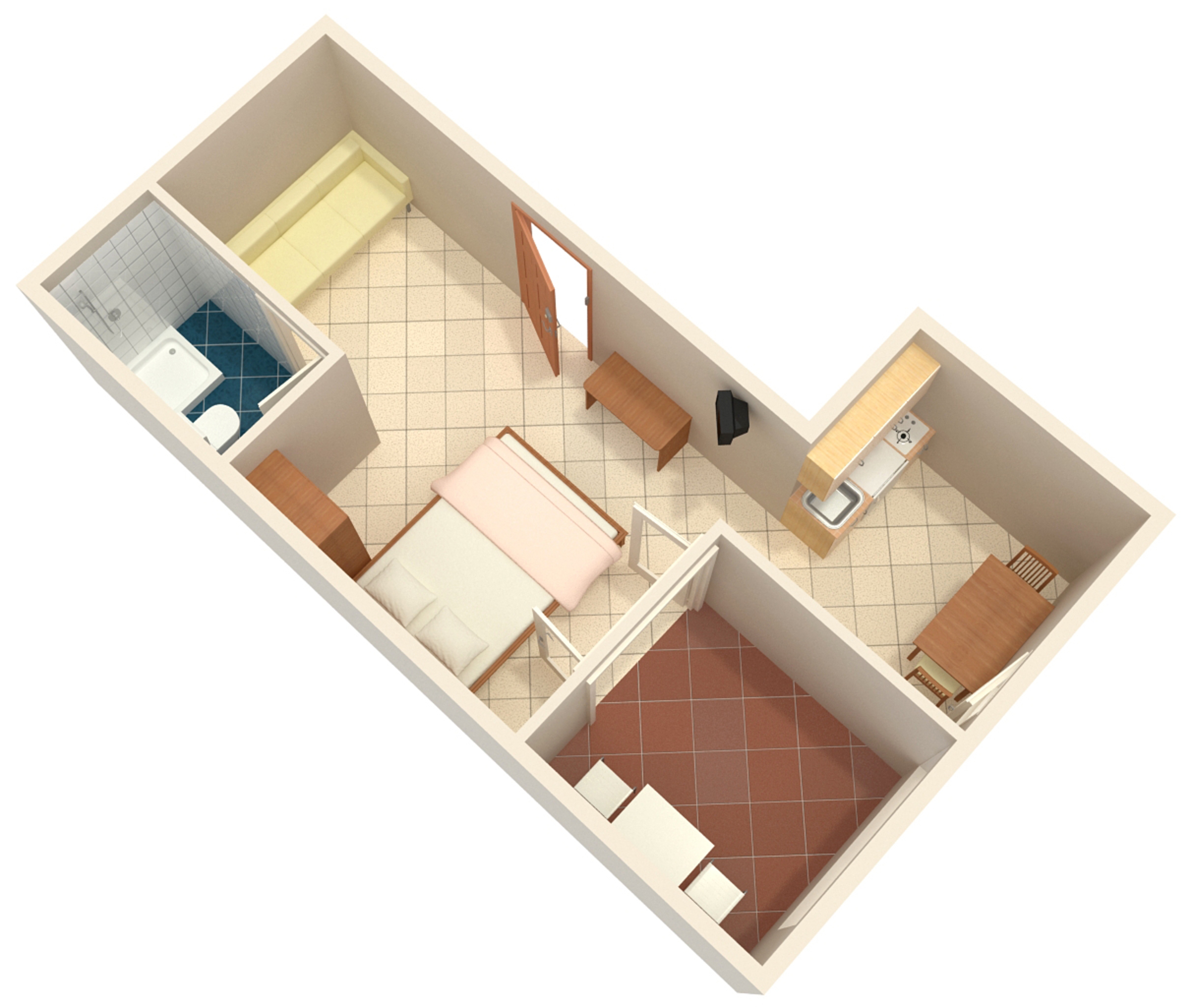 Studio może przyjąć 3 gości. Łóżka znajdują się w sypialniach, których jest 1, na powierzchni 23m2. Goście mają dostęp do tarasu, by korzystać z ciepłych, letnich wieczorów. Z apartamentu typu studio roztacza się widok na morze. W kwaterze dozwolony jest pobyt zwierzęcia domowego, za dopłatą. WLICZONE W CENĘ: taksa pobytowa, sprzątanie końcowe, parking, internet, suszarka do włosów. OBOWIĄZKOWE KOSZTY DODATKOWE: dopłata za krótki termin (procent dopłaty w zalezności od liczby noclegów: 30% - 1, 20% - 2, 10% - 3). NIEOBOWIĄZKOWE KOSZTY DODATKOWE: klimatyzacja (7,00 € za nocleg), zwierzęta domowe (15,00 € za nocleg). Dostępność dodatkowych usług w rezerwowanym terminie oraz ich cenę (jeśli nie jest podana) należy sprawdzić wcześniej. Za dodatowe usługi, które nie zostały uwzględnione w kalkulacji ceny, płaci się bezpośrednio właścicielowi obiektu, pod warunkiem śe gość korzysta z tych usług.