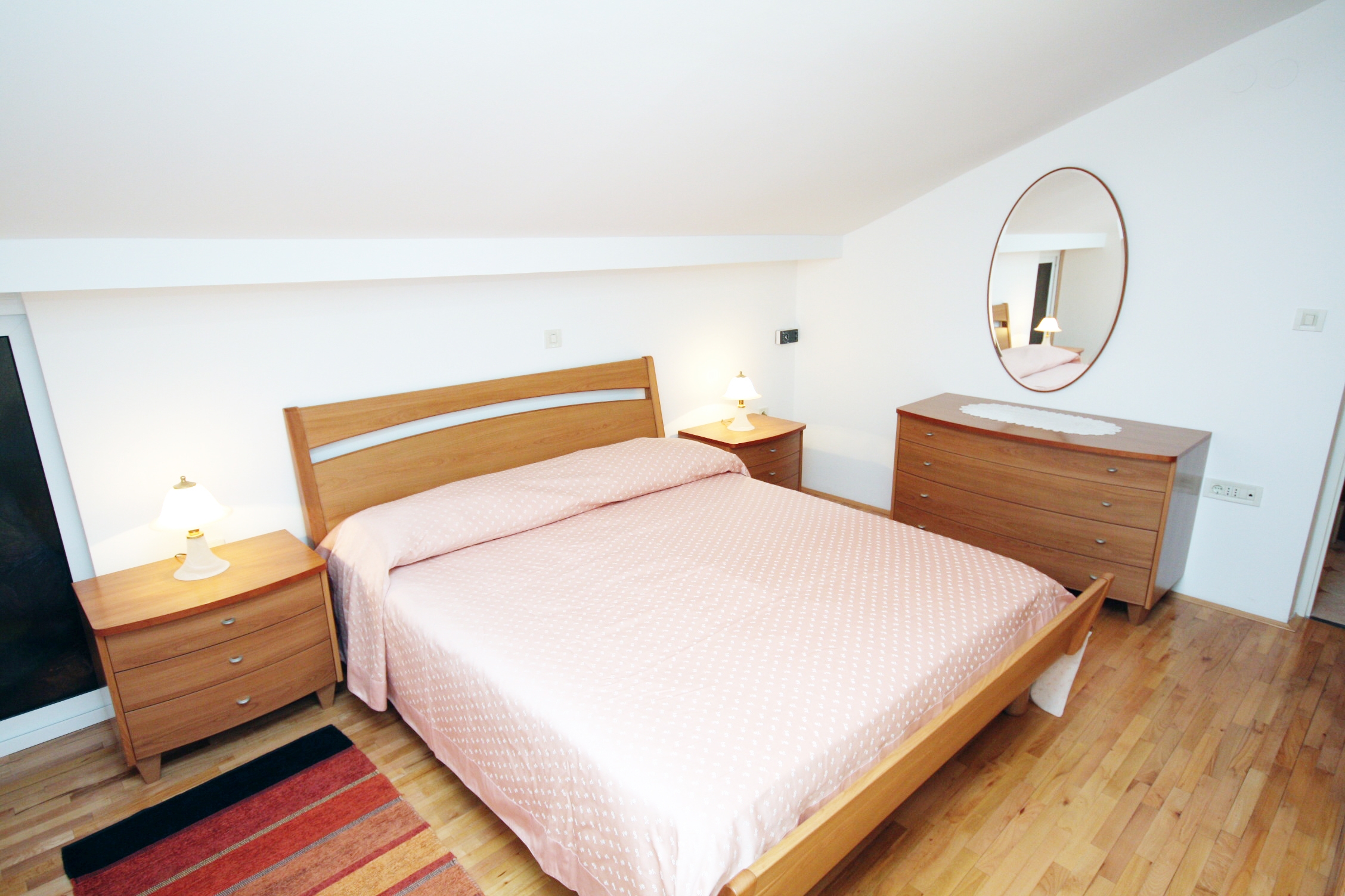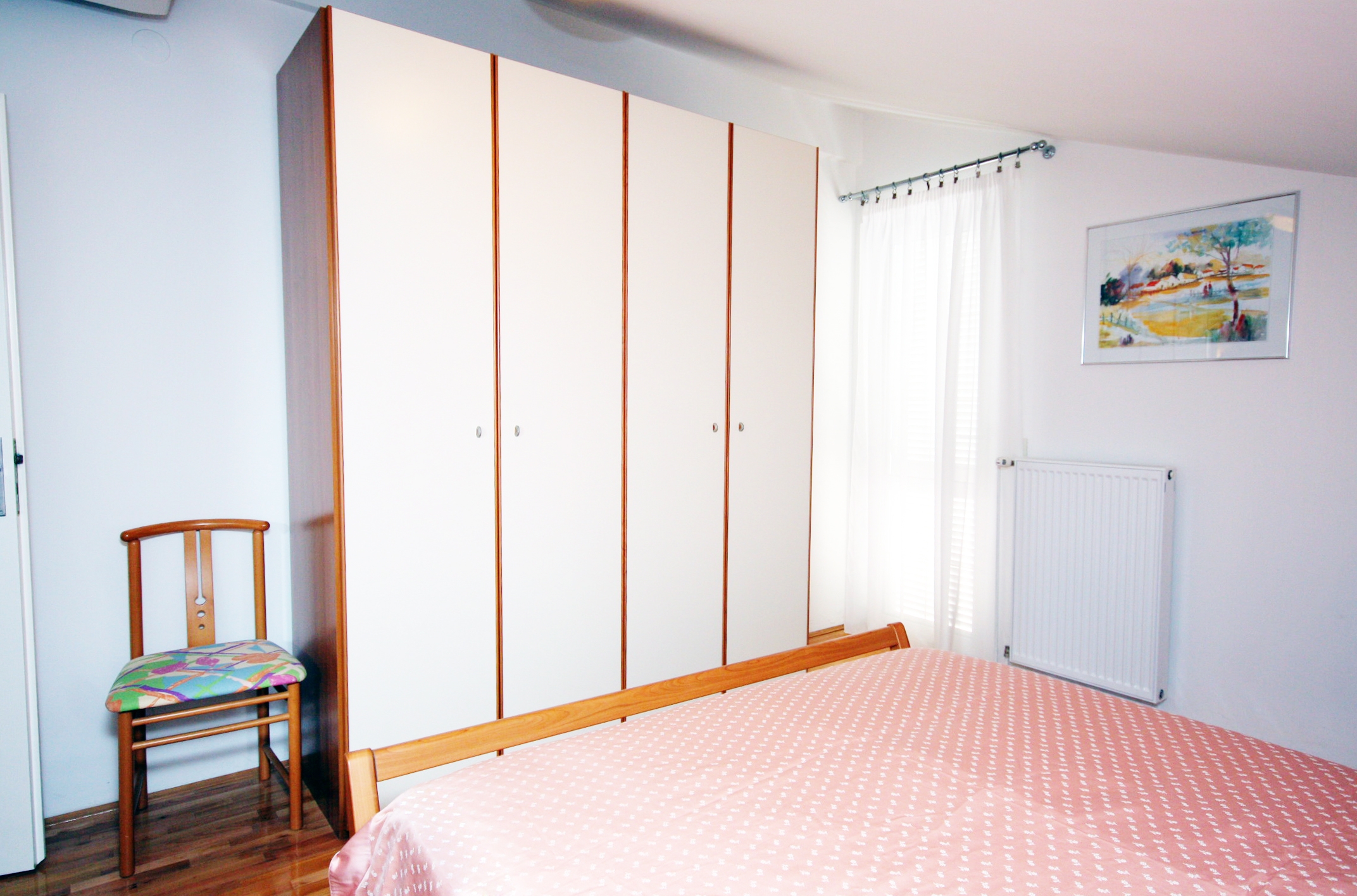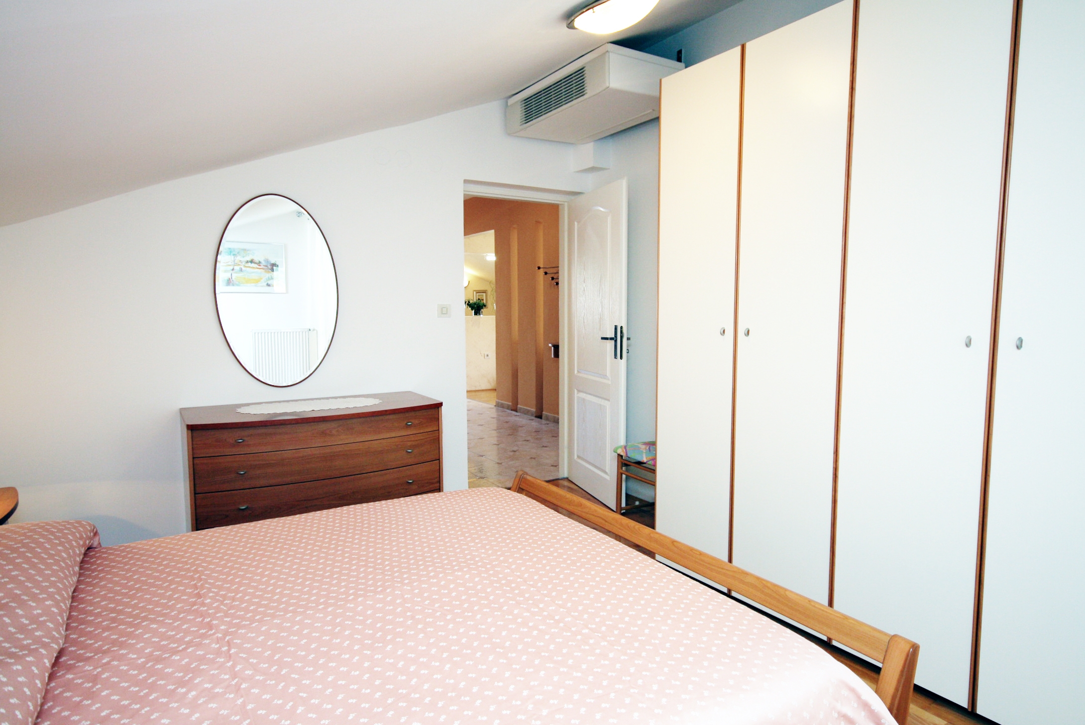 Apartament może przyjąć 4 gości. Łóżka znajdują się w sypialniach, których jest 2, na powierzchni 85m2. Goście mają dostęp do tarasu, by korzystać z ciepłych, letnich wieczorów. Z apartamentu roztacza się widok na morze. Możliwość przygotowywania posiłków poprzez korzystanie ze wspólnego grilla. W kwaterze dozwolony jest pobyt zwierzęcia domowego, za dopłatą. WLICZONE W CENĘ: taksa pobytowa, sprzątanie końcowe, klimatyzacja, parking, garaż, internet, łóżeczko dziecięce, suszarka do włosów. OBOWIĄZKOWE KOSZTY DODATKOWE: dopłata za krótki termin (procent dopłaty w zalezności od liczby noclegów: 30% - 1, 20% - 2, 10% - 3). NIEOBOWIĄZKOWE KOSZTY DODATKOWE: śniadanie (15,00 €, 50% zniżki dla dzieci od 4 do 12 lat, Bezpłatne dla dzieci do 4 lat), miejsce do cumowania łodzi (6,00 € za nocleg), zwierzęta domowe (10,00 € za nocleg). Dostępność dodatkowych usług w rezerwowanym terminie oraz ich cenę (jeśli nie jest podana) należy sprawdzić wcześniej. Za dodatowe usługi, które nie zostały uwzględnione w kalkulacji ceny, płaci się bezpośrednio właścicielowi obiektu, pod warunkiem śe gość korzysta z tych usług.