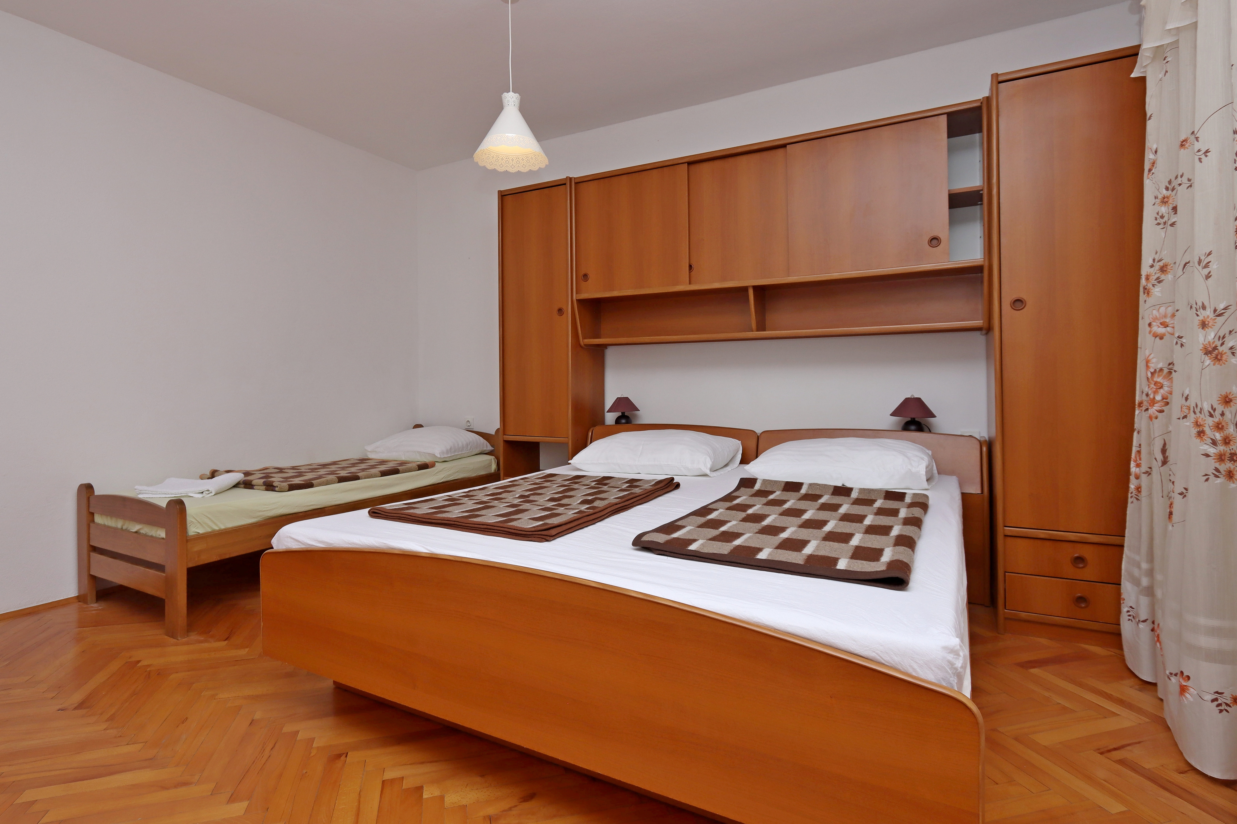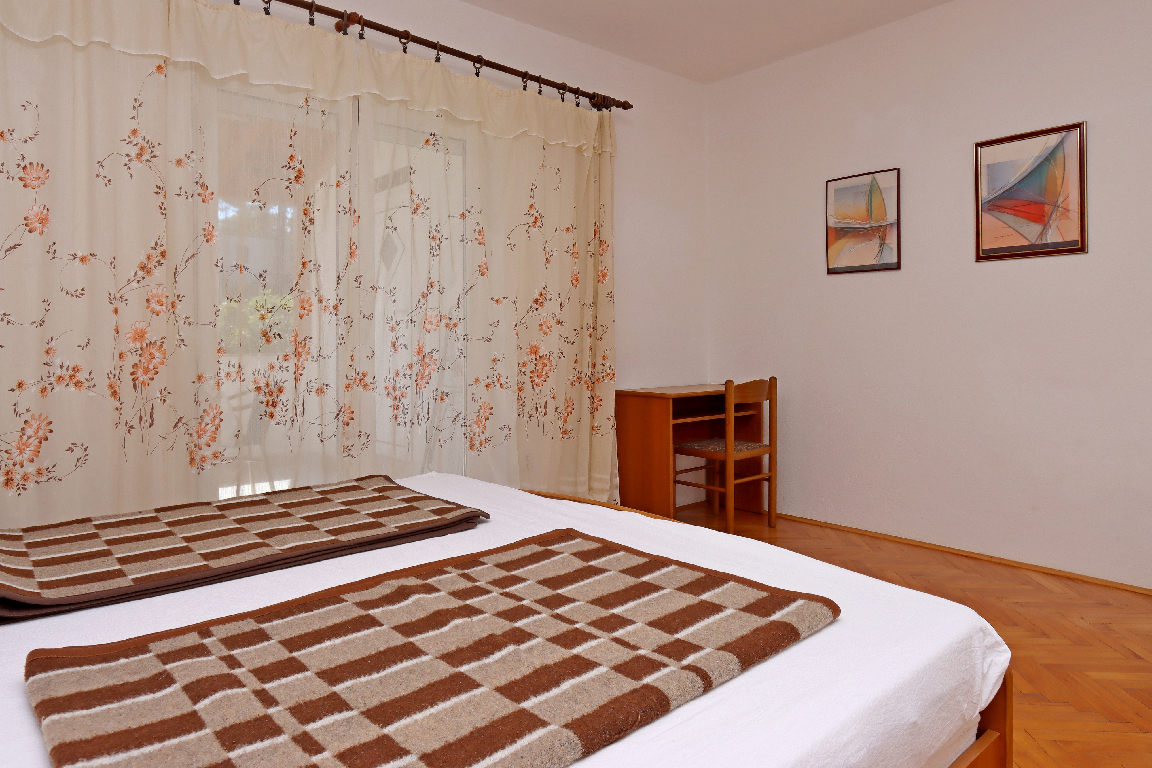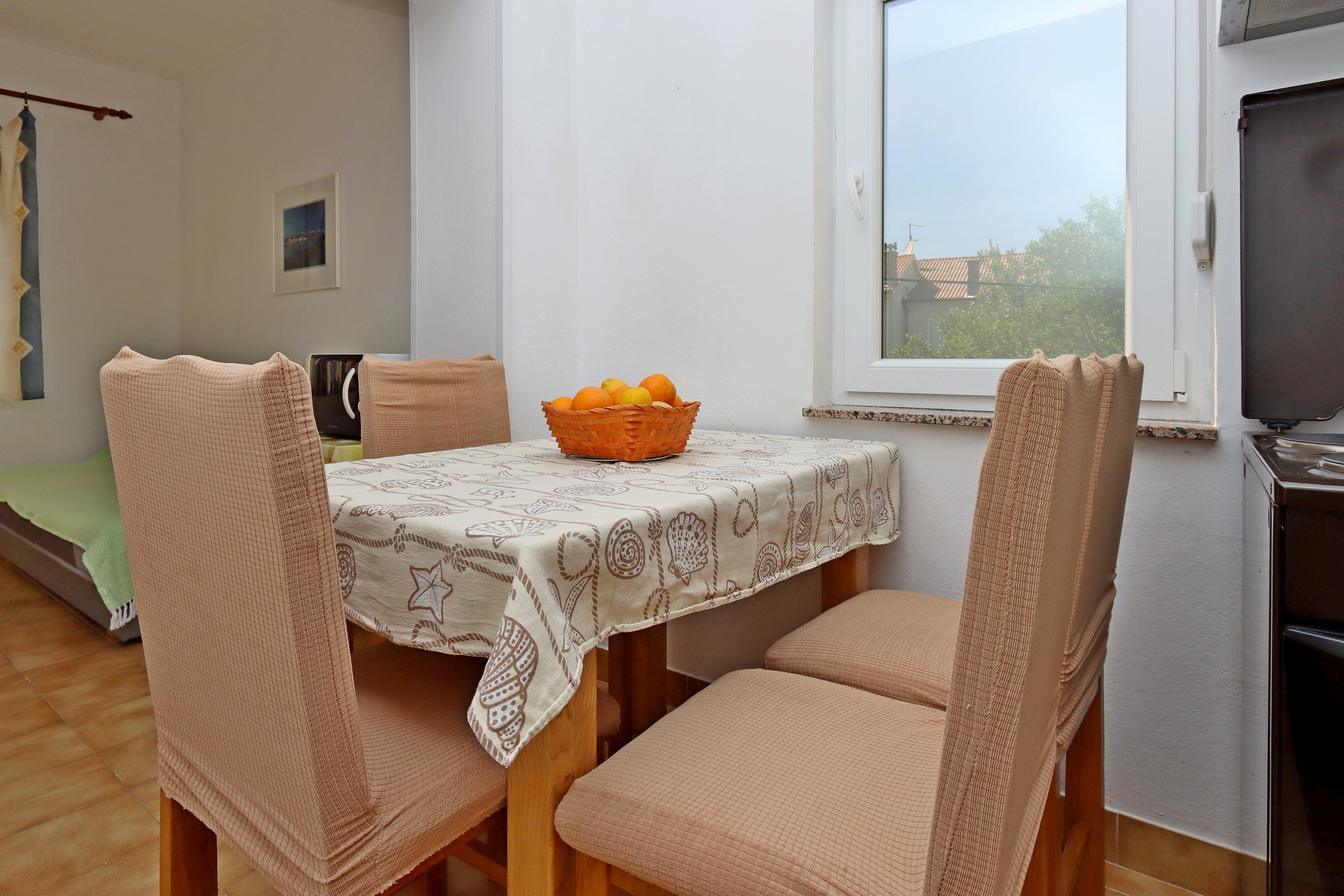 Apartament może przyjąć 4 gości. Łóżka znajdują się w sypialniach, których jest 2, na powierzchni 53m2. Goście mają dostęp do tarasu, by korzystać z ciepłych, letnich wieczorów. Z apartamentu roztacza się widok na morze. Możliwość przygotowywania posiłków poprzez korzystanie ze wspólnego grilla. WLICZONE W CENĘ: taksa pobytowa, sprzątanie końcowe, klimatyzacja, parking, internet, łóżeczko dziecięce, żelazko, deska do prasowania, suszarka do włosów. OBOWIĄZKOWE KOSZTY DODATKOWE: dopłata za krótki termin (procent dopłaty w zalezności od liczby noclegów: 30% - 1, 20% - 2, 10% - 3). NIEOBOWIĄZKOWE KOSZTY DODATKOWE: miejsce do cumowania łodzi (10,00 € za nocleg), dostawka (15,00 € za nocleg). Dostępność dodatkowych usług w rezerwowanym terminie oraz ich cenę (jeśli nie jest podana) należy sprawdzić wcześniej. Za dodatowe usługi, które nie zostały uwzględnione w kalkulacji ceny, płaci się bezpośrednio właścicielowi obiektu, pod warunkiem śe gość korzysta z tych usług.