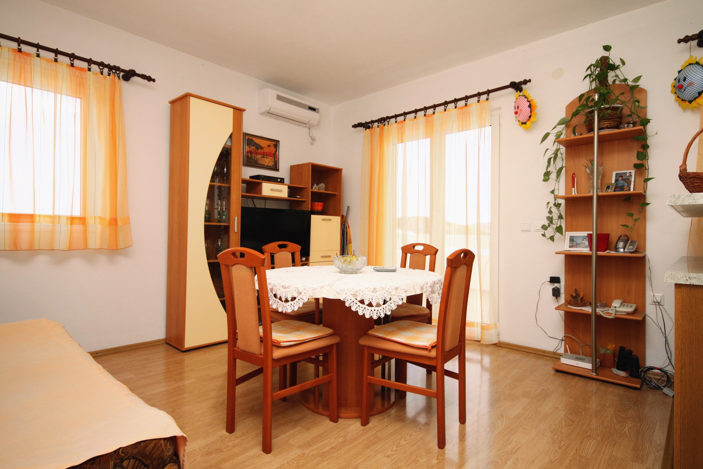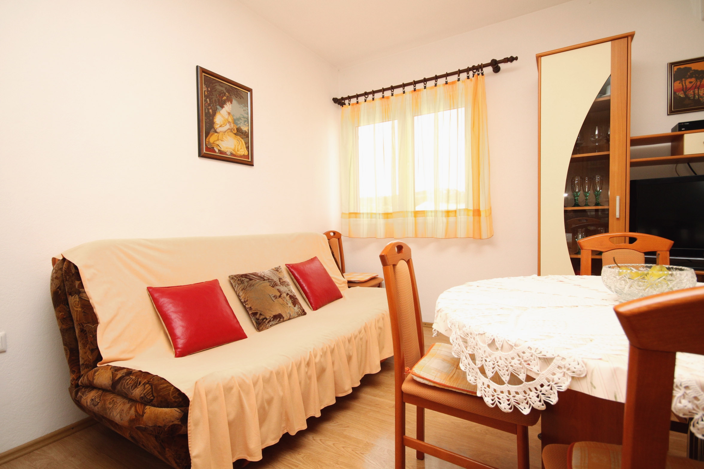 Apartament może przyjąć 4 gości. Łóżka znajdują się w sypialniach, których jest 1, oraz w jadalni, na powierzchni 38m2. Goście mają dostęp do tarasu, by korzystać z ciepłych, letnich wieczorów. Z apartamentu roztacza się widok na morze. Możliwość przygotowywania posiłków poprzez korzystanie ze wspólnego grilla. WLICZONE W CENĘ: taksa pobytowa, sprzątanie końcowe, klimatyzacja, parking, internet. OBOWIĄZKOWE KOSZTY DODATKOWE: dopłata za krótki termin (procent dopłaty w zalezności od liczby noclegów: 30% - 1, 20% - 2, 10% - 3). NIEOBOWIĄZKOWE KOSZTY DODATKOWE: dostawka (6,00 € za nocleg). Dostępność dodatkowych usług w rezerwowanym terminie oraz ich cenę (jeśli nie jest podana) należy sprawdzić wcześniej. Za dodatowe usługi, które nie zostały uwzględnione w kalkulacji ceny, płaci się bezpośrednio właścicielowi obiektu, pod warunkiem śe gość korzysta z tych usług.