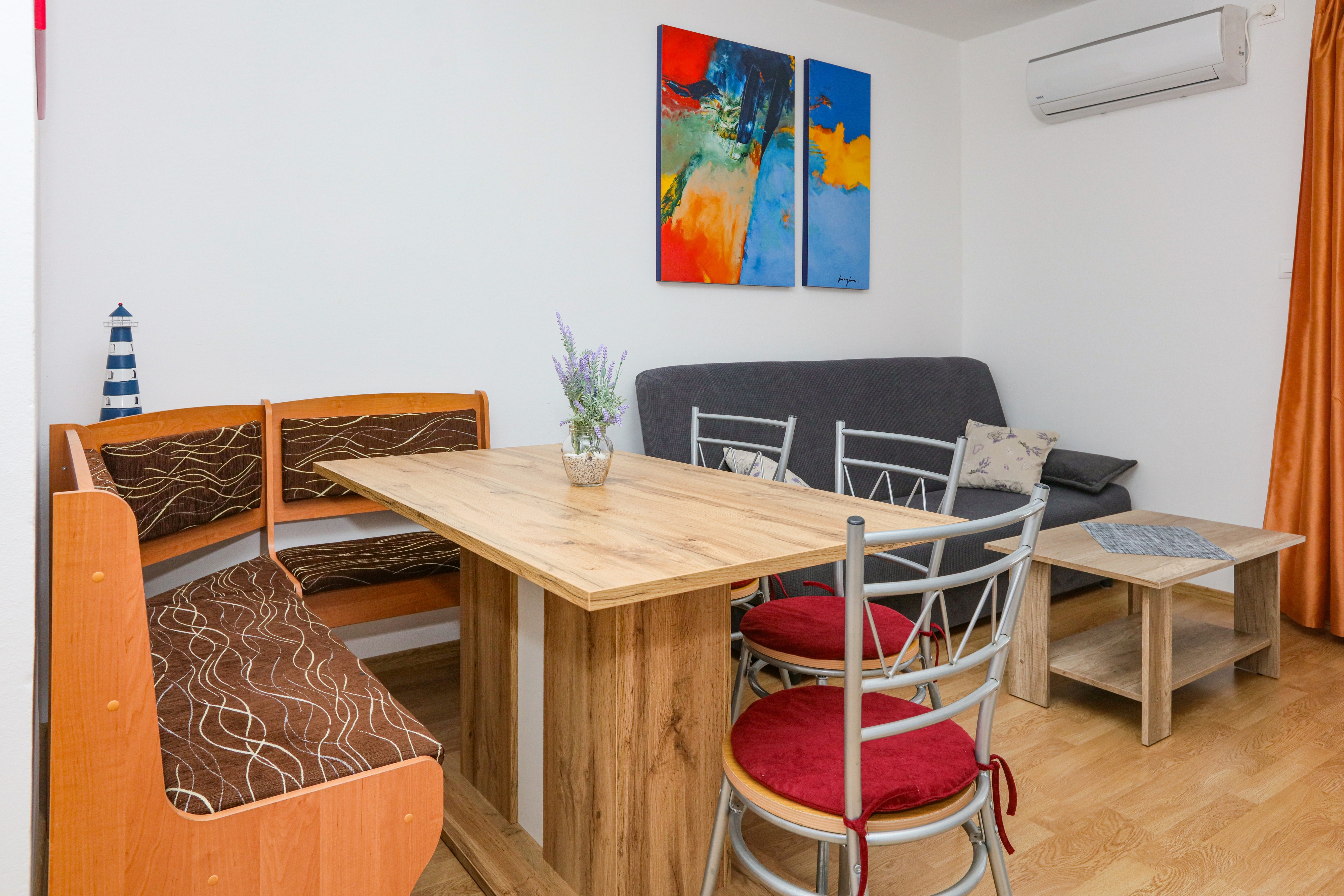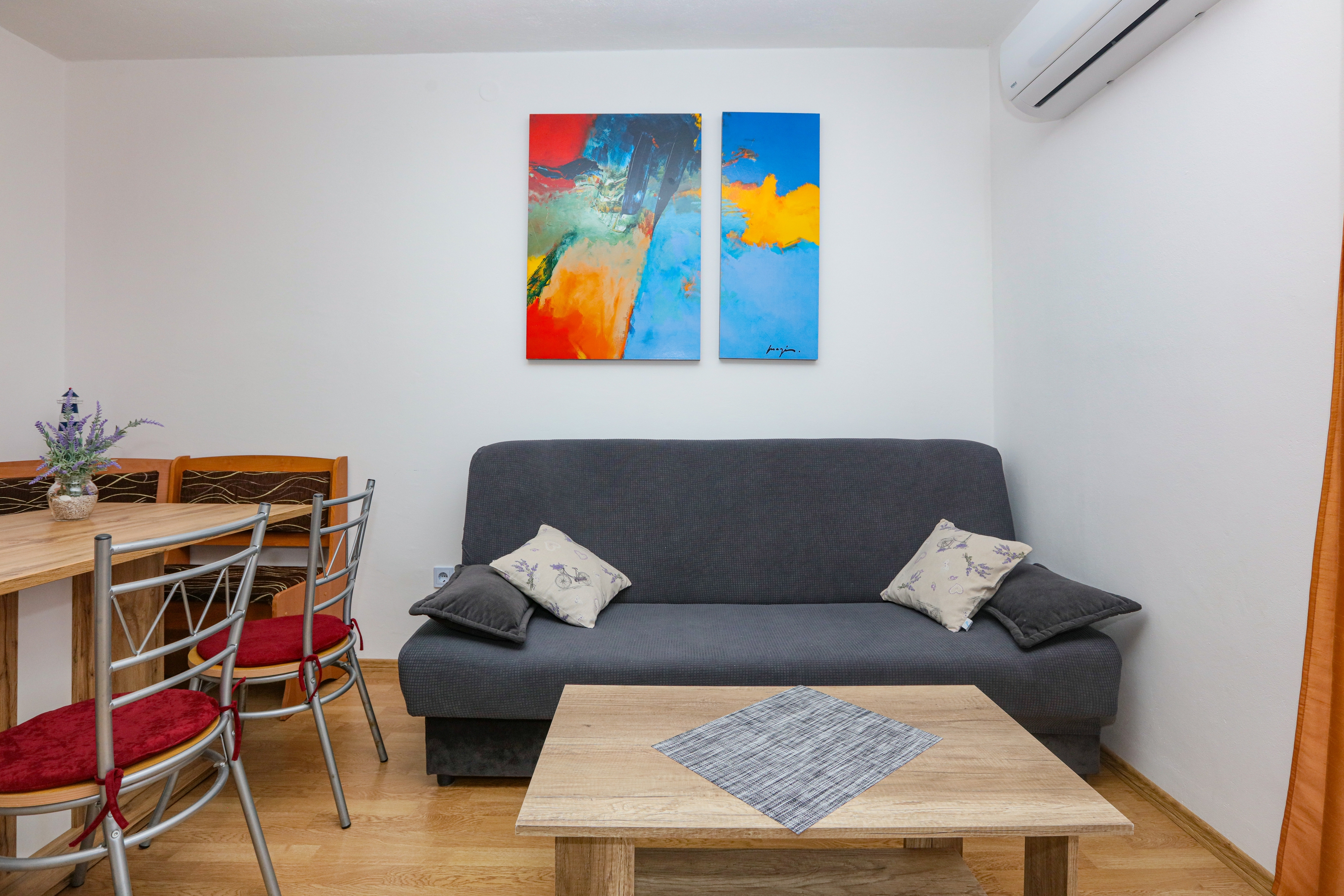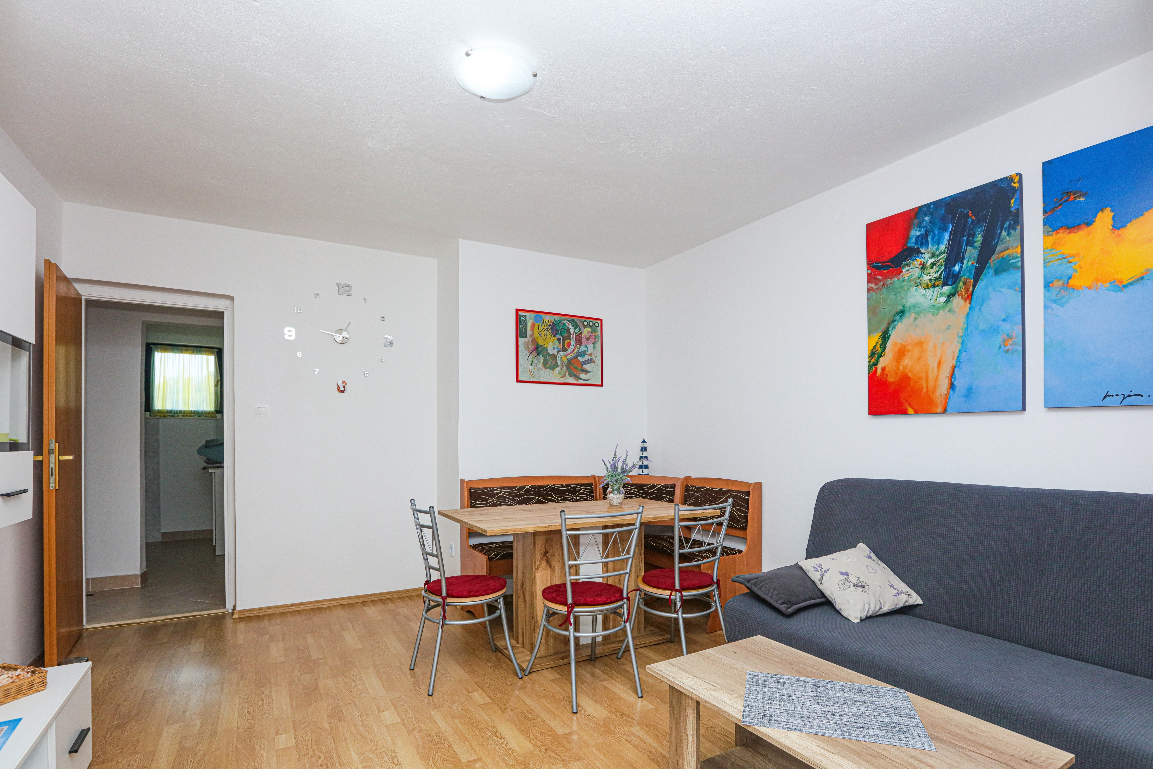 Apartament może przyjąć 5 gości. Łóżka znajdują się w sypialniach, których jest 2, oraz w pokoju dziennym, na powierzchni 50m2. Goście mają dostęp do tarasu, by korzystać z ciepłych, letnich wieczorów. Z apartamentu roztacza się widok na morze. Możliwość przygotowywania posiłków poprzez korzystanie ze wspólnego grilla. WLICZONE W CENĘ: taksa pobytowa, sprzątanie końcowe, klimatyzacja, parking, internet, łóżeczko dziecięce, żelazko, deska do prasowania, suszarka do włosów. OBOWIĄZKOWE KOSZTY DODATKOWE: dopłata za krótki termin (procent dopłaty w zalezności od liczby noclegów: 30% - 1, 20% - 2, 10% - 3). Dostępność dodatkowych usług w rezerwowanym terminie oraz ich cenę (jeśli nie jest podana) należy sprawdzić wcześniej. Za dodatowe usługi, które nie zostały uwzględnione w kalkulacji ceny, płaci się bezpośrednio właścicielowi obiektu, pod warunkiem śe gość korzysta z tych usług. Zniżki od ceny podstawowej: bezpłatny dzień 14=13 (przy pobycie, trwającym co najmniej 14 dni, otrzymujecie jeden bezpłatny dzień na pobyt do 31.12.2026).