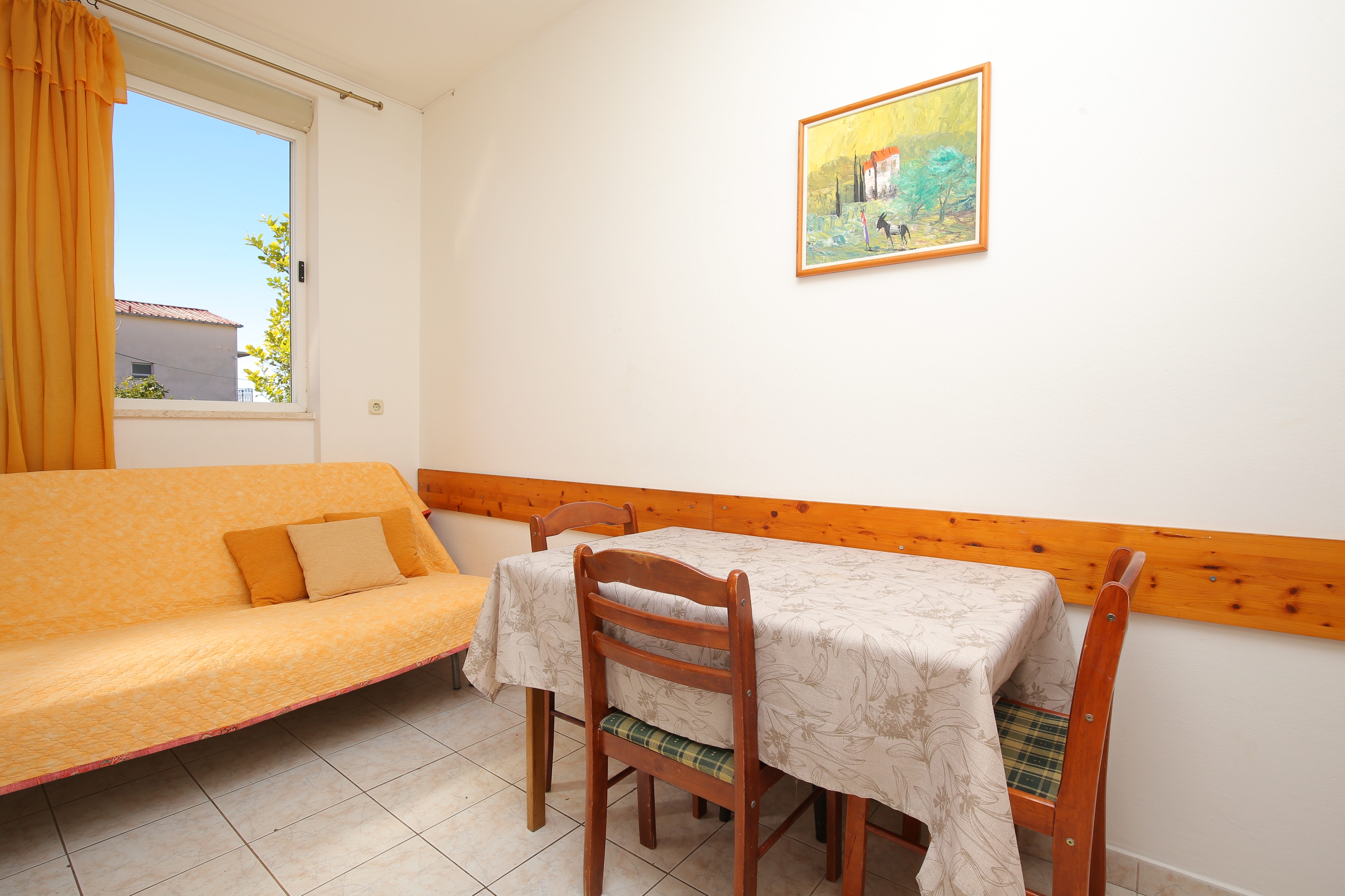 Apartament może przyjąć 4 gości. Łóżka znajdują się w sypialniach, których jest 1, oraz w pokoju dziennym, na powierzchni 29m2. Możliwość przygotowywania posiłków poprzez korzystanie ze wspólnego grilla. Rezerwowana kwatera ma taras wspólny z inną kwaterą. WLICZONE W CENĘ: taksa pobytowa, sprzątanie końcowe, klimatyzacja, parking, internet, pranie bielizny, żelazko, deska do prasowania, suszarka do włosów, przenośny grill. Dostępność dodatkowych usług w rezerwowanym terminie oraz ich cenę (jeśli nie jest podana) należy sprawdzić wcześniej. Za dodatowe usługi, które nie zostały uwzględnione w kalkulacji ceny, płaci się bezpośrednio właścicielowi obiektu, pod warunkiem śe gość korzysta z tych usług. Zniżki od ceny podstawowej: bezpłatny dzień 14=13 (przy pobycie, trwającym co najmniej 14 dni, otrzymujecie jeden bezpłatny dzień na pobyt do 31.12.2026).