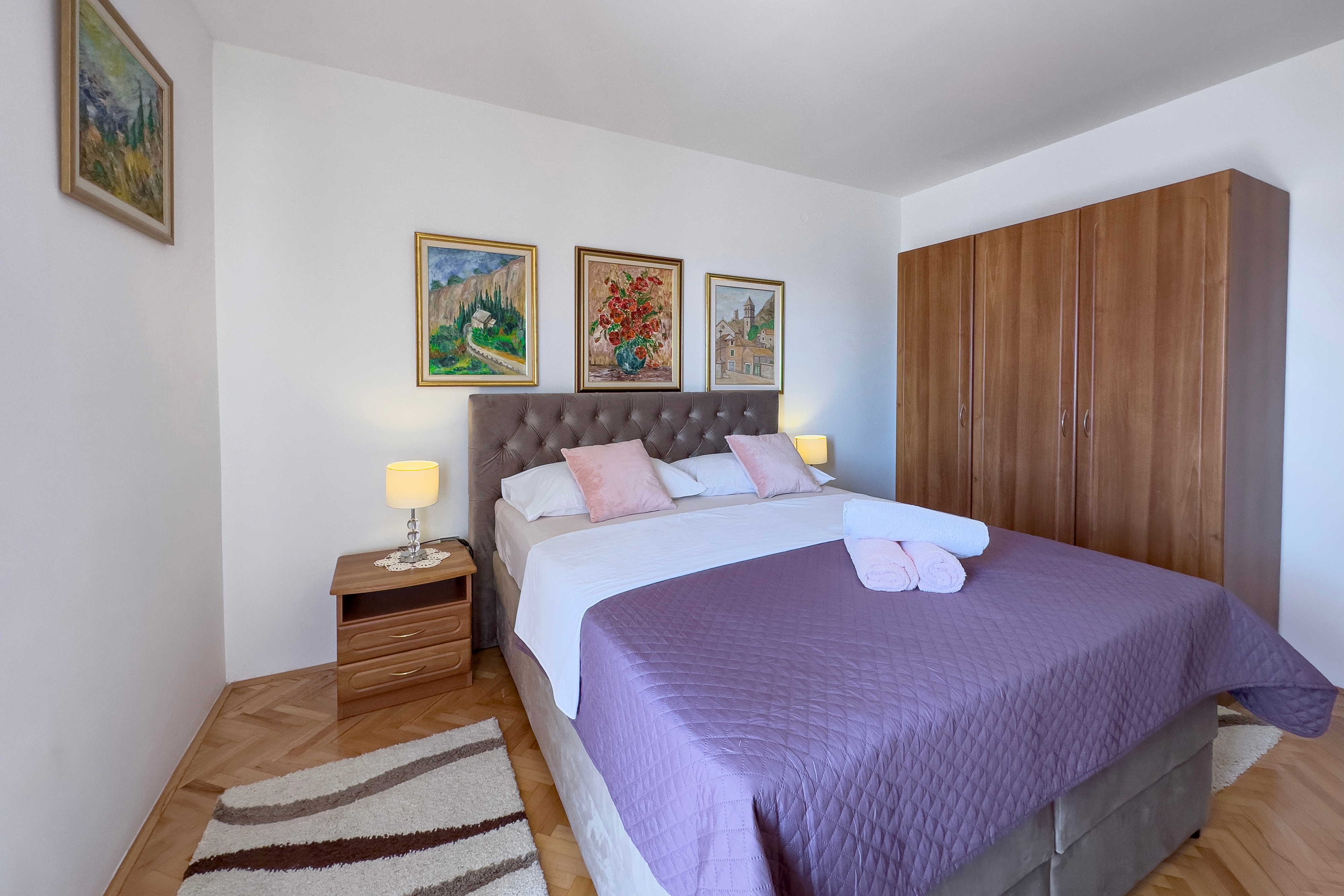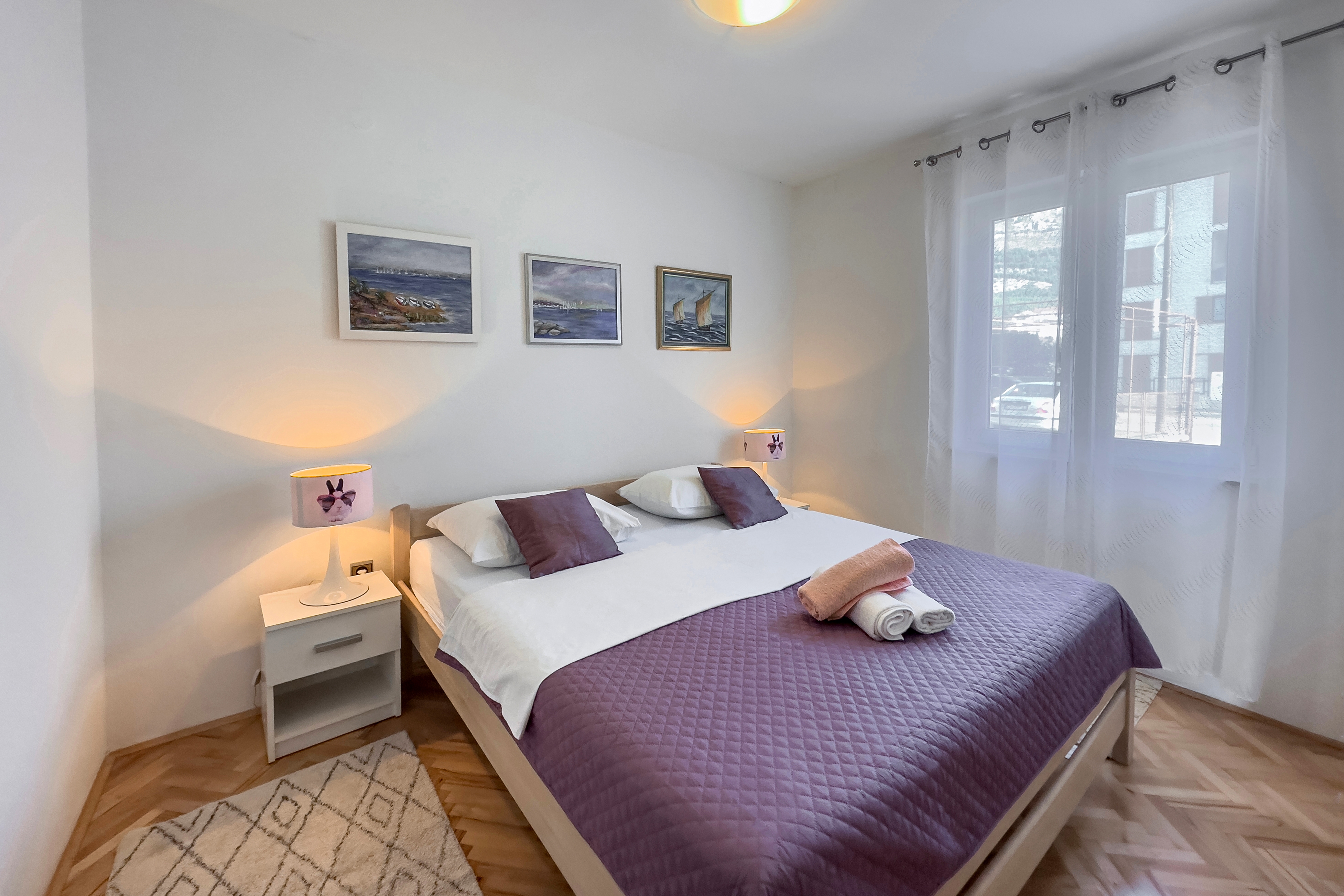 Apartament może przyjąć 4 gości. Łóżka znajdują się w sypialniach, których jest 2, na powierzchni 68m2. Goście mają dostęp do tarasu, by korzystać z ciepłych, letnich wieczorów. Z apartamentu roztacza się widok na morze. Możliwość przygotowywania posiłków poprzez korzystanie ze wspólnego grilla. WLICZONE W CENĘ: taksa pobytowa, sprzątanie końcowe, klimatyzacja, parking, internet, żelazko, deska do prasowania, suszarka do włosów, parasol, leżaki. OBOWIĄZKOWE KOSZTY DODATKOWE: dopłata za krótki termin (procent dopłaty w zalezności od liczby noclegów: 30% - 1, 20% - 2, 10% - 3). NIEOBOWIĄZKOWE KOSZTY DODATKOWE: 1 łóżeczko dziecięce (20,00 € osobadzień). Dostępność dodatkowych usług w rezerwowanym terminie oraz ich cenę (jeśli nie jest podana) należy sprawdzić wcześniej. Za dodatowe usługi, które nie zostały uwzględnione w kalkulacji ceny, płaci się bezpośrednio właścicielowi obiektu, pod warunkiem śe gość korzysta z tych usług. Zniżki od ceny podstawowej: bezpłatny dzień 14=13 (przy pobycie, trwającym co najmniej 14 dni, otrzymujecie jeden bezpłatny dzień na pobyt do 31.12.2026).
