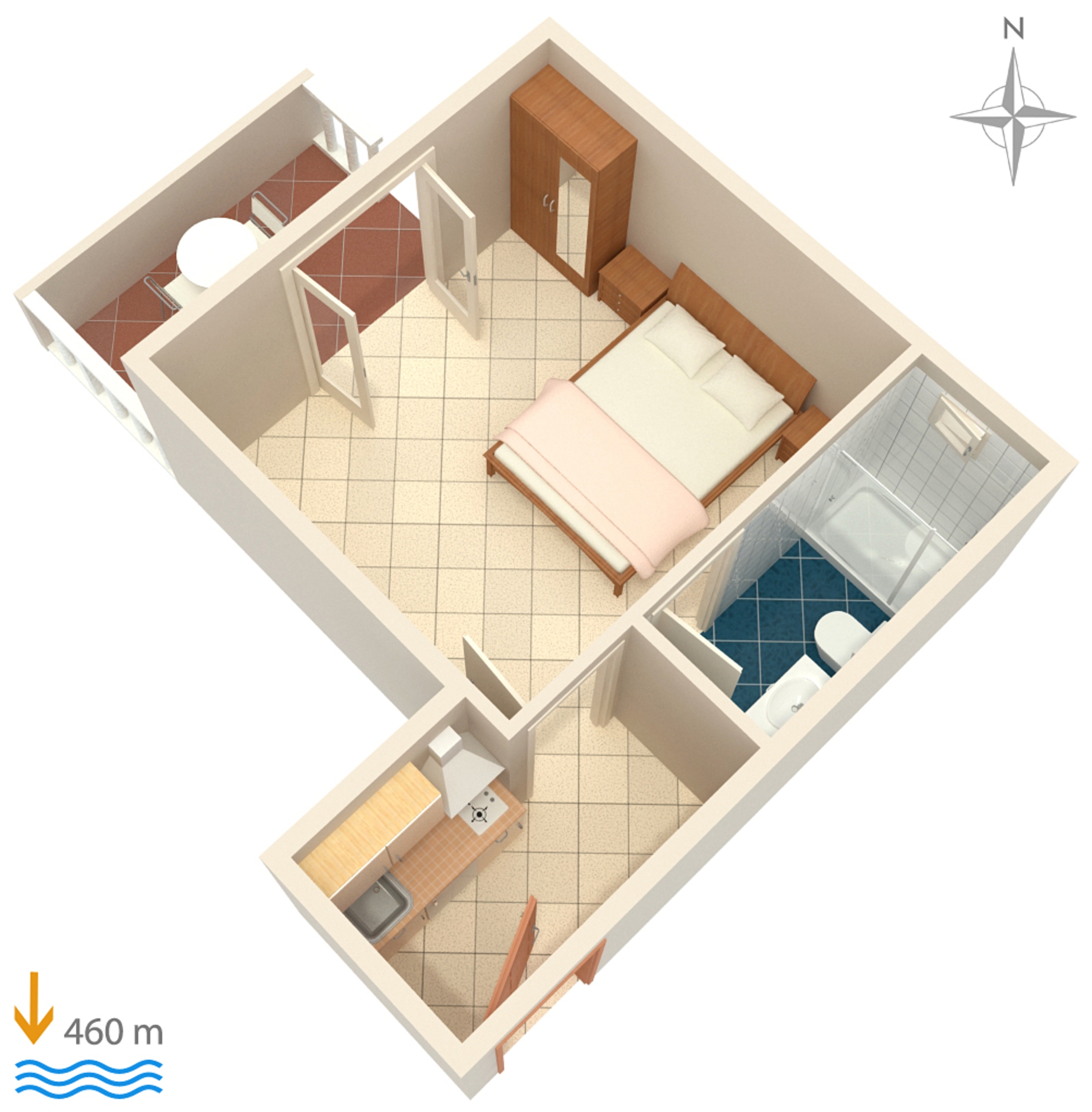 Studio może przyjąć 2 gości. Łóżka znajdują się w sypialniach, których jest 1, na powierzchni 17m2. Goście mają dostęp do tarasu, by korzystać z ciepłych, letnich wieczorów. Możliwość przygotowywania posiłków poprzez korzystanie ze wspólnego grilla. WLICZONE W CENĘ: taksa pobytowa, sprzątanie końcowe, klimatyzacja, parking, internet, łóżeczko dziecięce, przenośny grill. OBOWIĄZKOWE KOSZTY DODATKOWE: dopłata za krótki termin (procent dopłaty w zalezności od liczby noclegów: 30% - 1, 20% - 2, 10% - 3). Dostępność dodatkowych usług w rezerwowanym terminie oraz ich cenę (jeśli nie jest podana) należy sprawdzić wcześniej. Za dodatowe usługi, które nie zostały uwzględnione w kalkulacji ceny, płaci się bezpośrednio właścicielowi obiektu, pod warunkiem śe gość korzysta z tych usług.